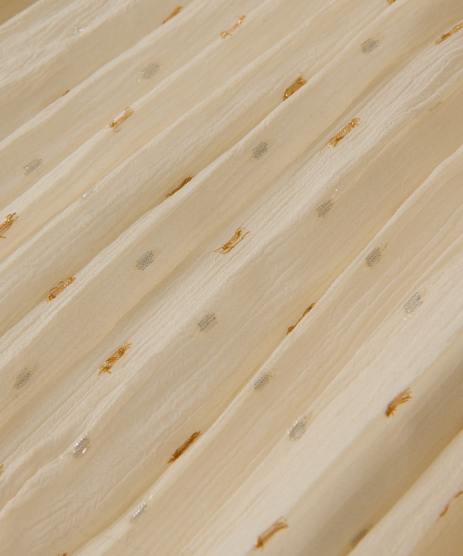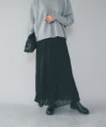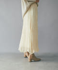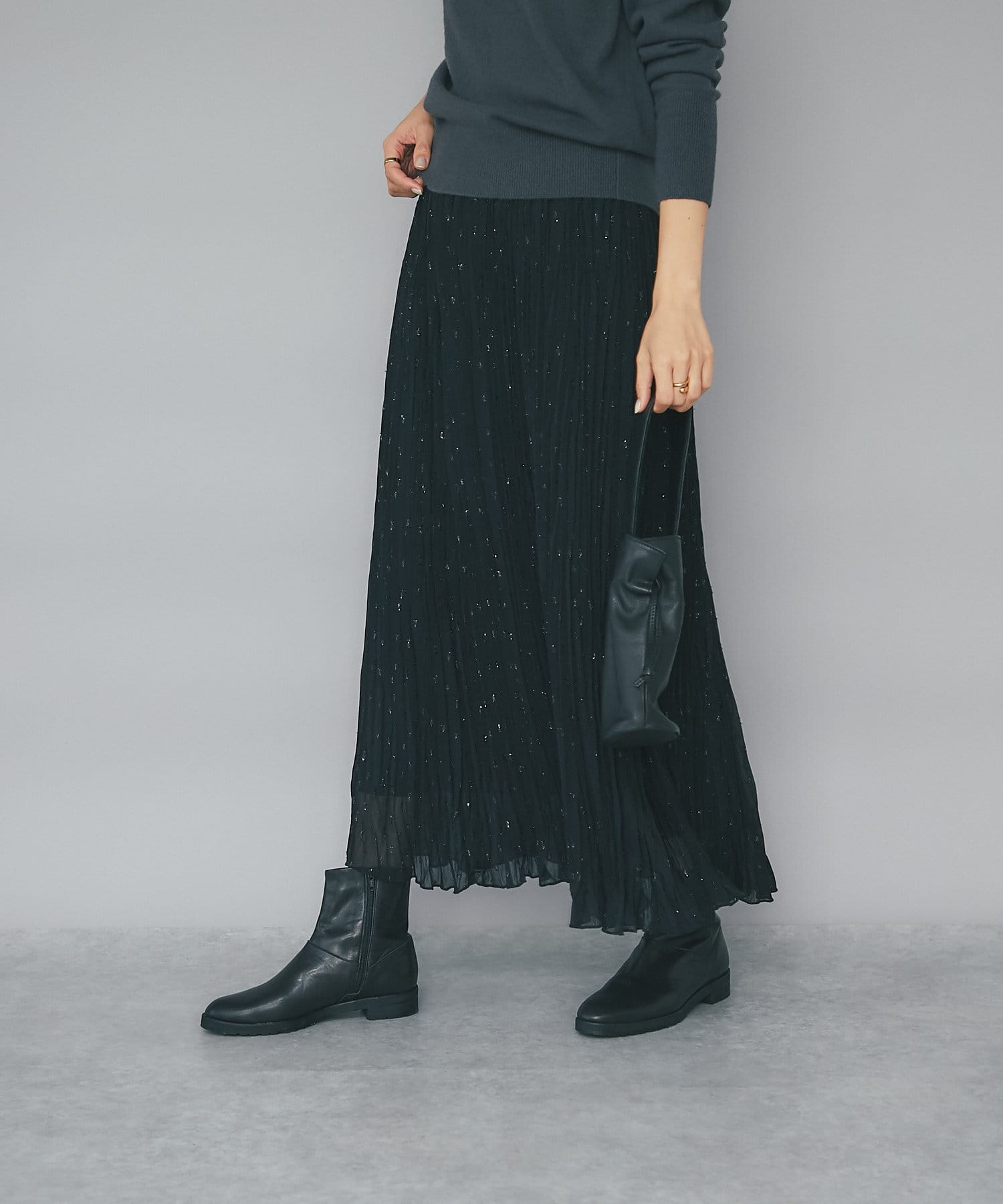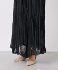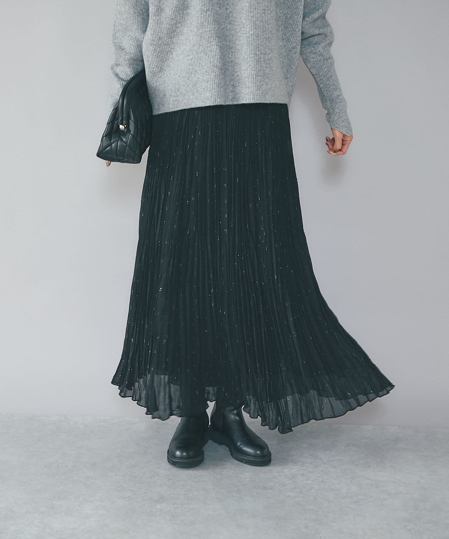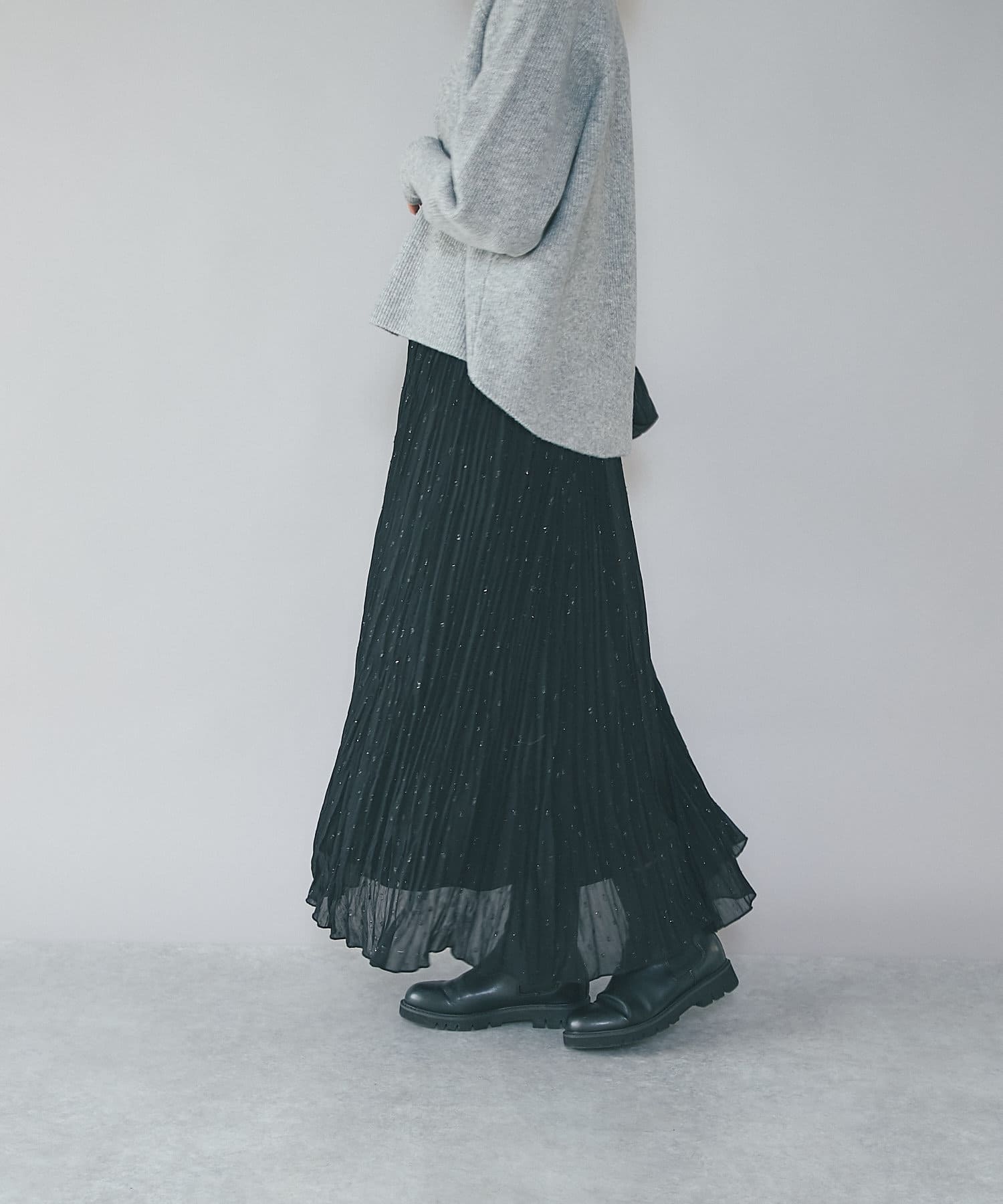 キラキラ輝くラメ糸が織り込まれた着映えスカート。                                                                                                        シアー素材全体にワッシャープリーツを施したリラックスムードと華やかさを兼ねたデザインで、幅広いスタイルにマッチする1枚です。