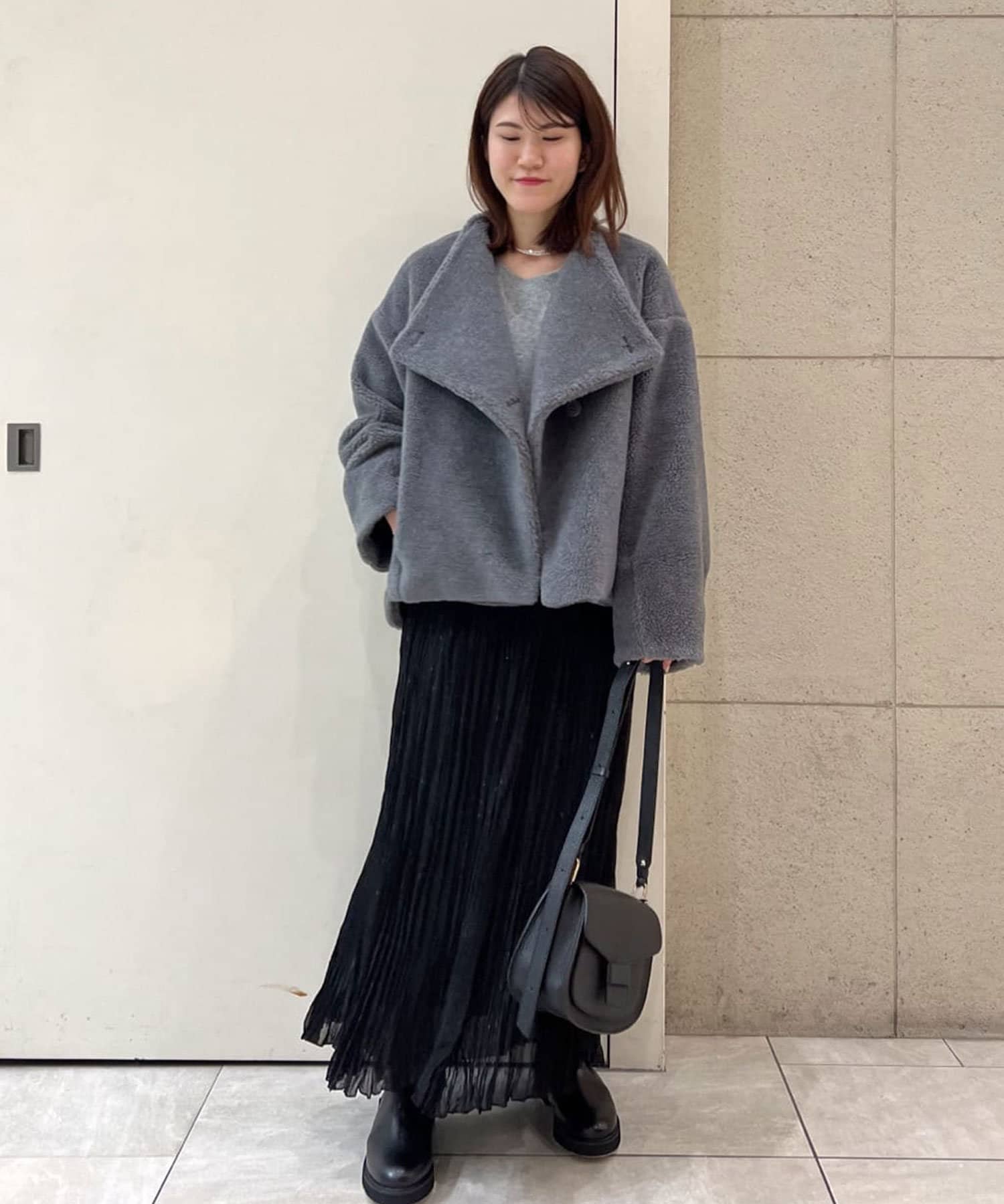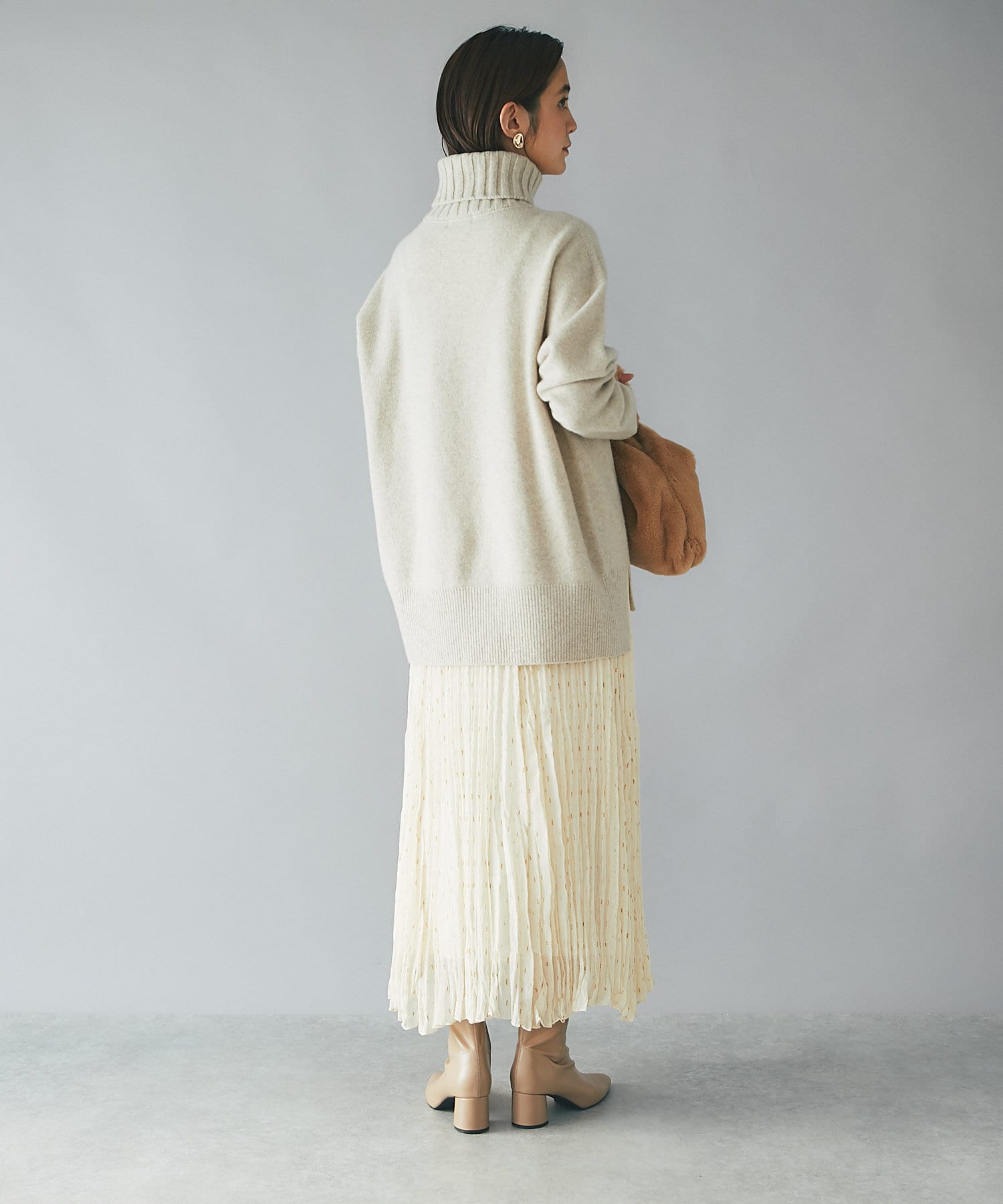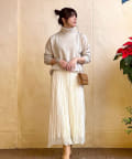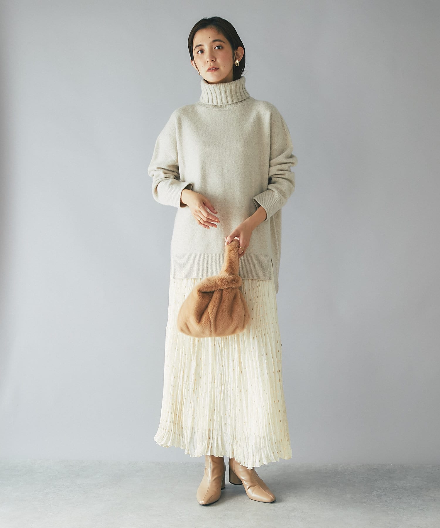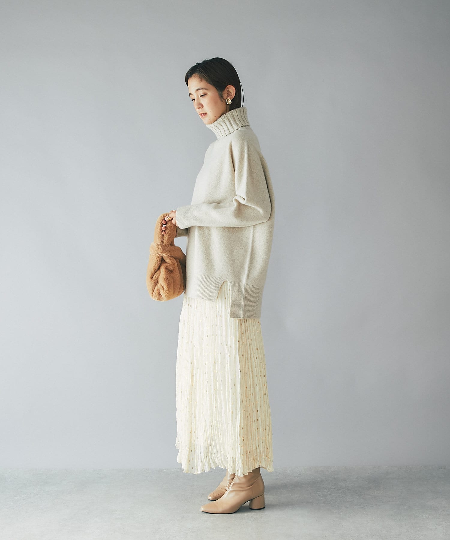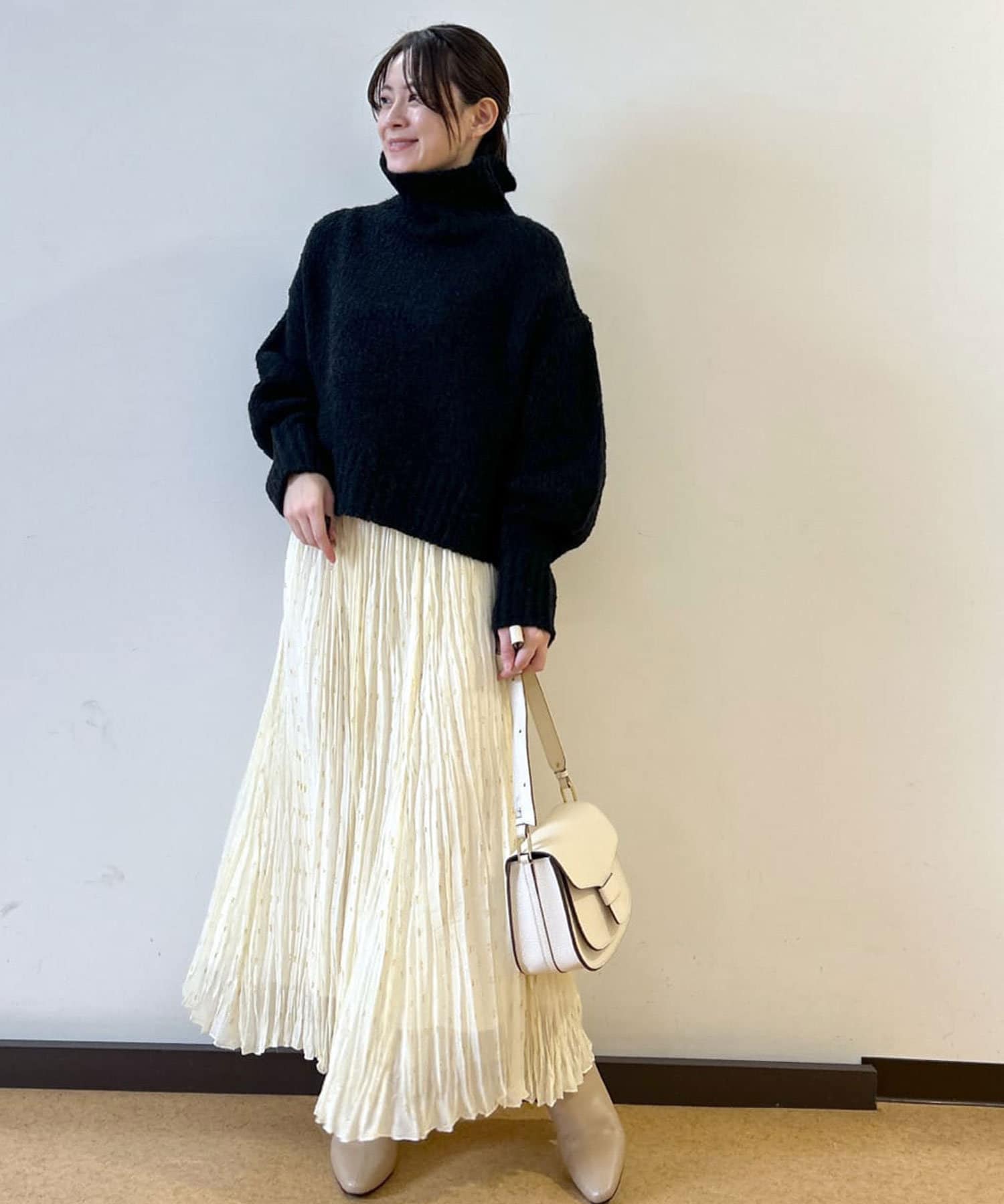 今季らしい重めなニット素材を合わせたバランスがトレンドライクに着こなせるポイントです。