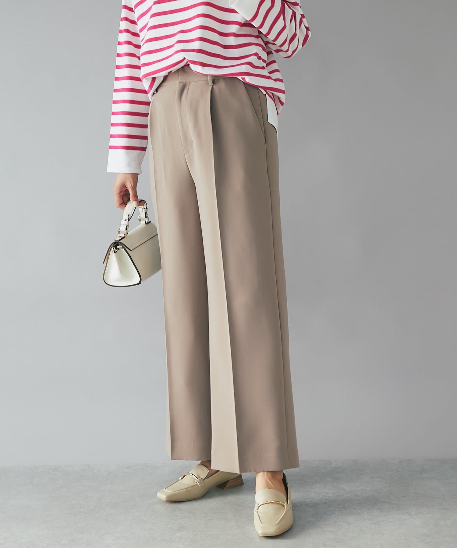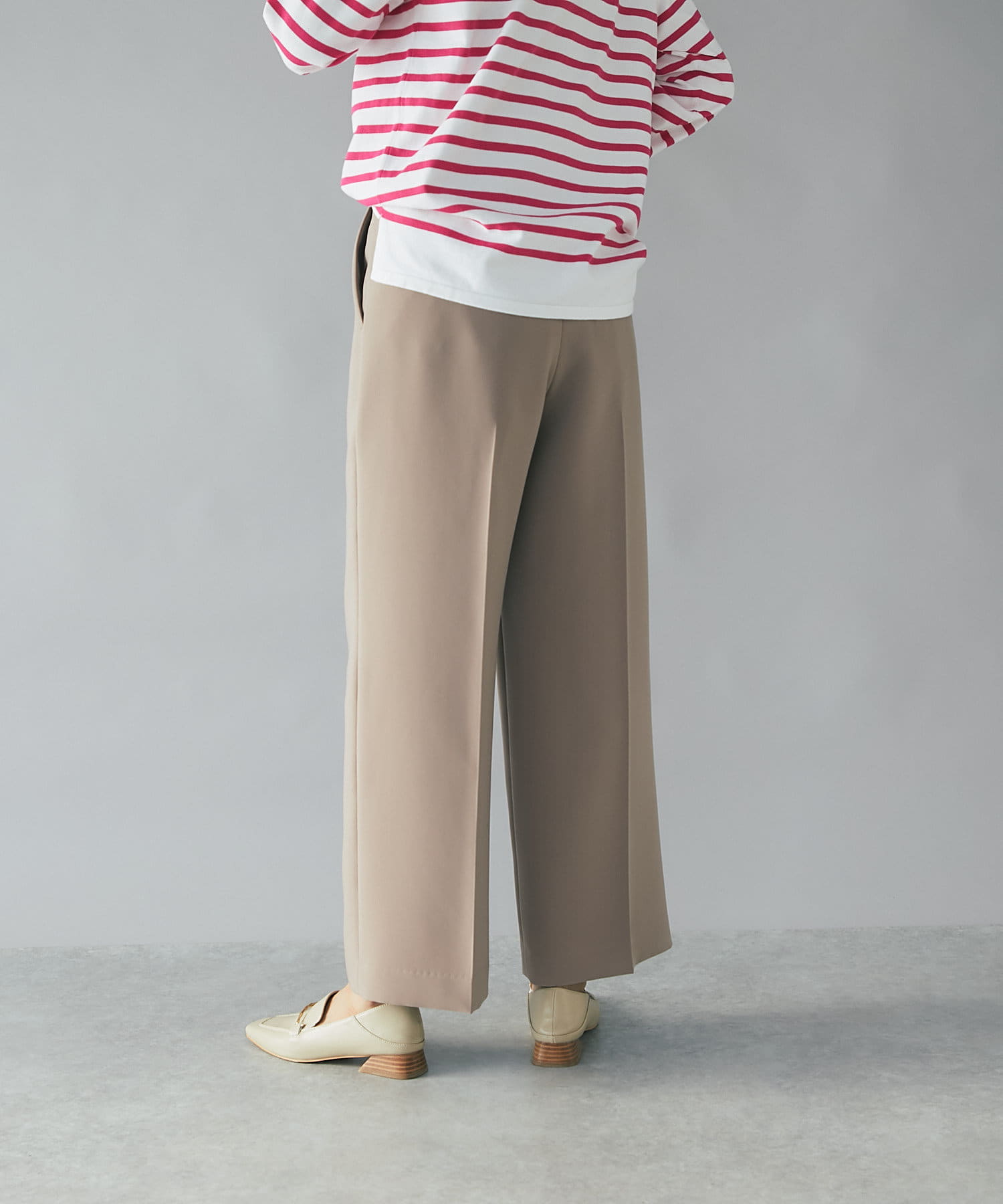 センタープレスを施し、ボリュームを抑えたすっきりしたワイドパンツで、トップスはコンパクトなものからオーバーサイズなものまで選ばず合わせられるので着回しが効くのも嬉しいポイント。