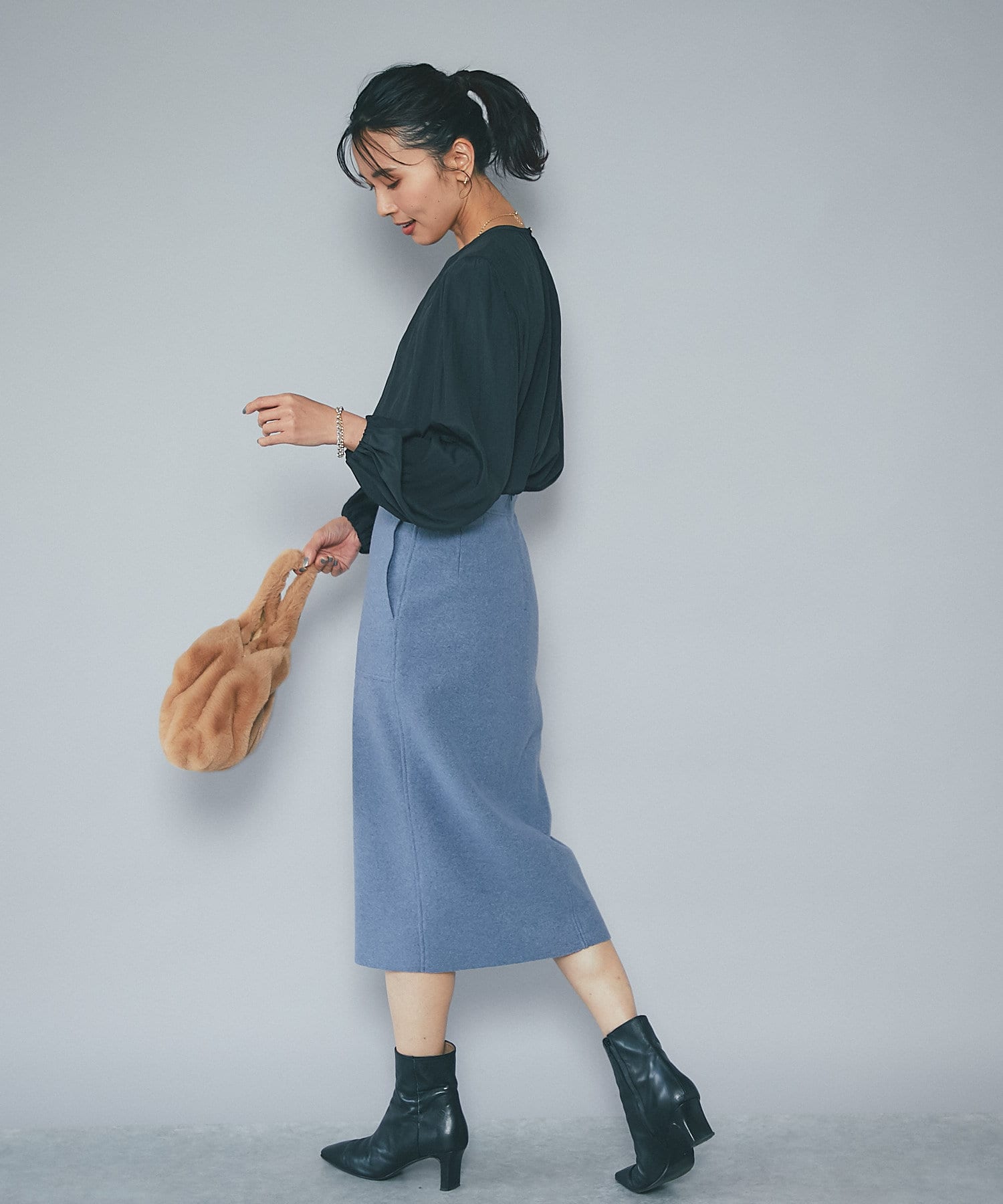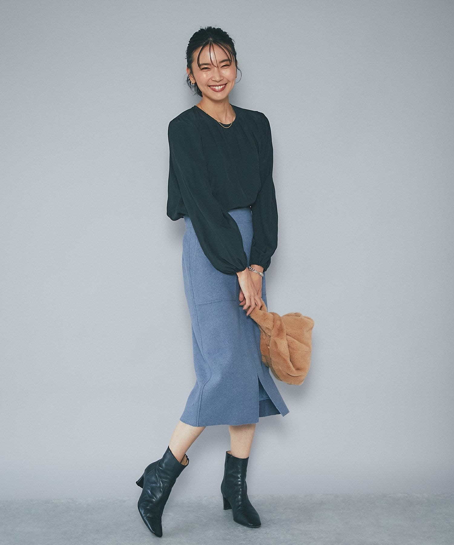 タイトスカートやテーパードパンツなどでスマートなシルエットのアイテムで合わせて頂くと、女性らしく上品なオフィススタイルにオススメ。