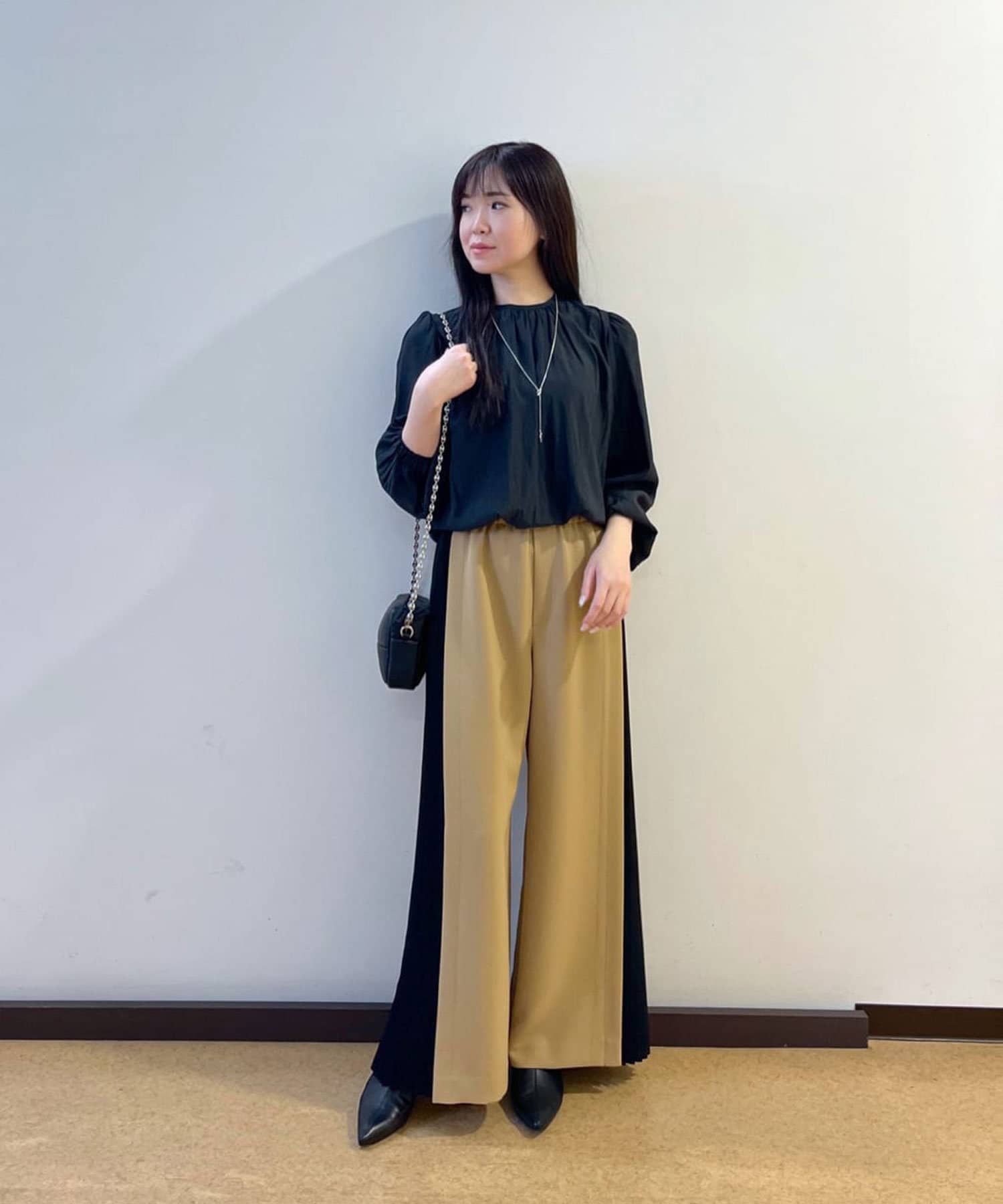 薄手シャカシャカ生地のブラウスです。スカート、パンツどちらにも合わせやすく、これ一枚でシックな着こなしになります。