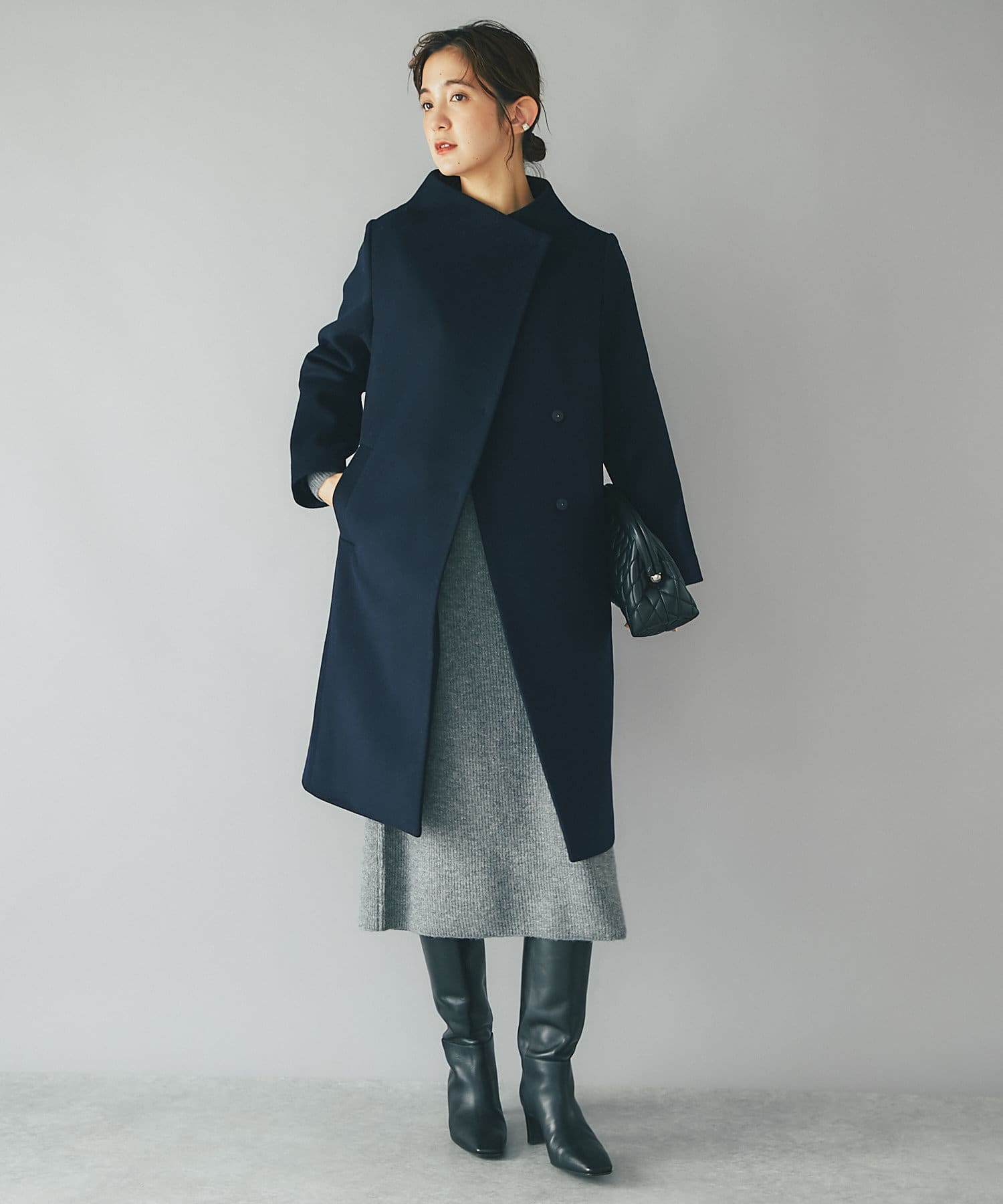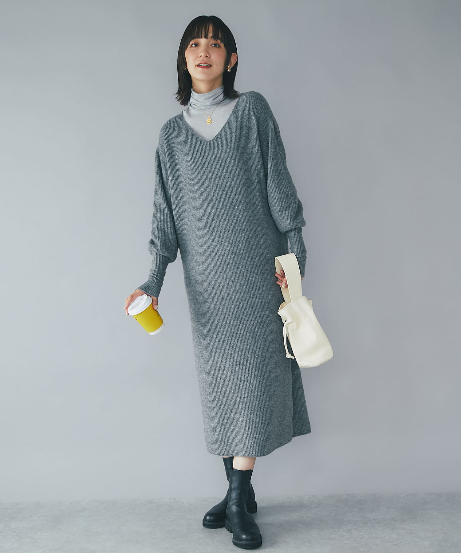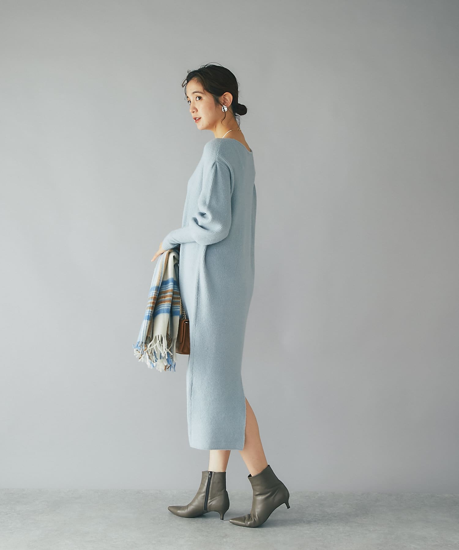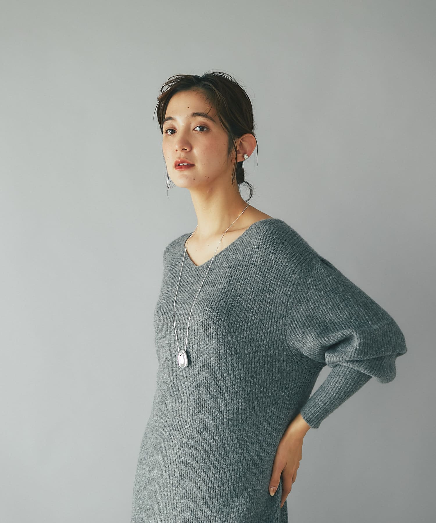 デザイナーの推しカラーは今季トレンドのグレー。アクセサリーの質感次第でフェミニンにもモードにもこなせるのでぜひ押さえていただきたいカラーです。