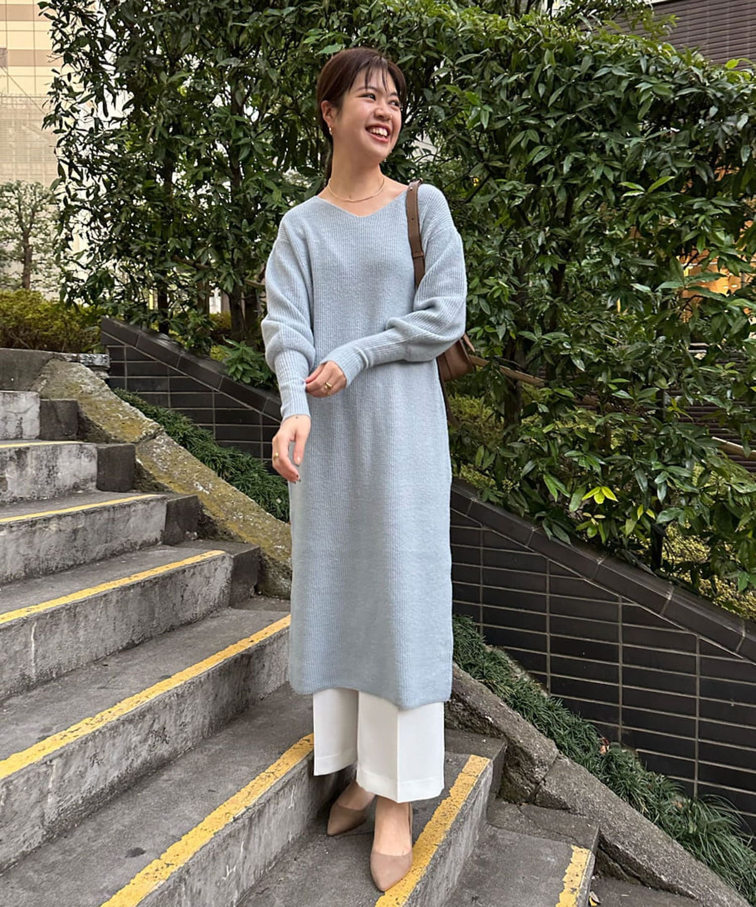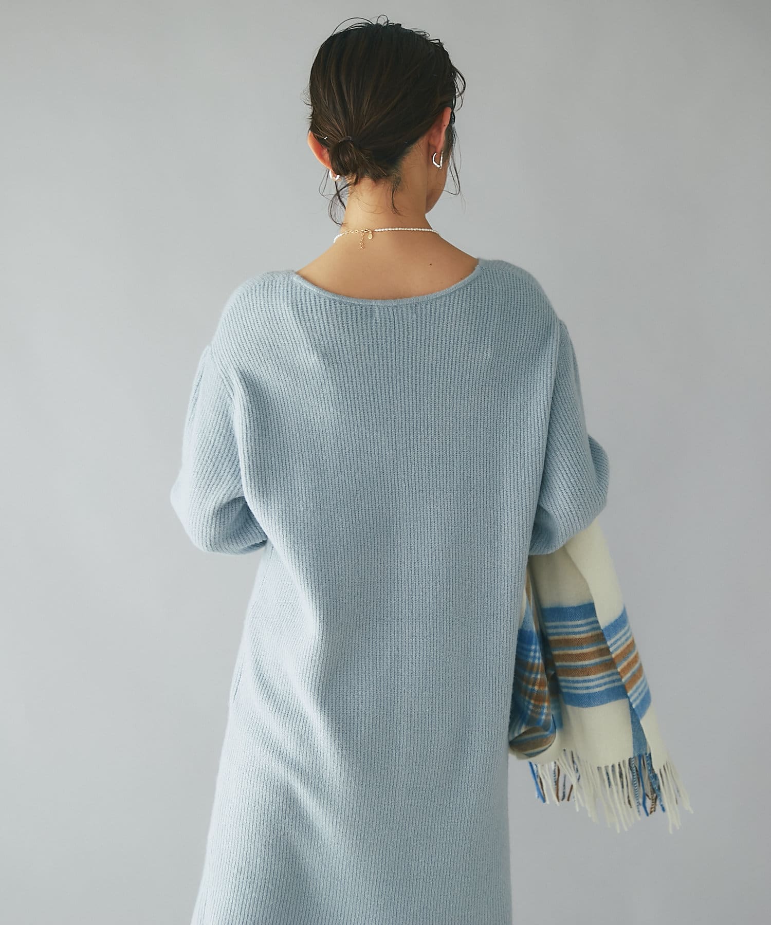 また、やさしく上品さを引き立てるサックスブルーはコートインナーにも映える一枚。