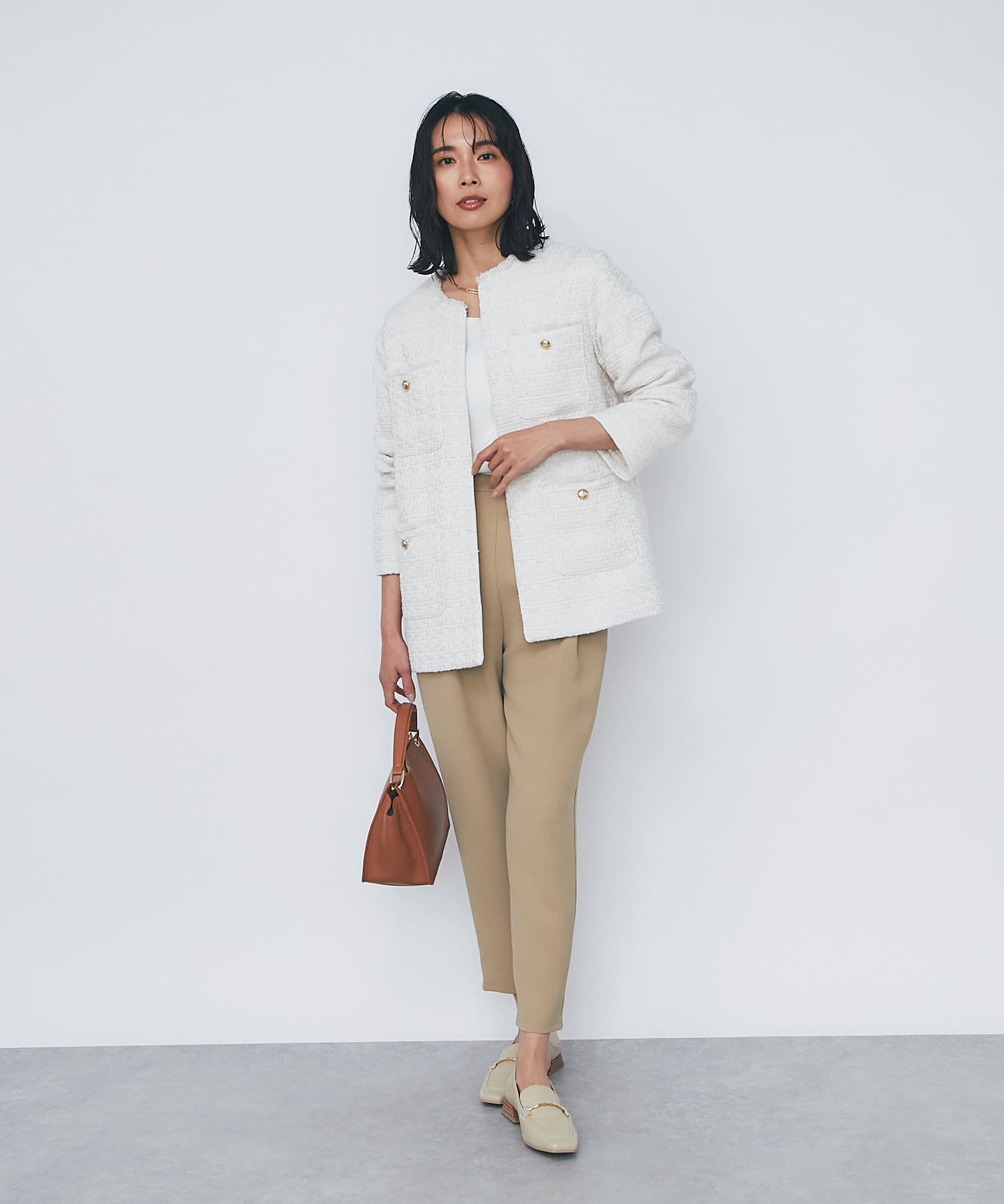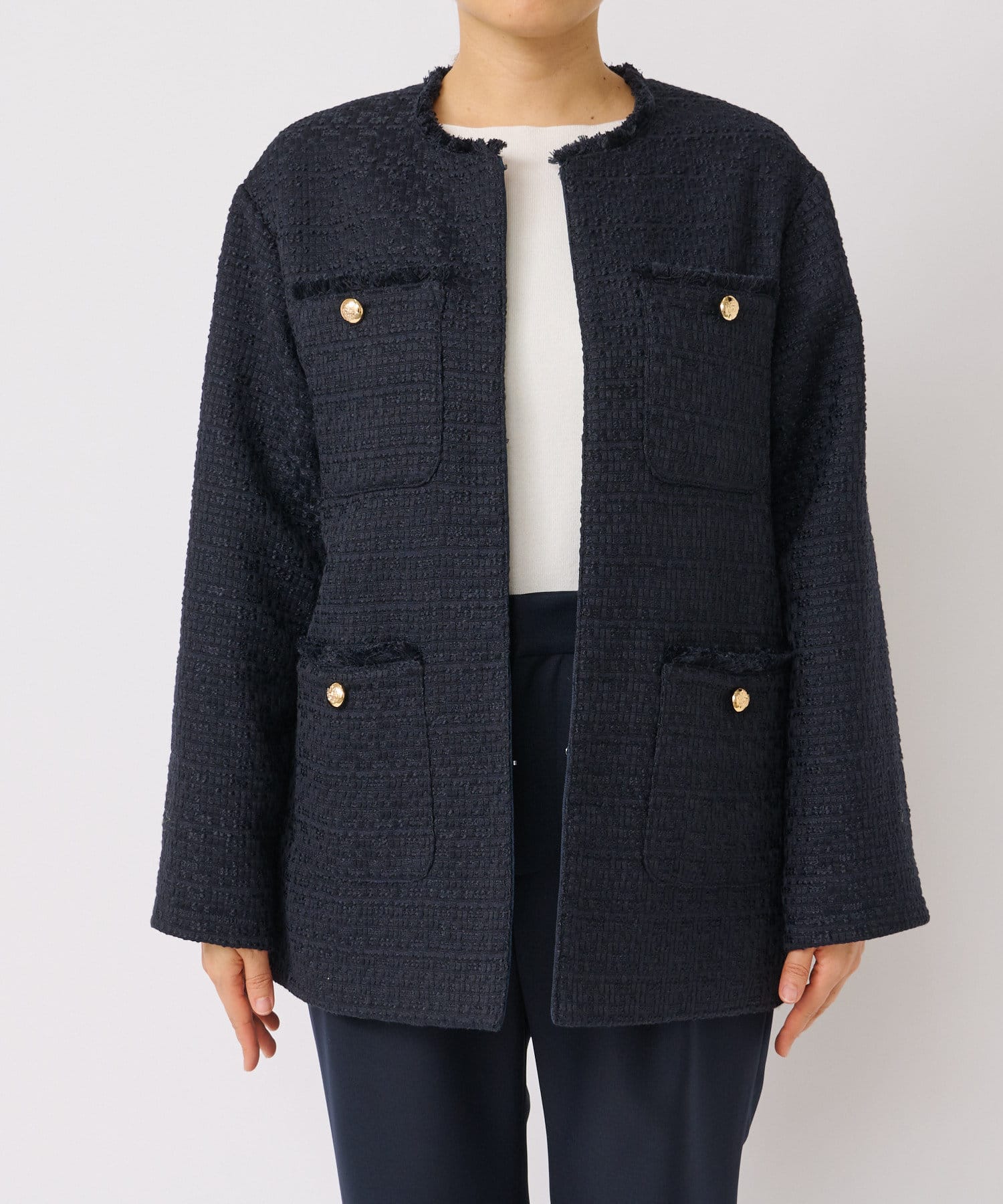予約【WEB限定/トレンド感と上品さのバランスが◎】ツイードノーカラージャケット