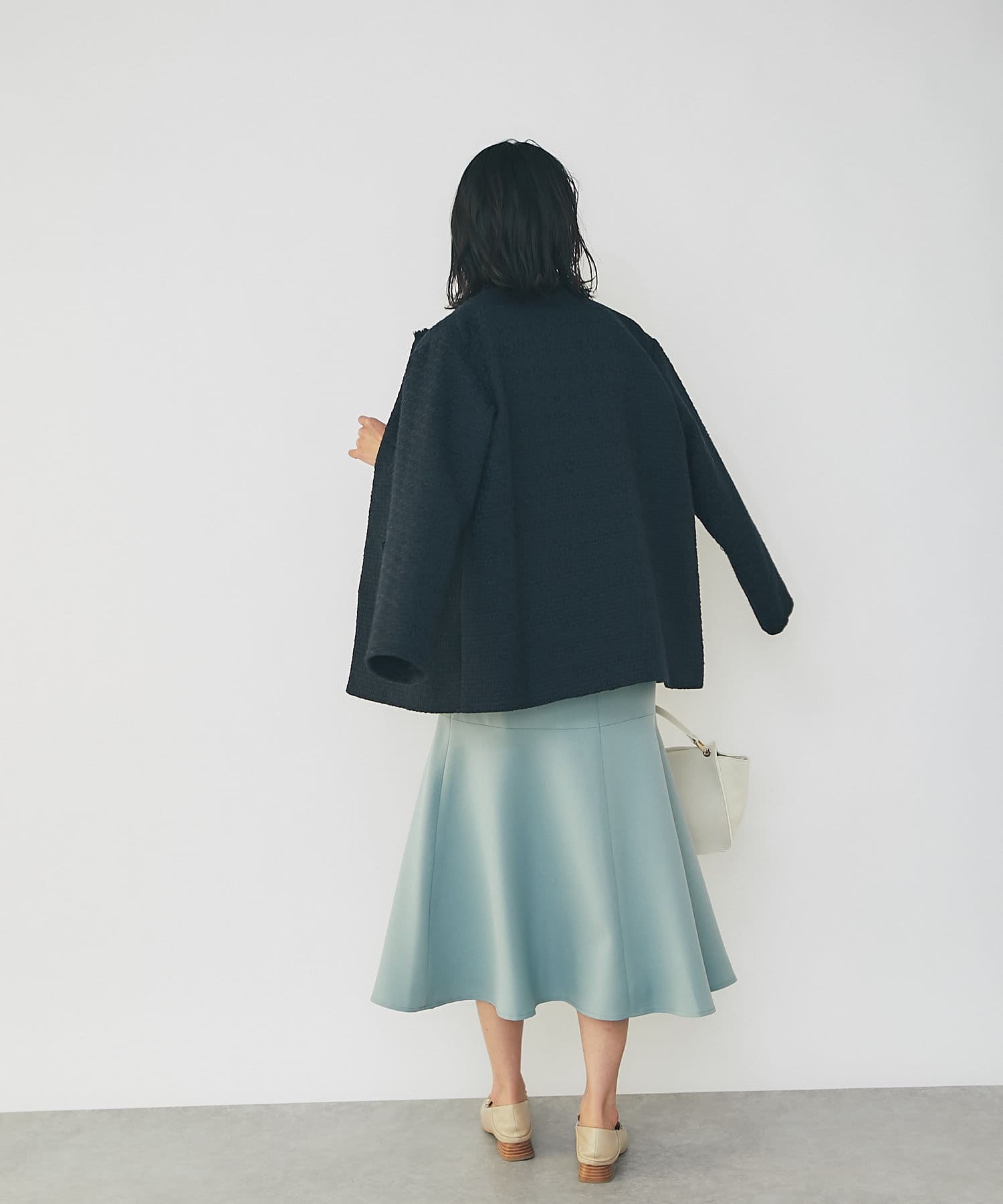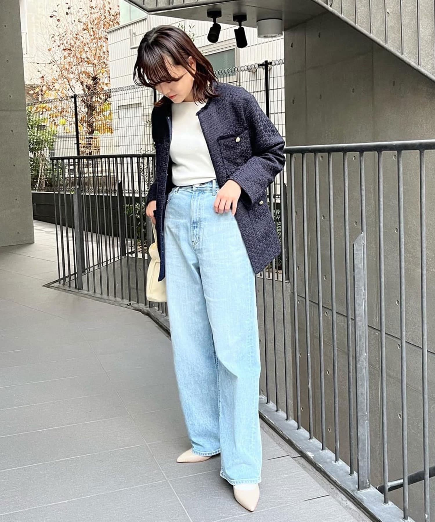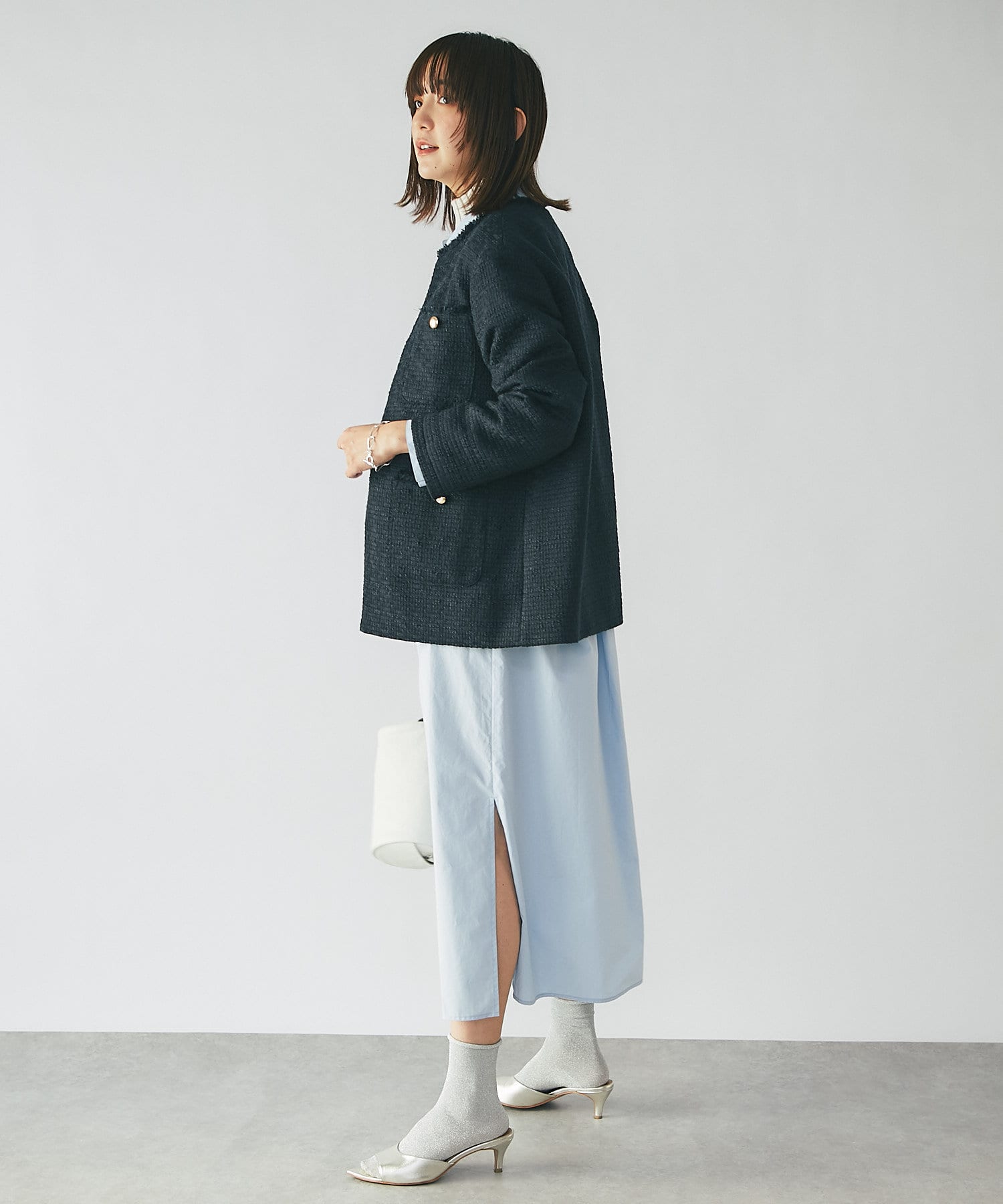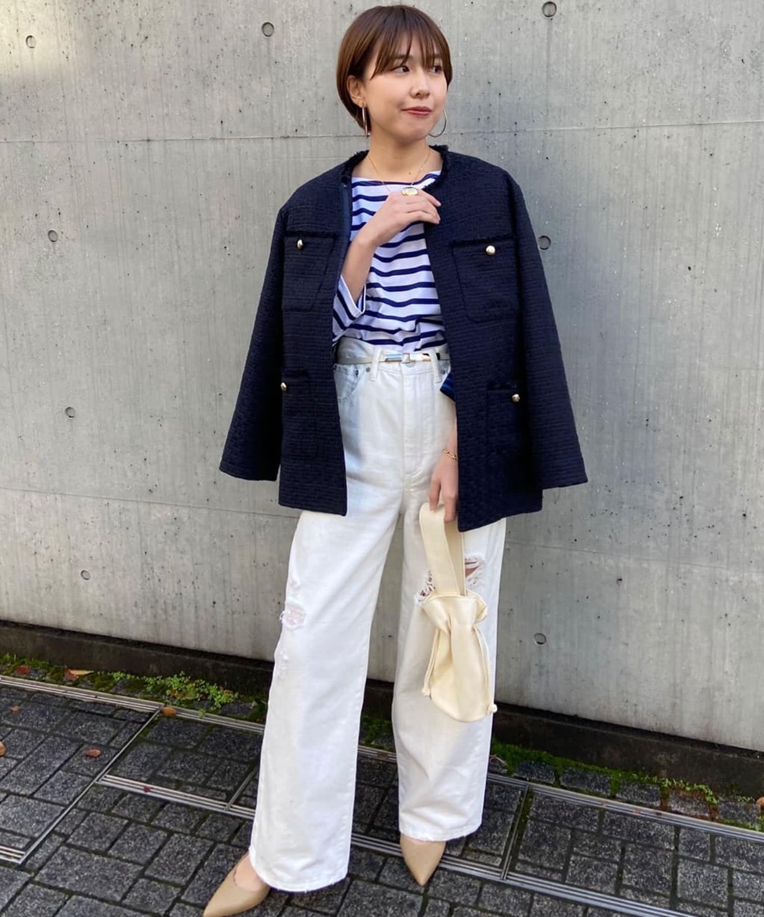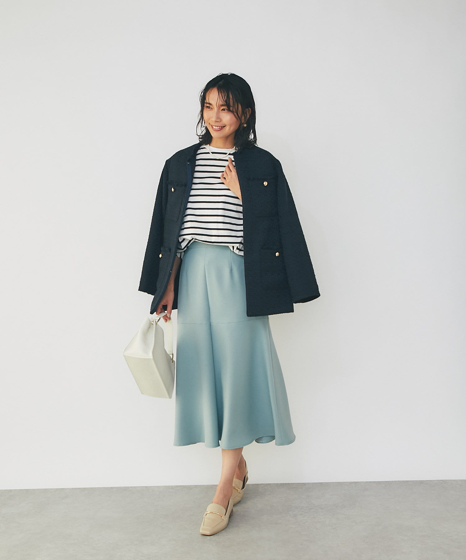 軽やかなホワイト&定番で使えるネイビーのツイード素材が程よく品の良さを引き立て、オンオフ兼用で使えるアイテムとなっております。