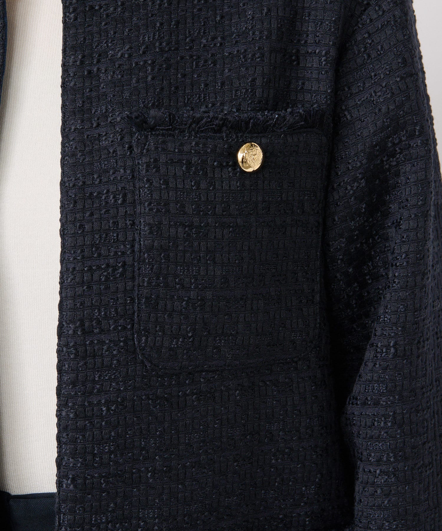 ⇒ツイードフリンジジャケットの方は素材にウールが23%含まれており、より立体的で温かみのある素材です。その他にも金ボタンの材質がツイードフリンジジャケットはマット調であるのに対して、本品は柄入りで光沢感のあるボタンとなっております。全体的なサイズ感は大きな違いはありませんが、本品のほうが少しコンパクトな作りです。
