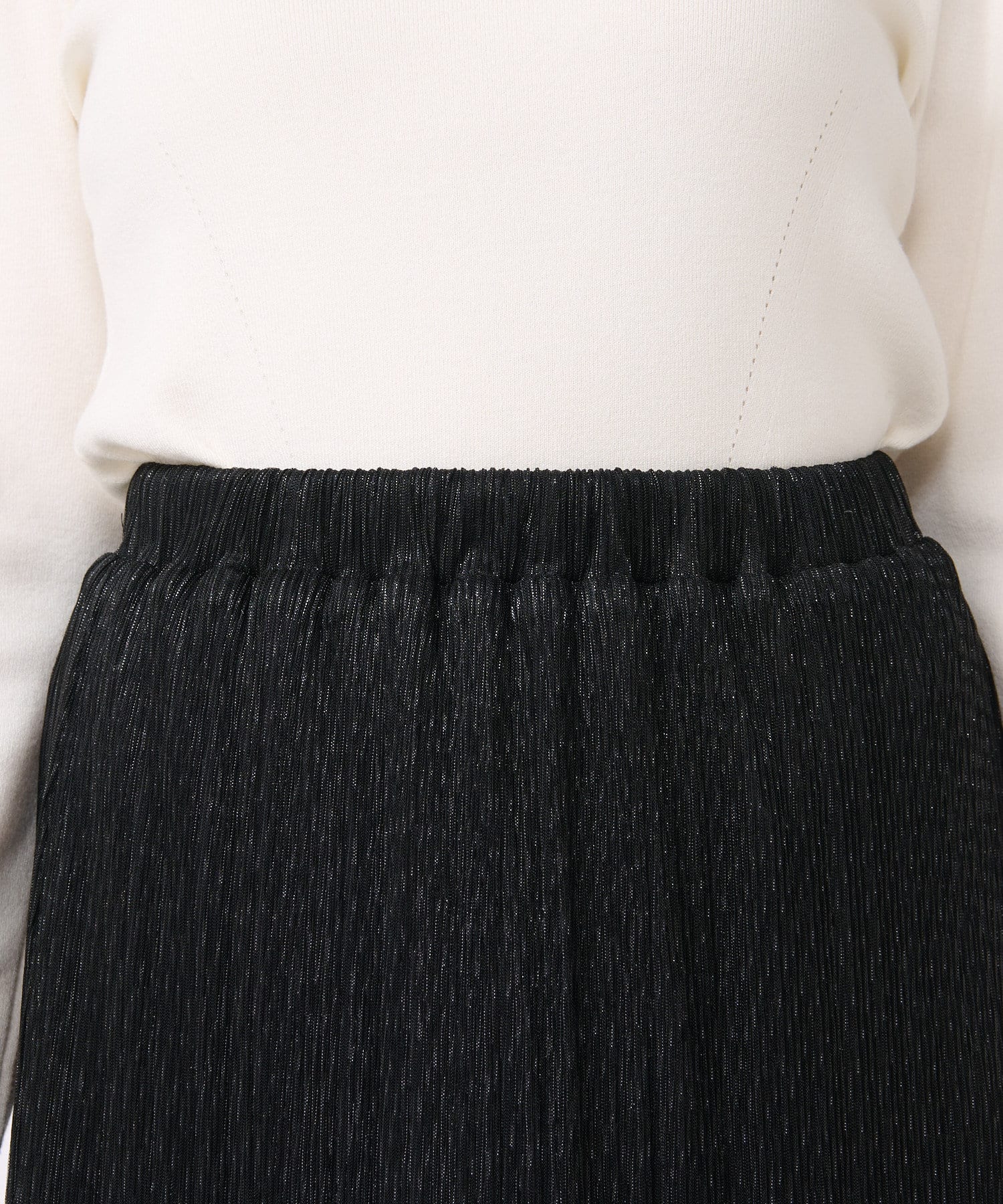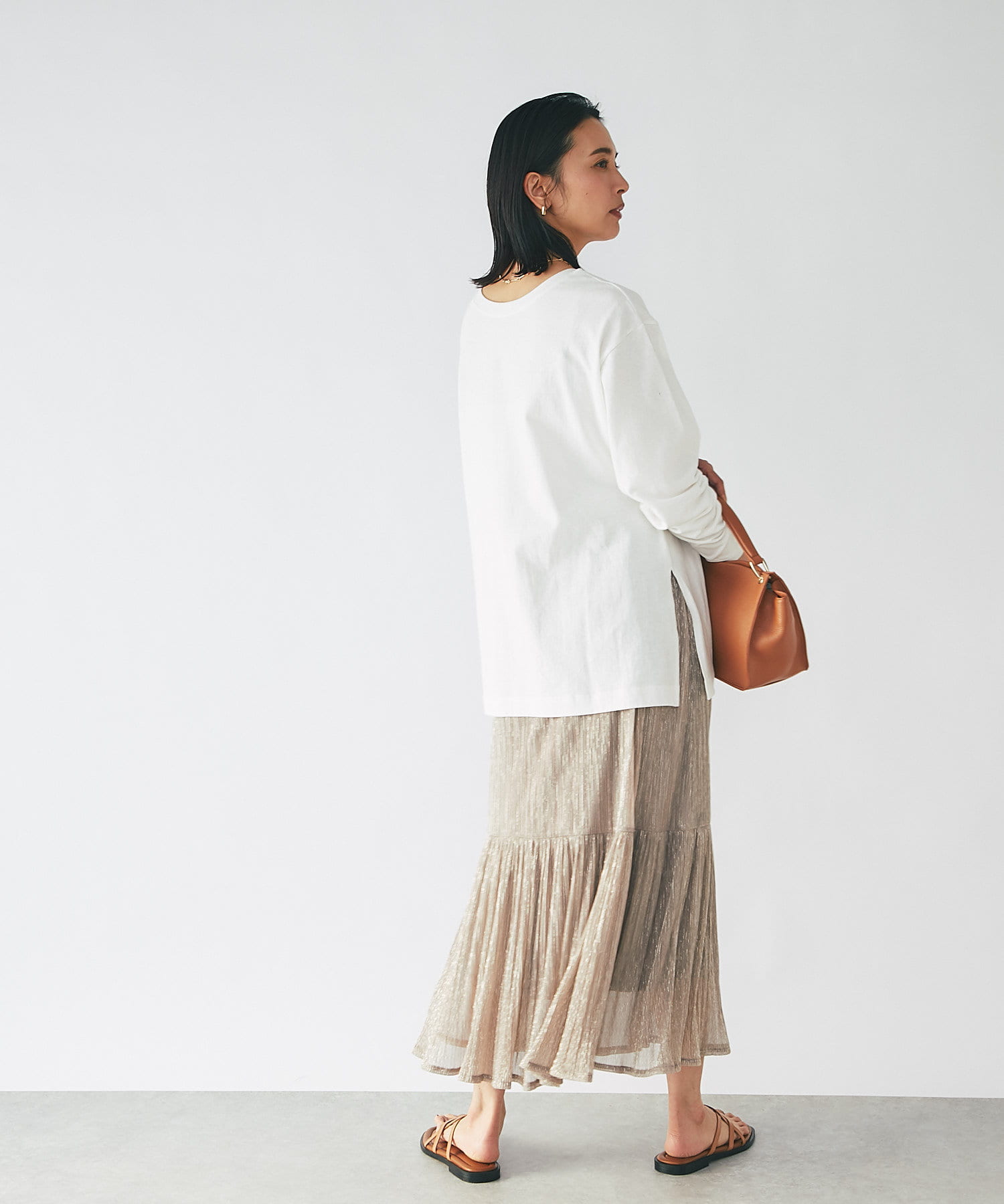 カジュアルな雰囲気のTシャツやカットソー、ナチュラルな風合いのニットも、ラメスカートと合わせるとカジュアルダウンしすぎずきれいにまとまります。