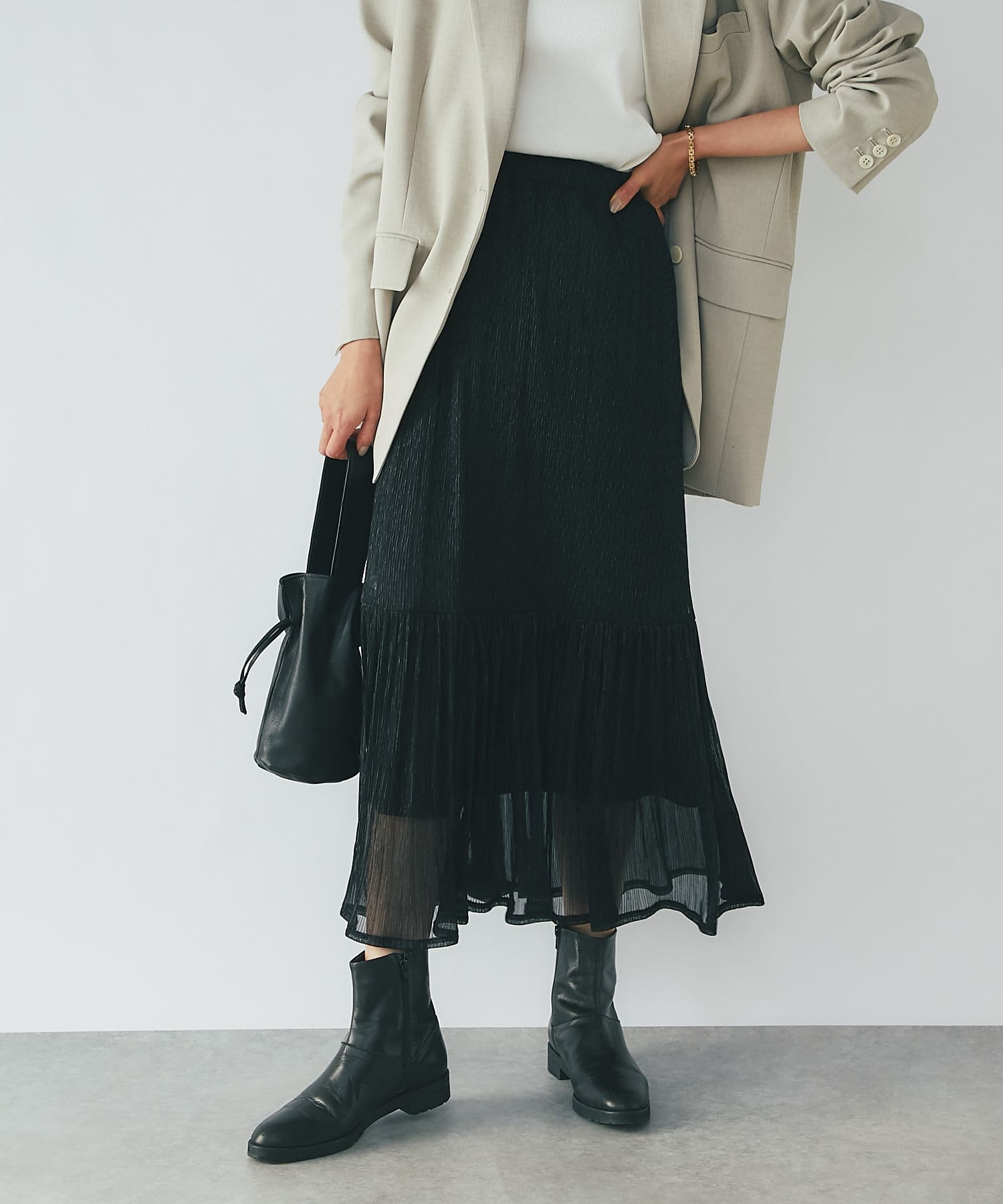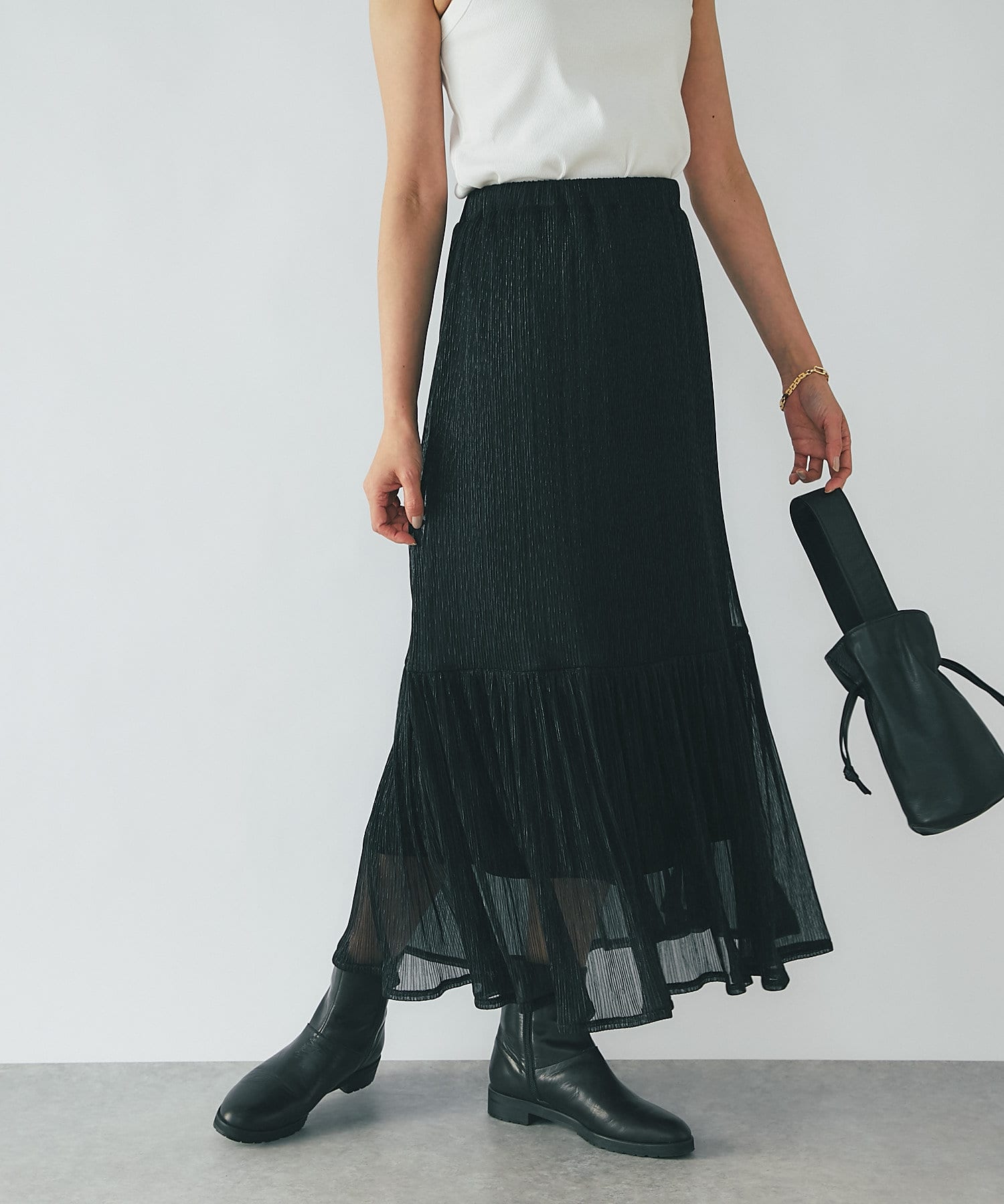 程よく透け感のある生地で、ロング丈でも足元が重くなりすぎません。