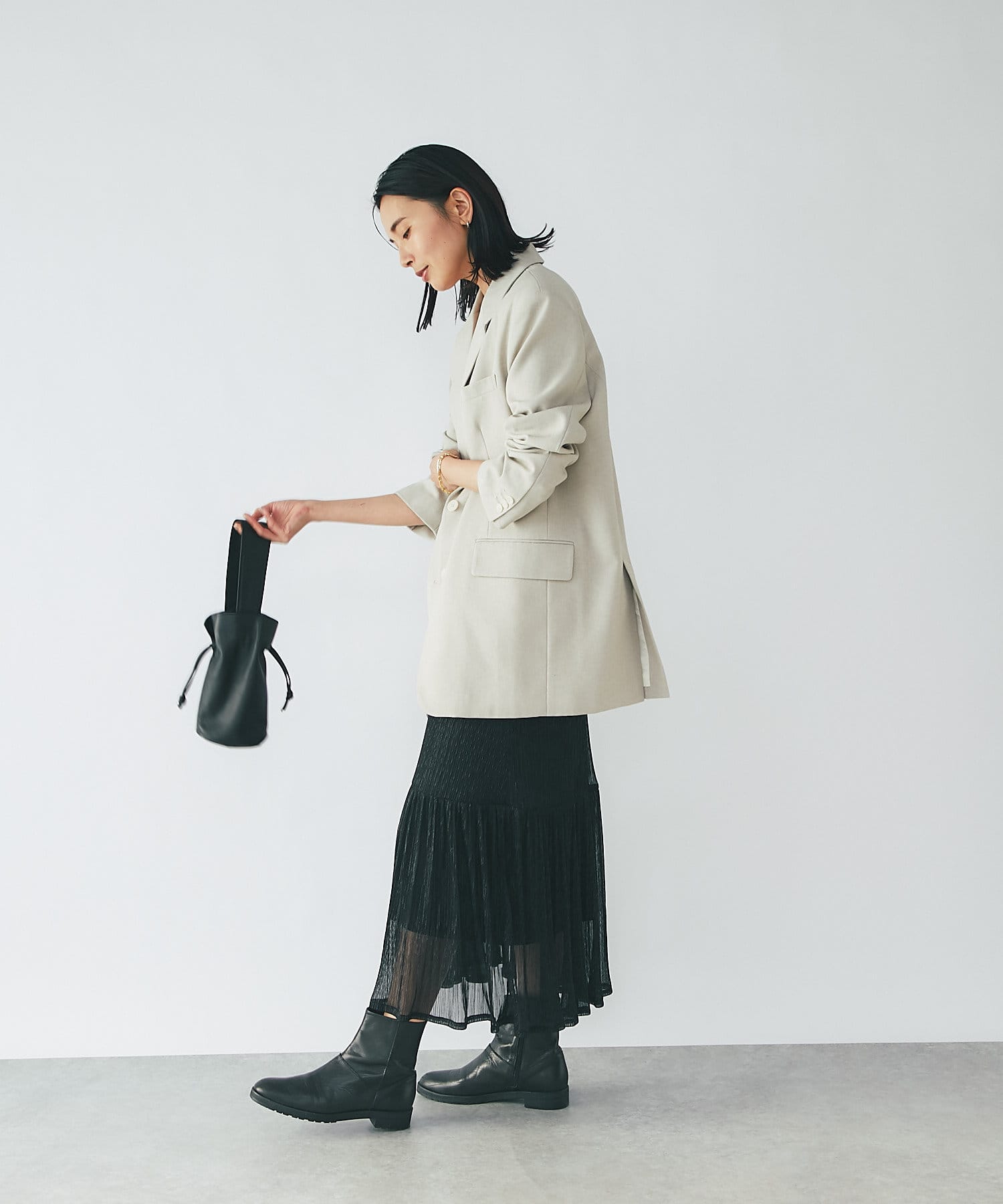 ①トップスにブラックを持ってきて印象を引き締める。