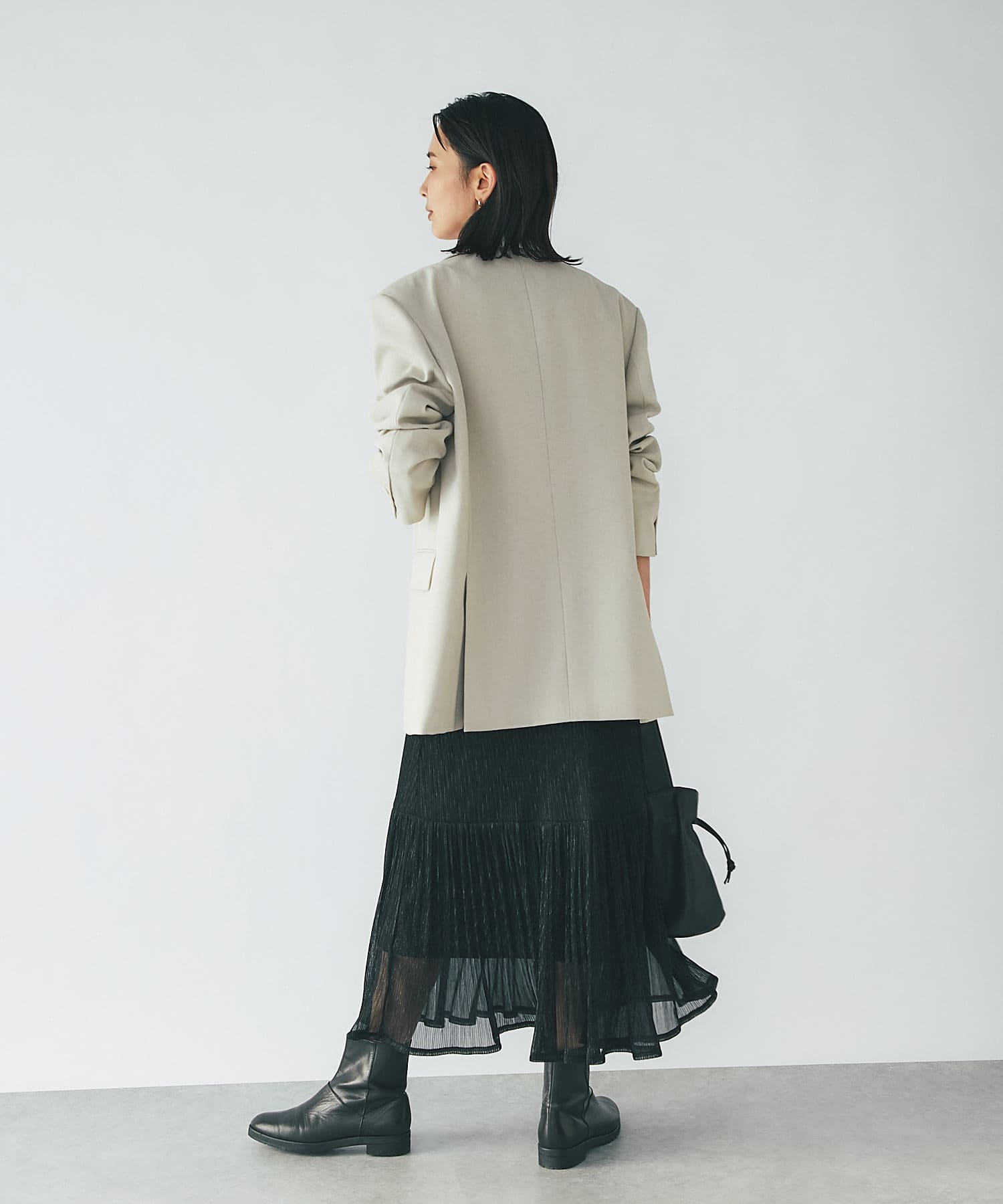 楽ちんなのに華やかなアイテムなので、素材感の違うアイテムと組み合わせてバランスを整えるのがおすすめ。