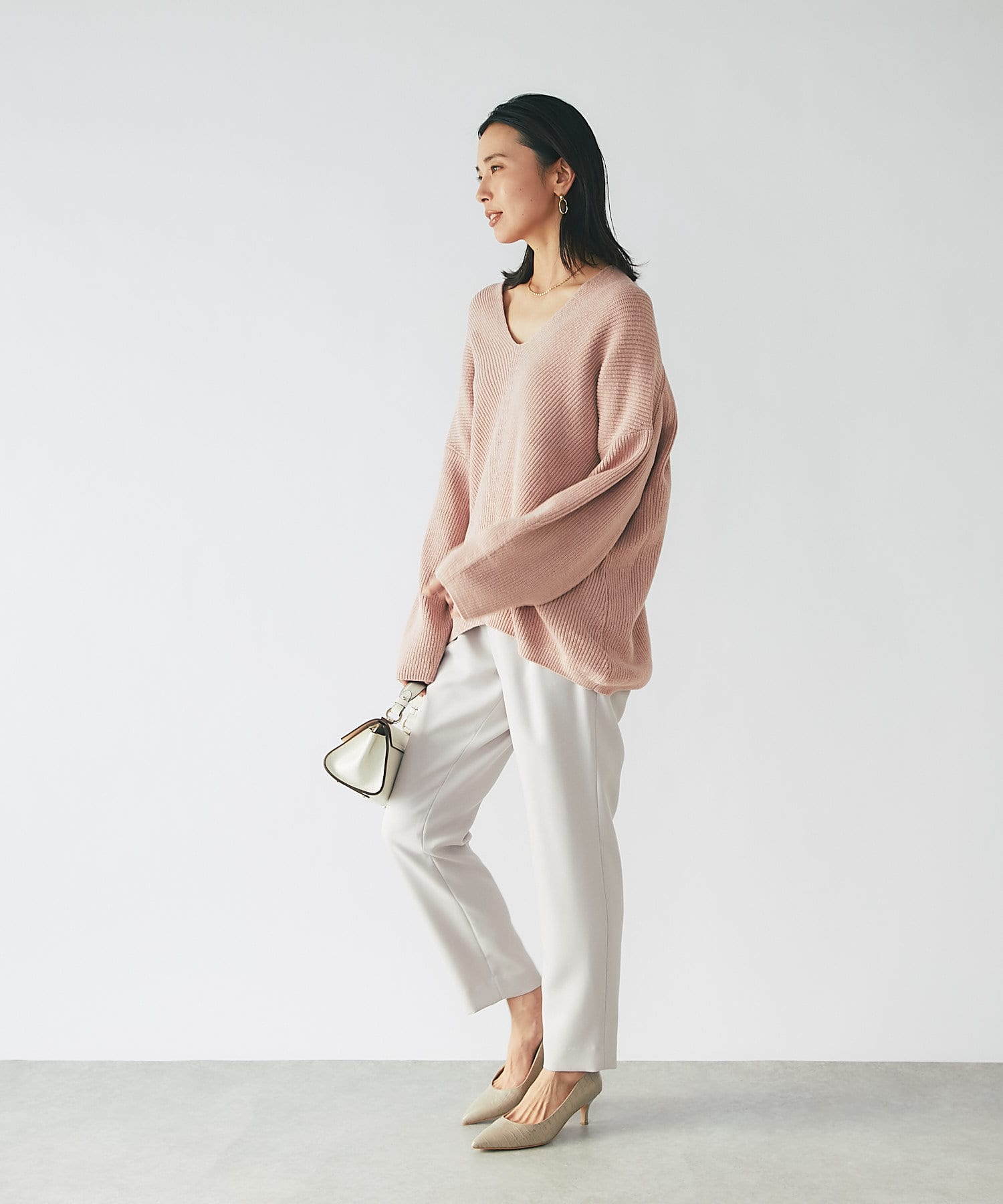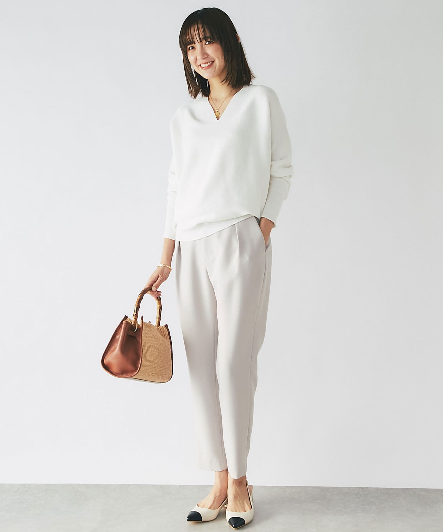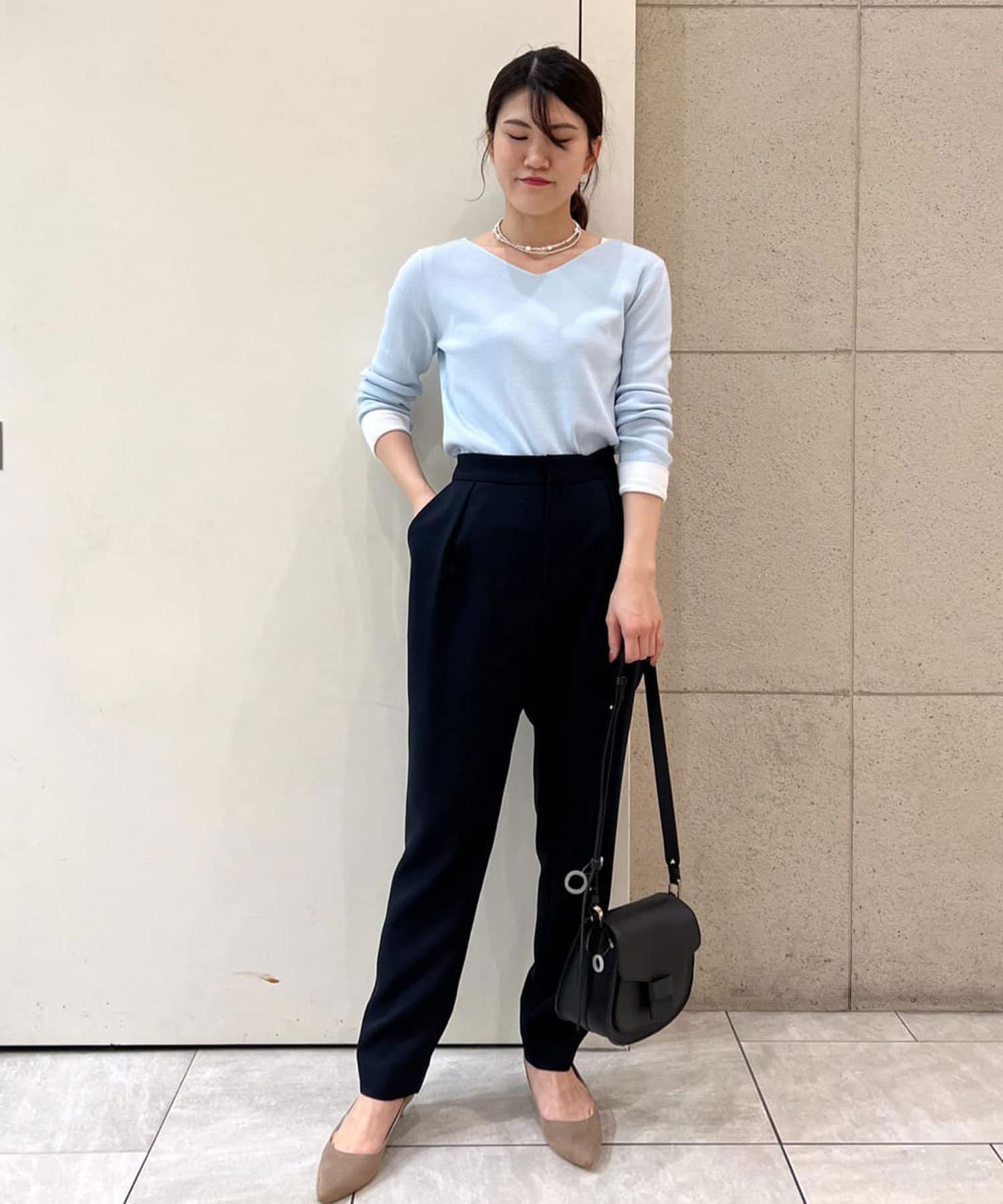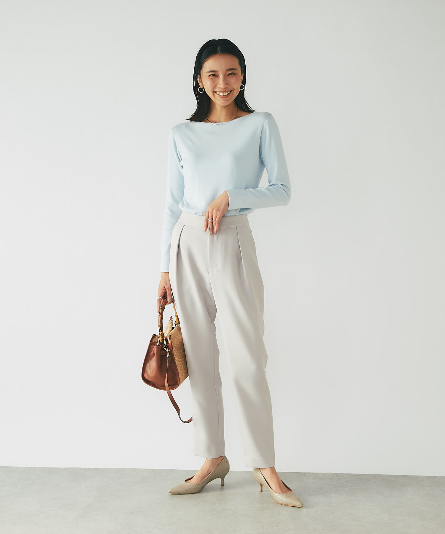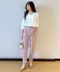 コンパクトなニットや、とろみブラウスなどで上品な綺麗め合わせもオススメ。