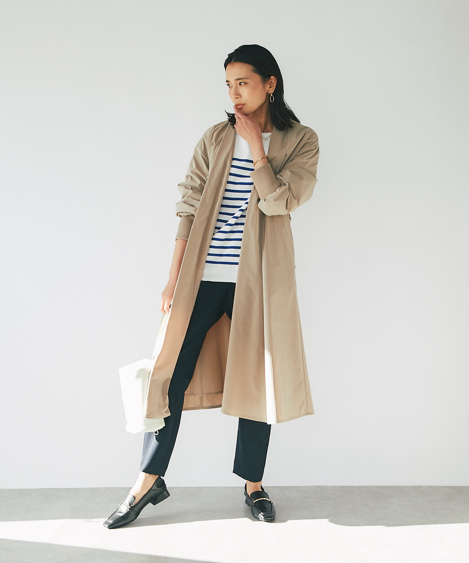 ベーシックなデザイン、シルエットだからこそ、定番カラーで揃え、トップス次第でオンオフ兼用で着用して頂けるのも魅力の一つ。