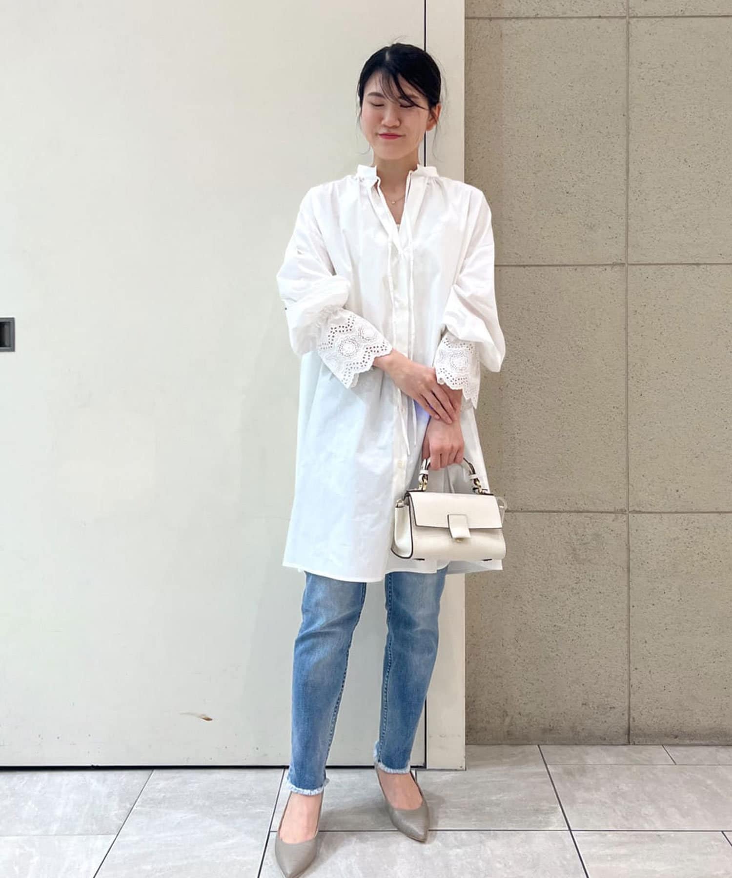 春夏は涼しげなシャツスタイルや華やかなフリルブラウスと合わせたり、ボーダーカットソーと合わせた大人カジュアルスタイルがおすすめです。通年履ける生地感なので、秋冬はニットと合わせたスタイルも◎
