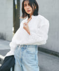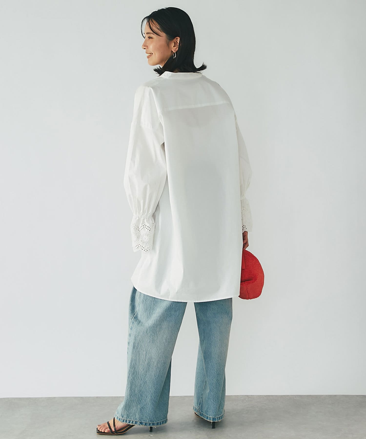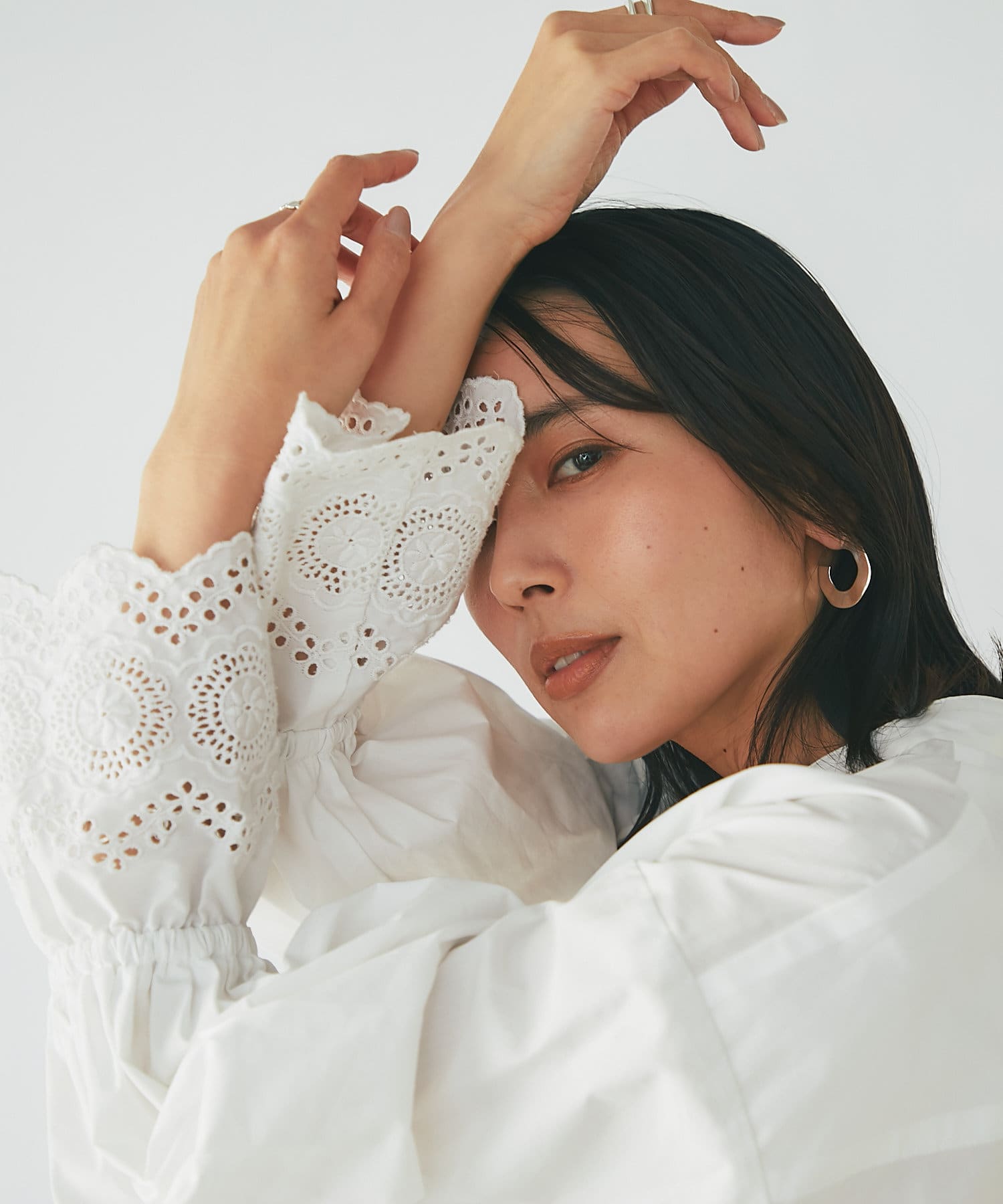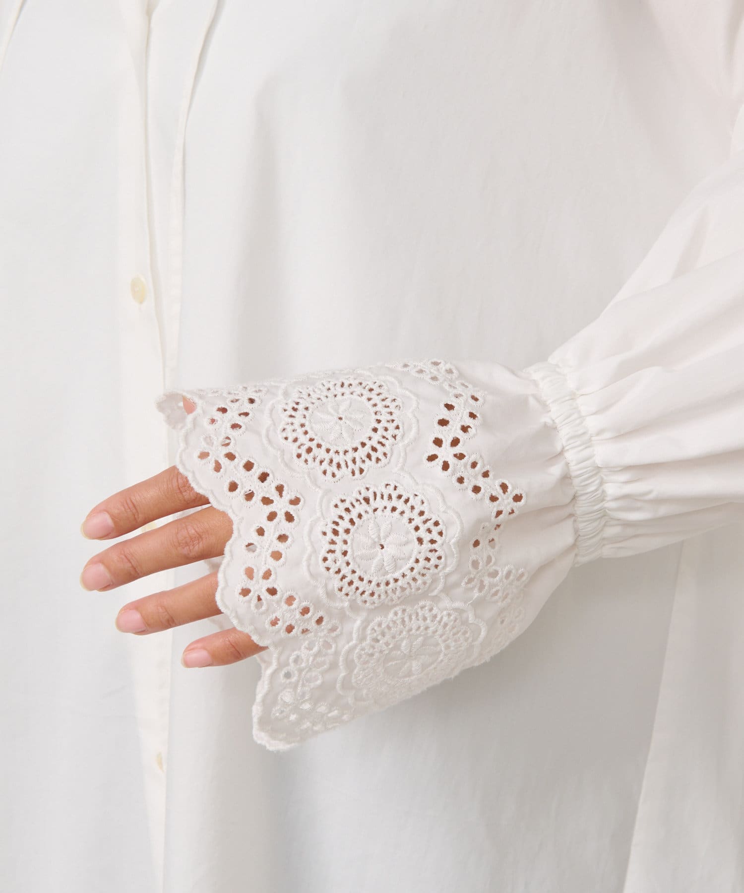 華やかなカットワーク刺繍のレースカフスがコーディネートに華やかさをプラスしてくれるブラウス。