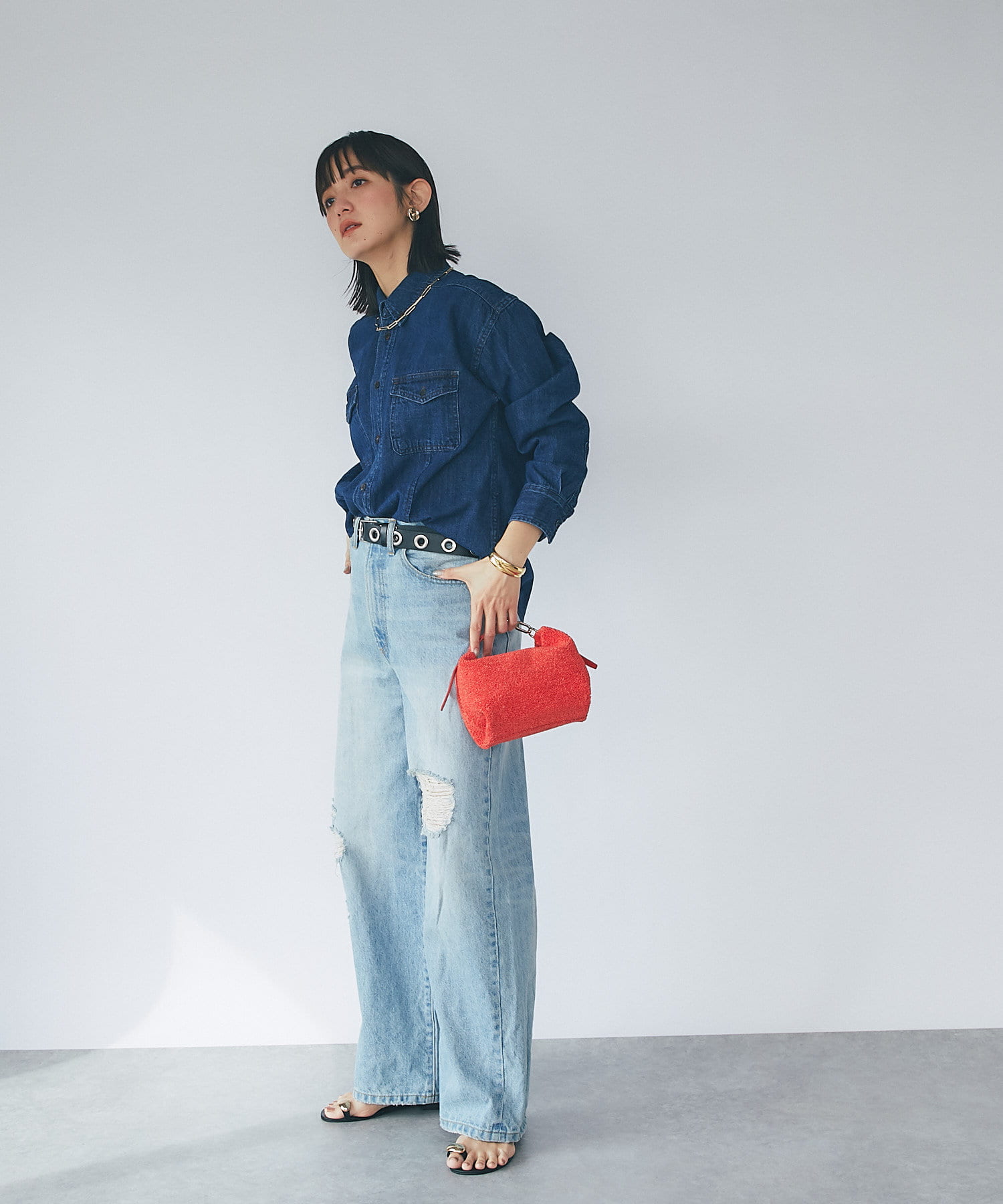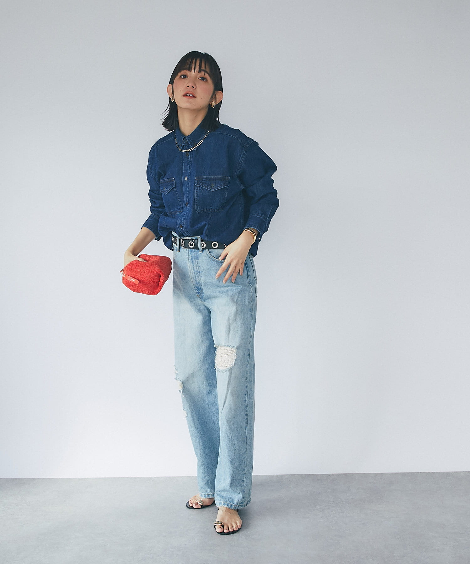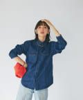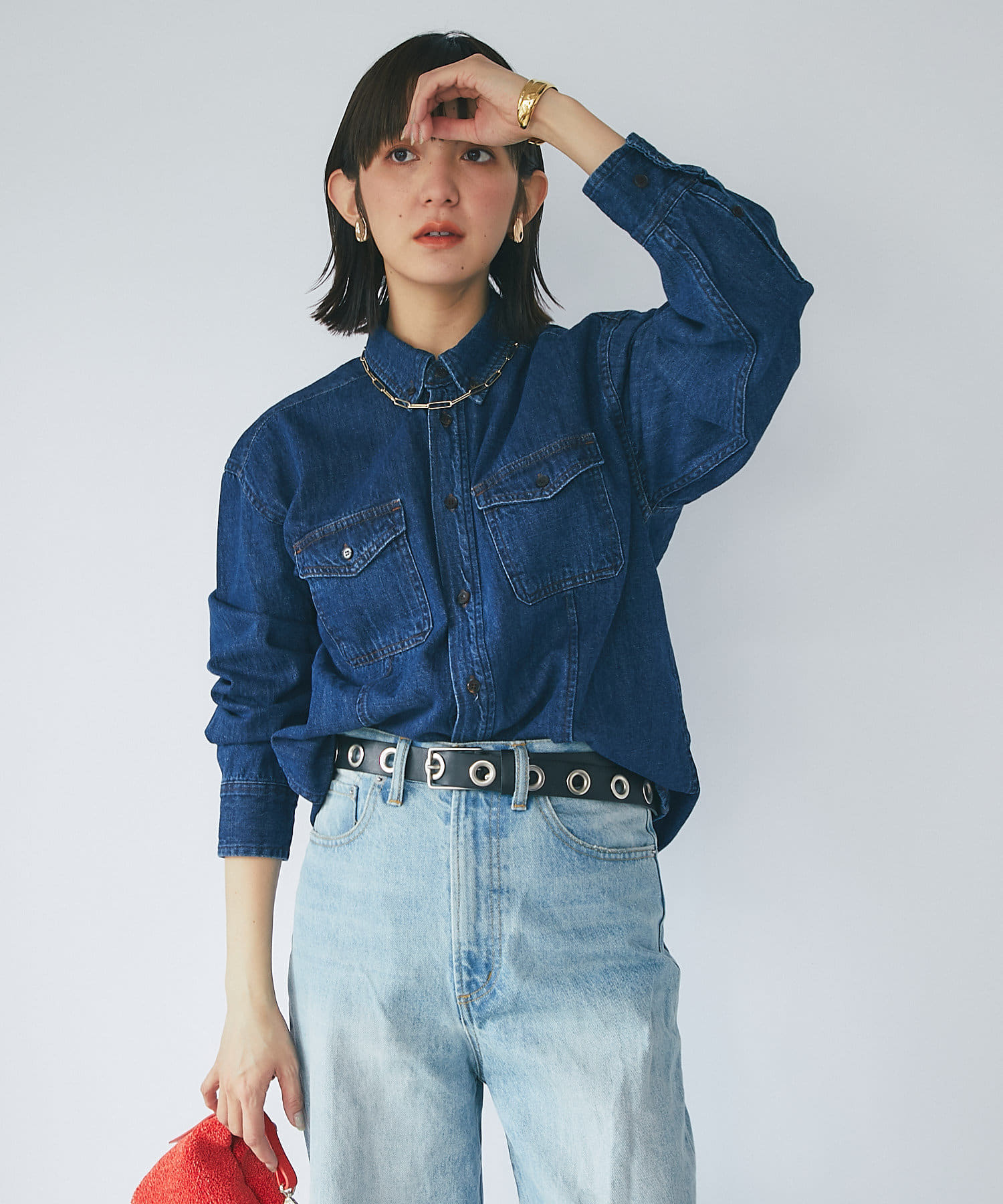 パンツにもスカートにも合わせやすさ抜群のデニムシャツ。タイトスカートと合わせた女性らしいカジュアルスタイルもおすすめです。