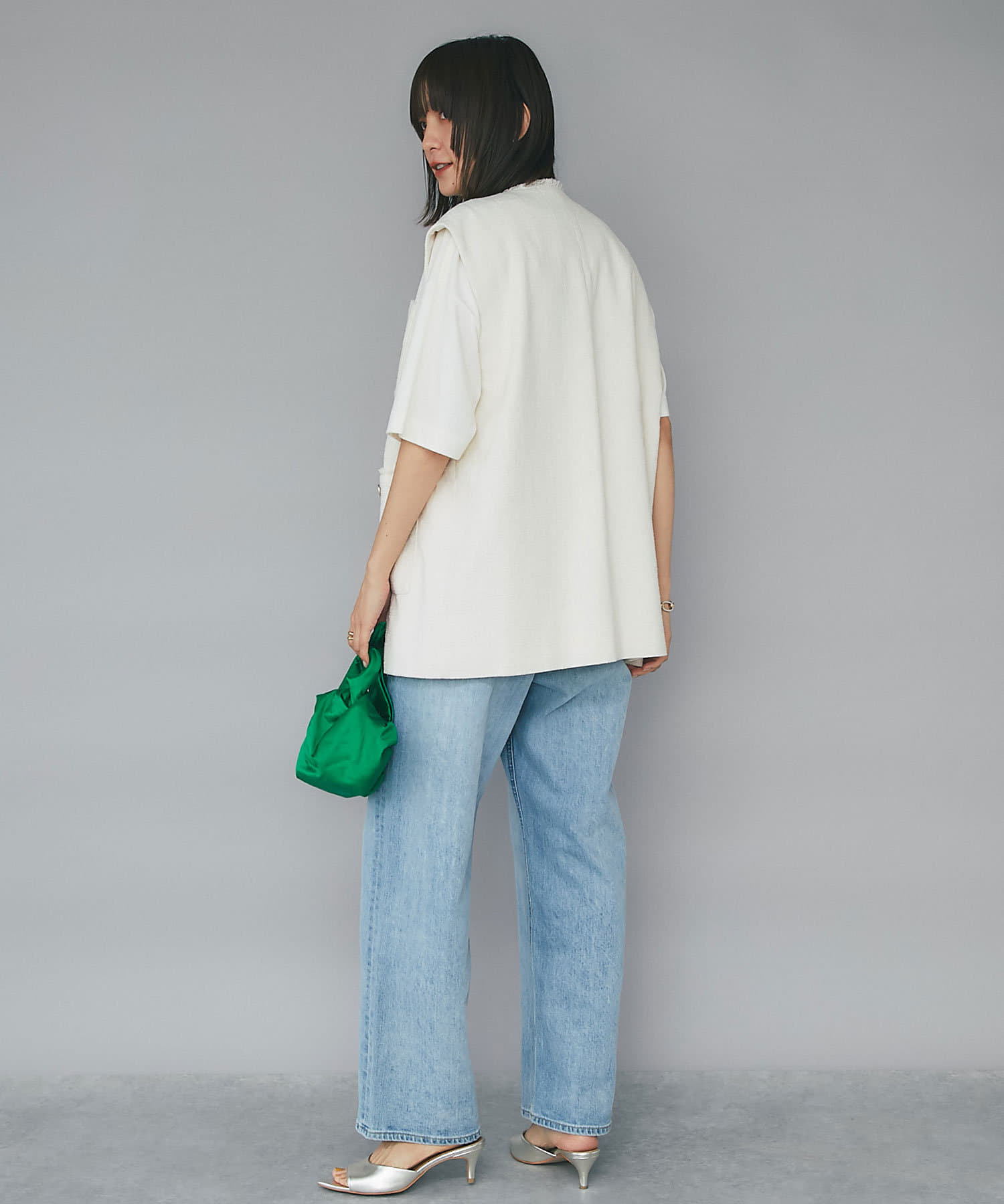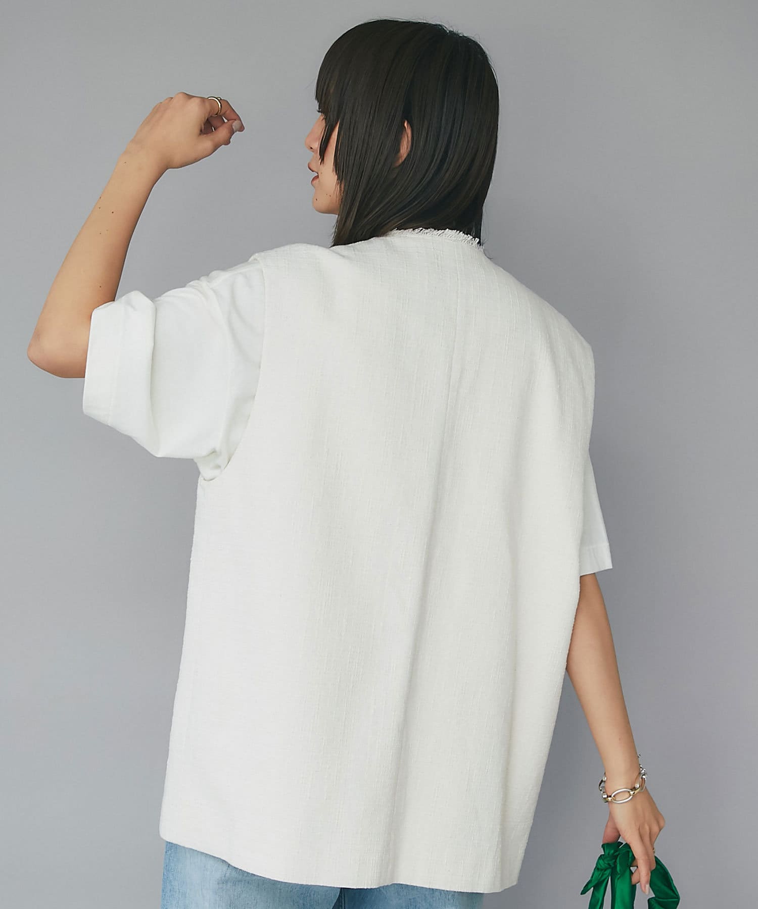 ⇒こちらのアイテムにはホックは付属しておらず、前を閉じての着用はできない仕様となっています。ジャケットほどツイード素材の主張が強くなく、さっと羽織って気軽にトレンドを取り入れることができます。