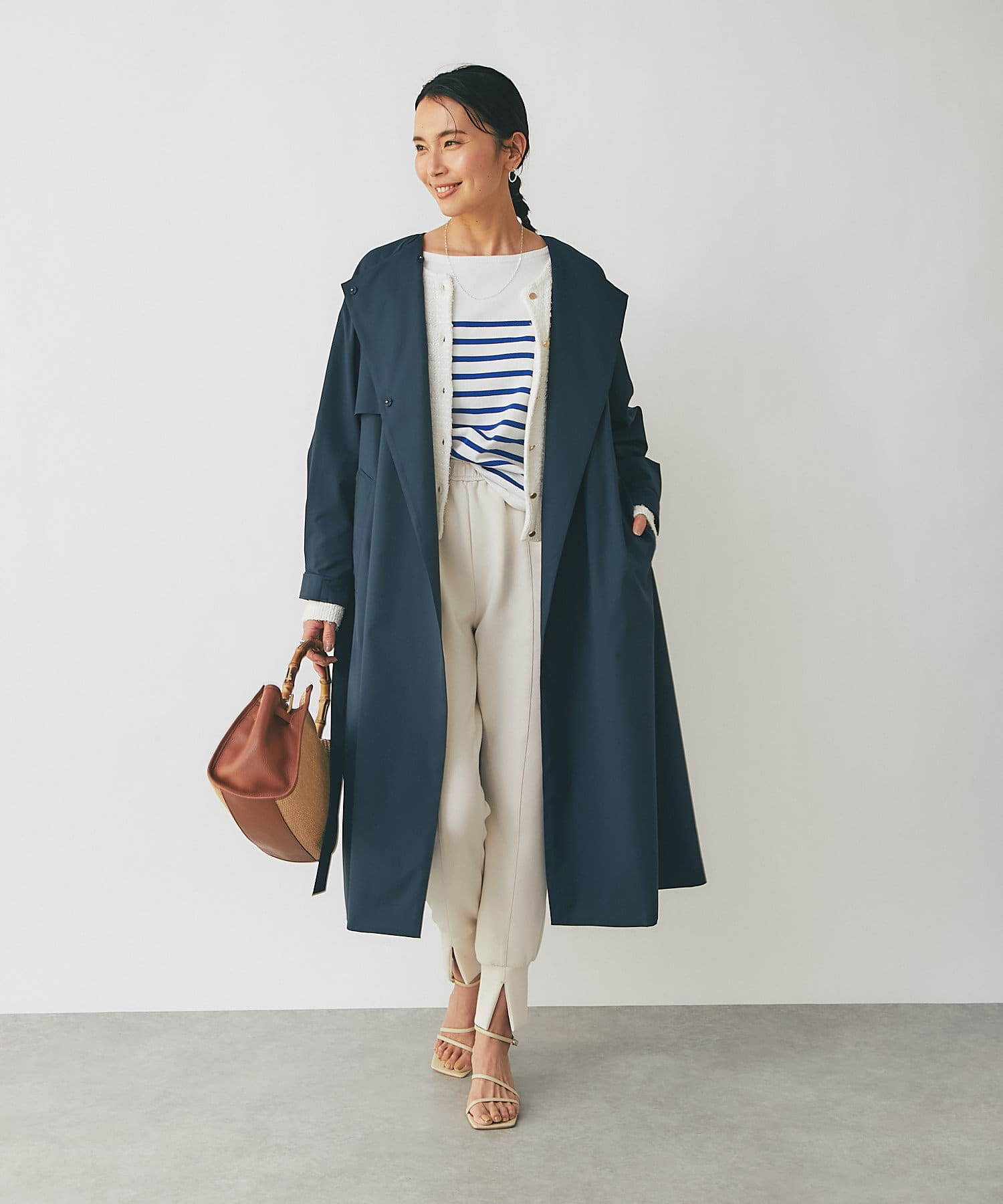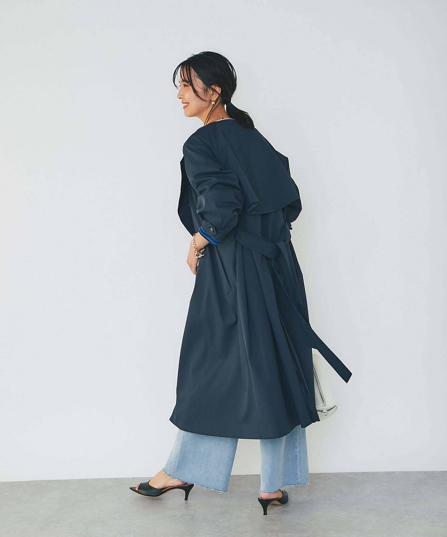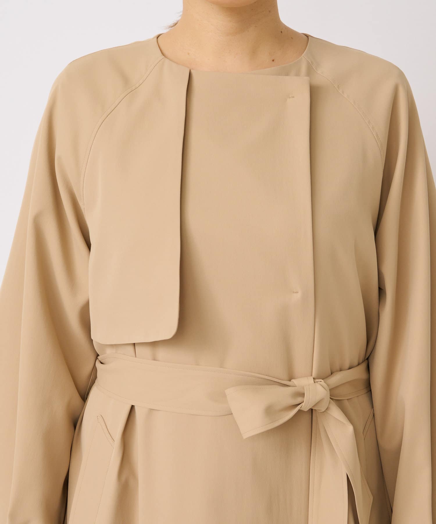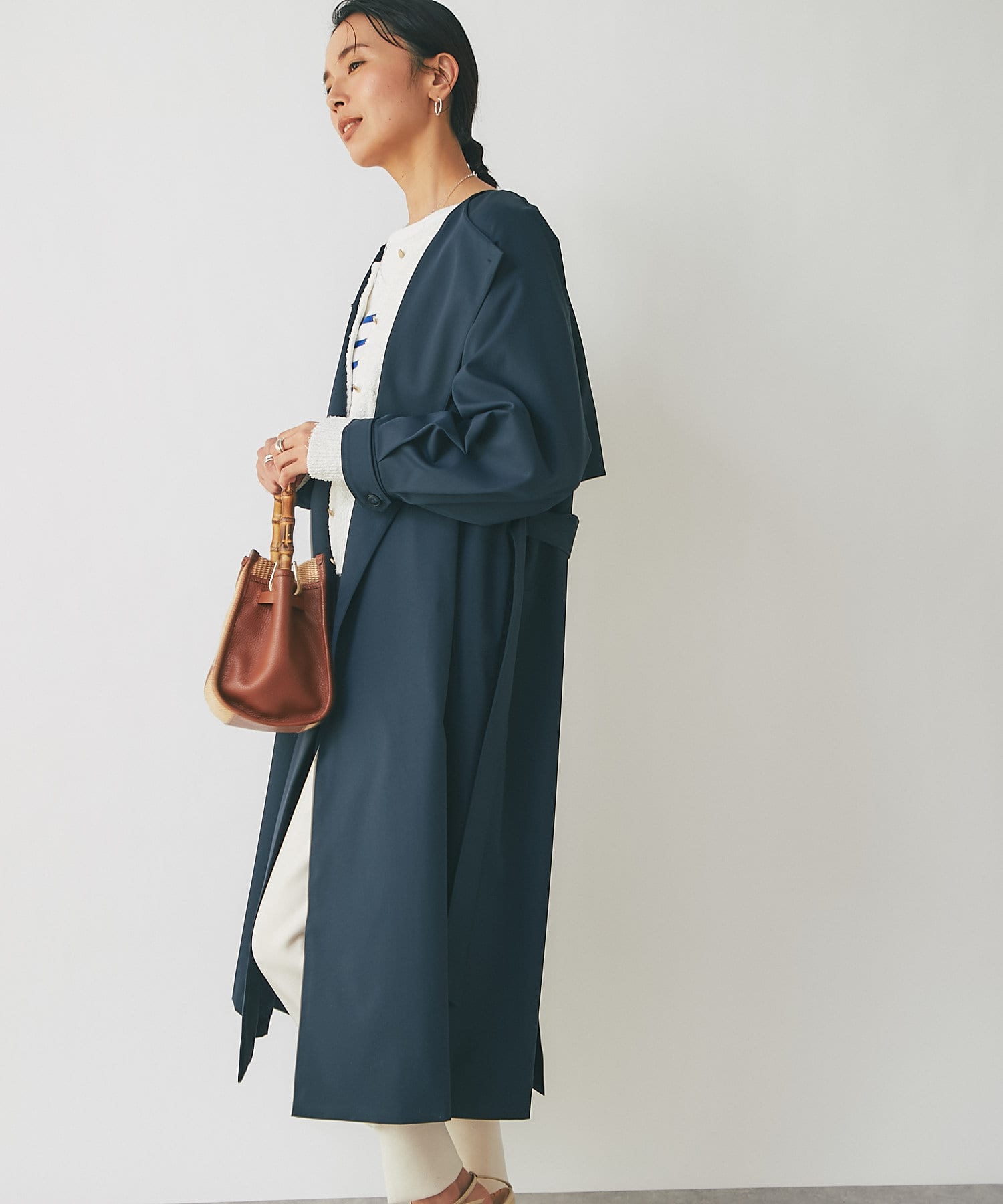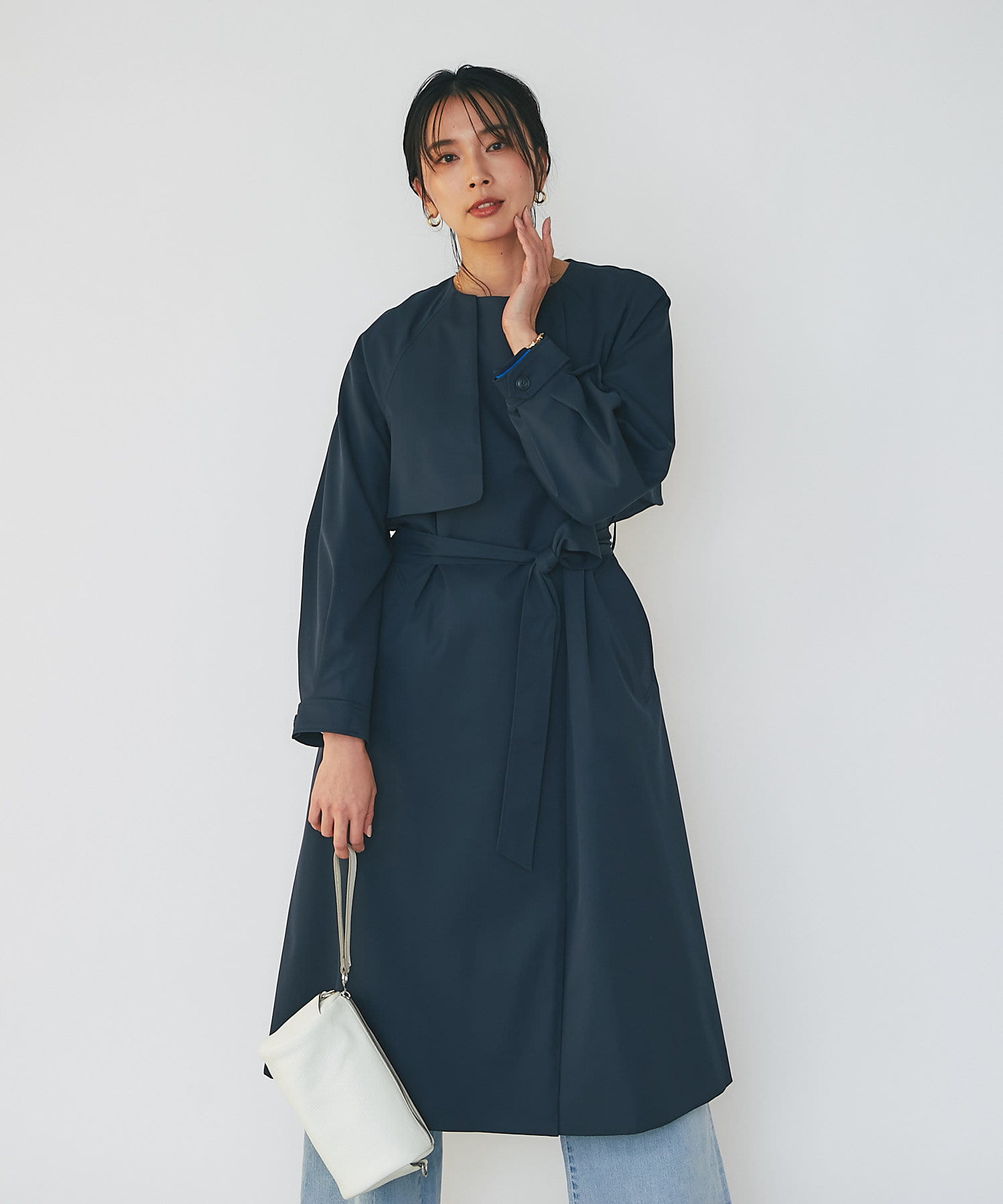 上品さが引き立つノーカラーとメリハリを付けられるサッシュベルト付きコート。