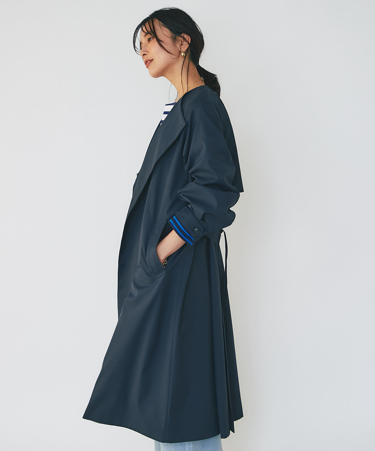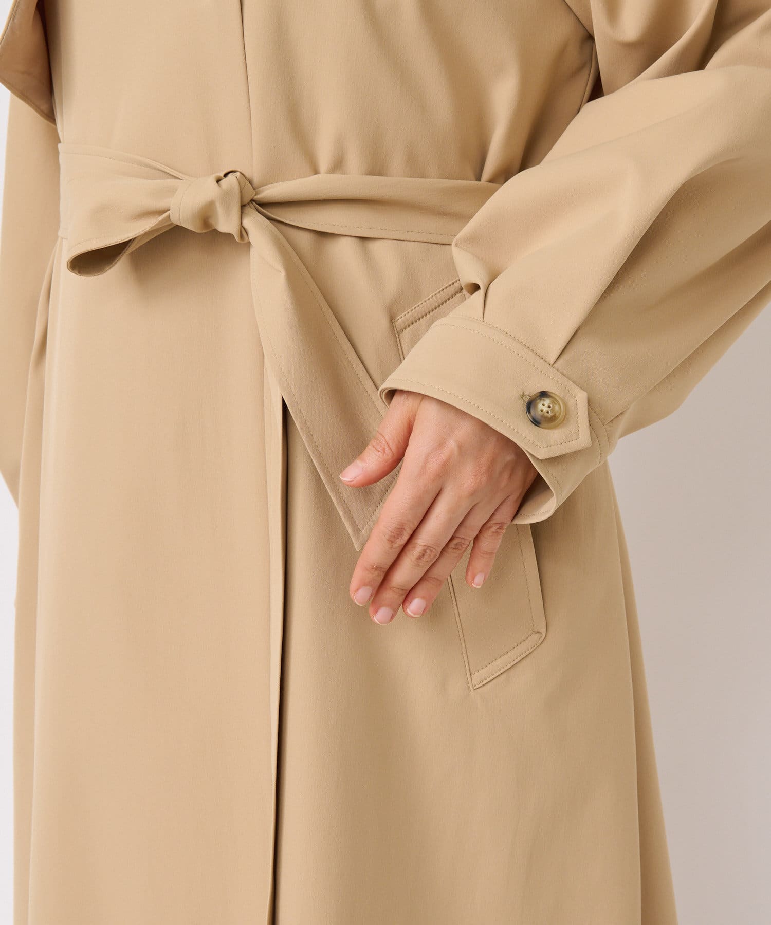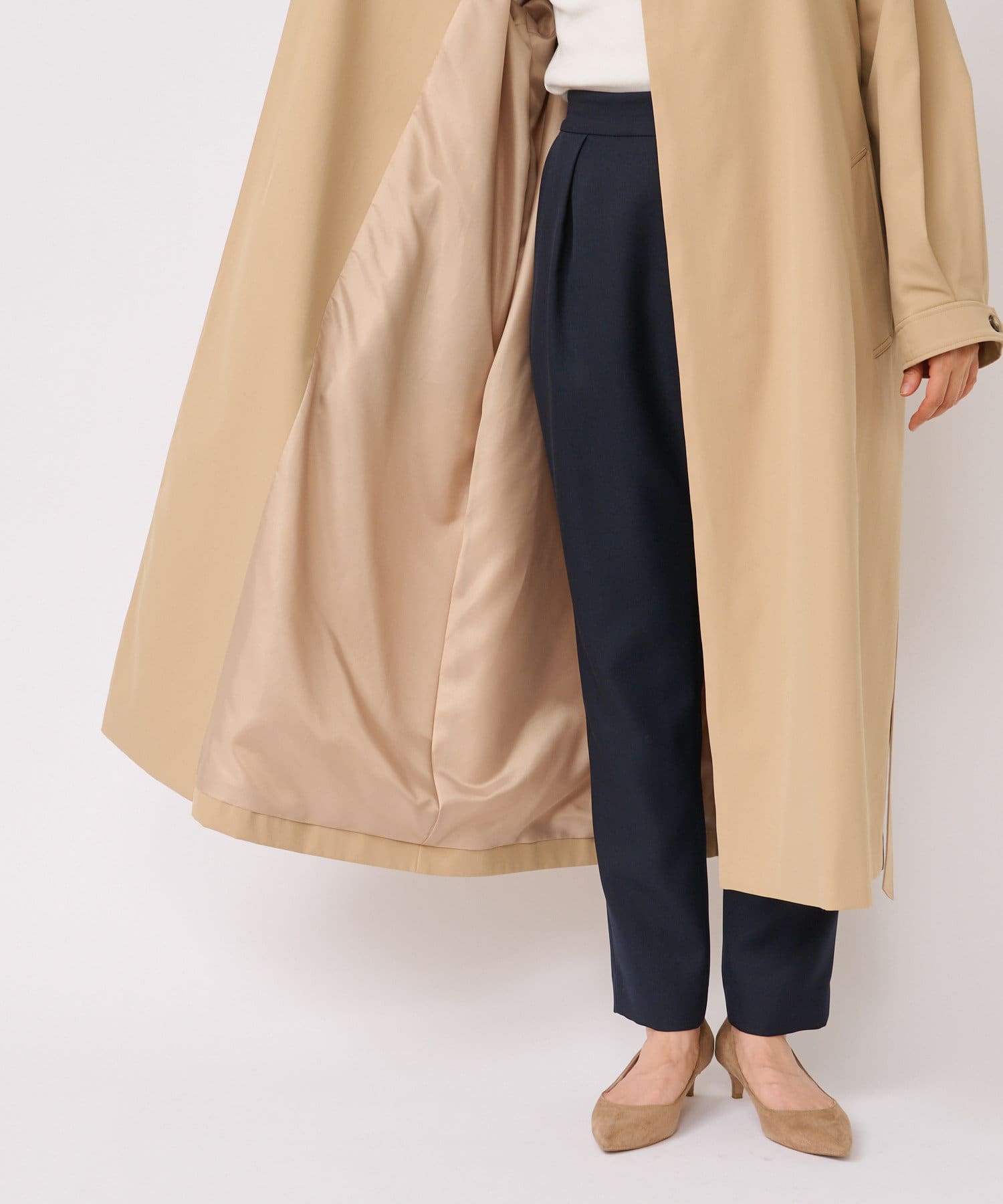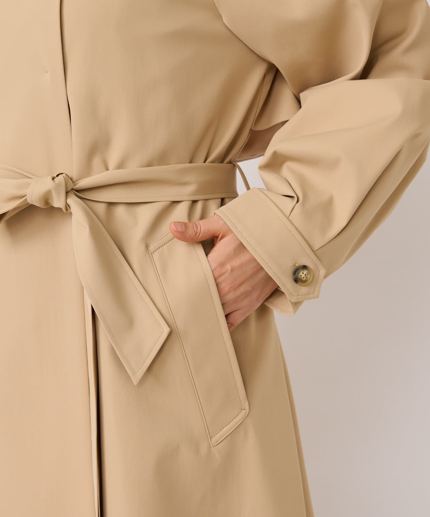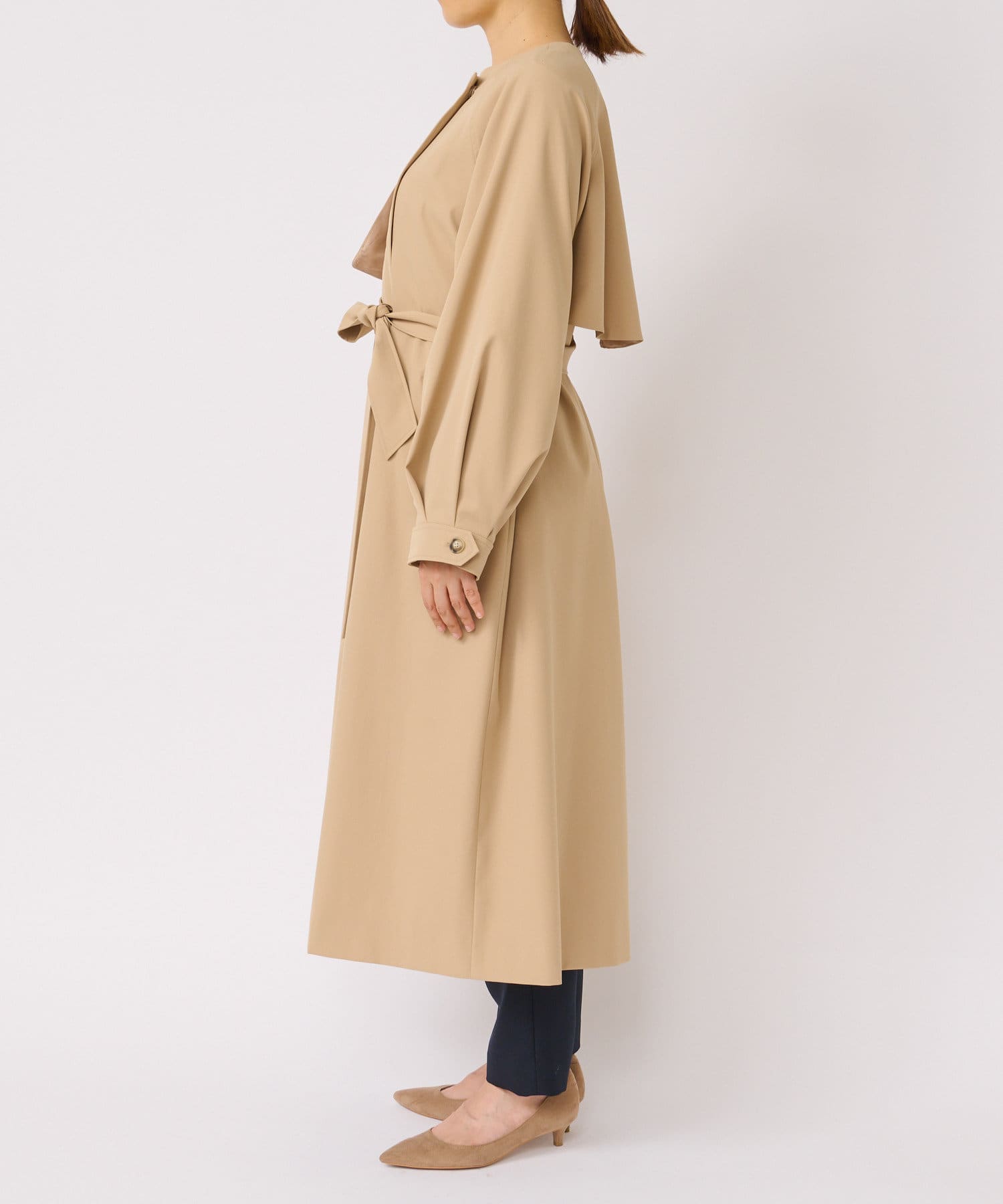 上品さが引き立つノーカラーとメリハリを付けられるサッシュベルト付きコート。