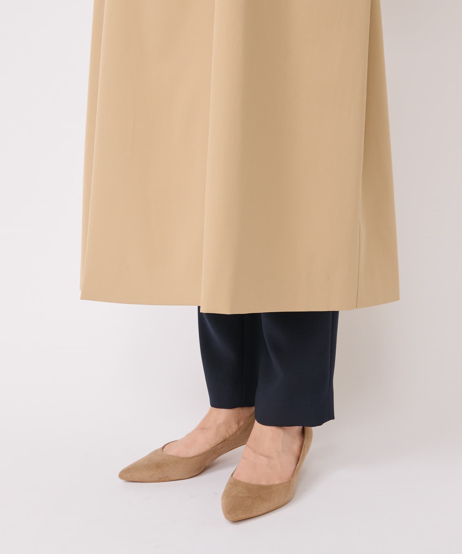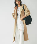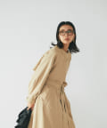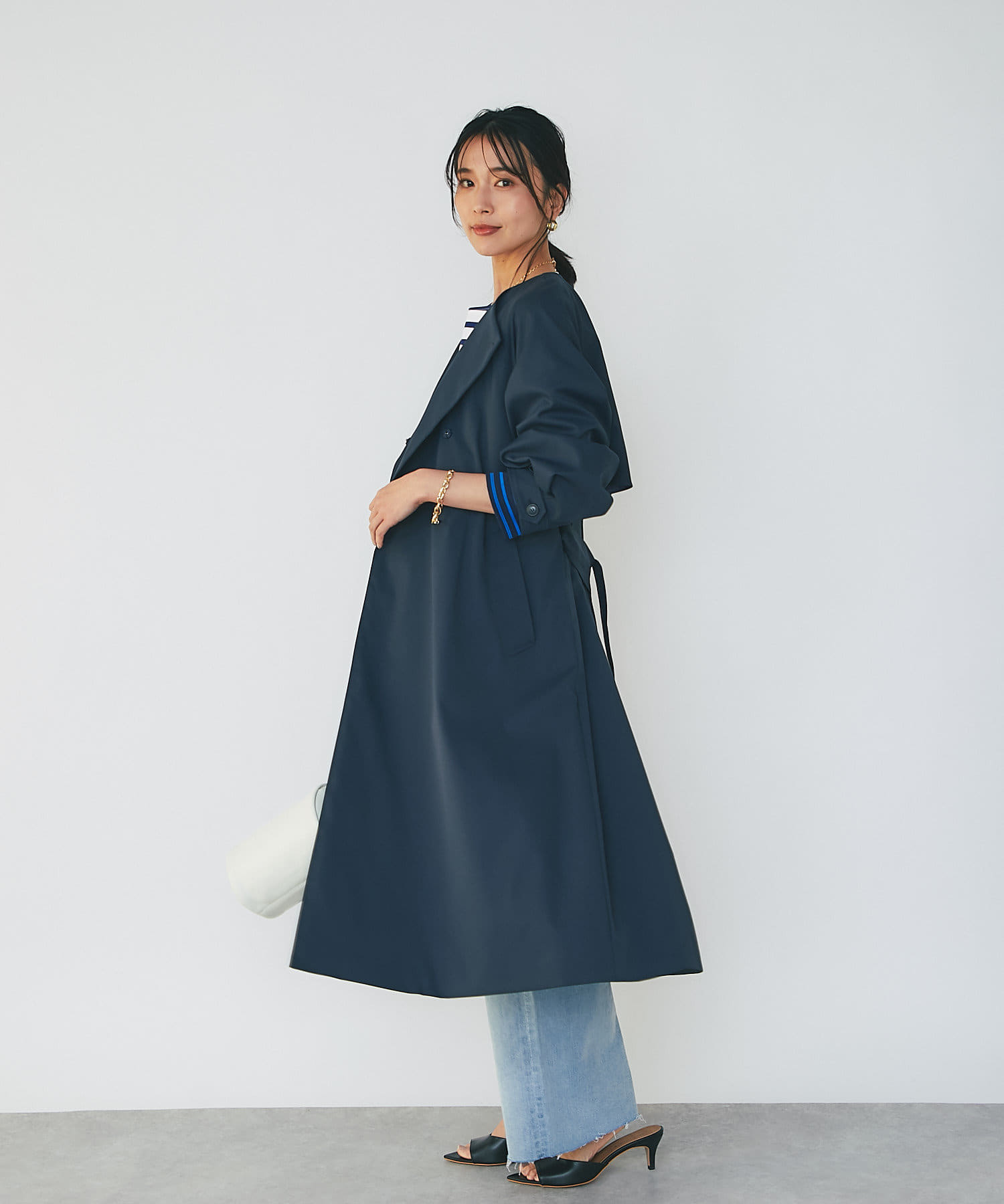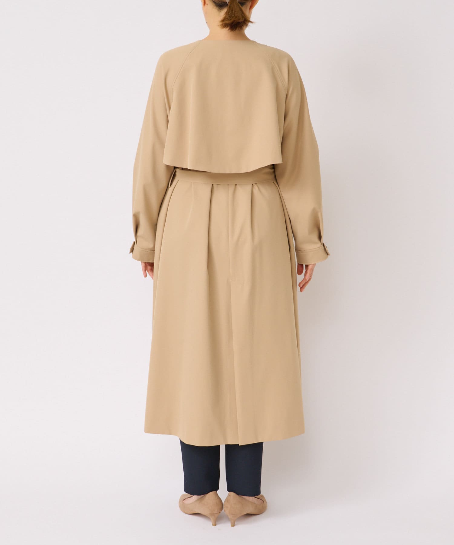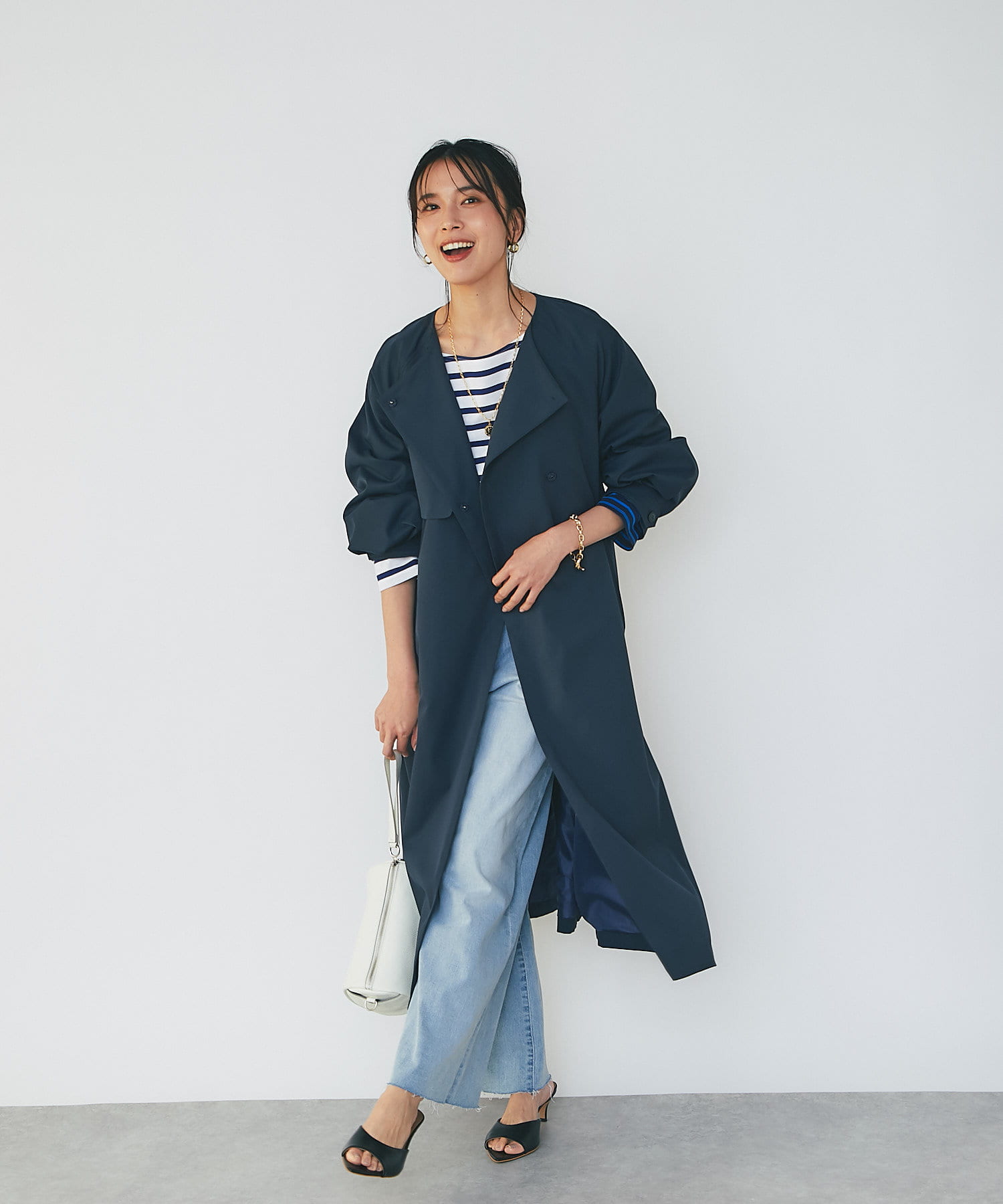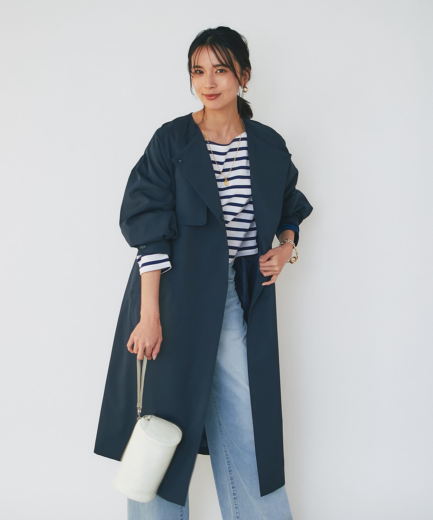 上品さが引き立つノーカラーとメリハリを付けられるサッシュベルト付きコート。