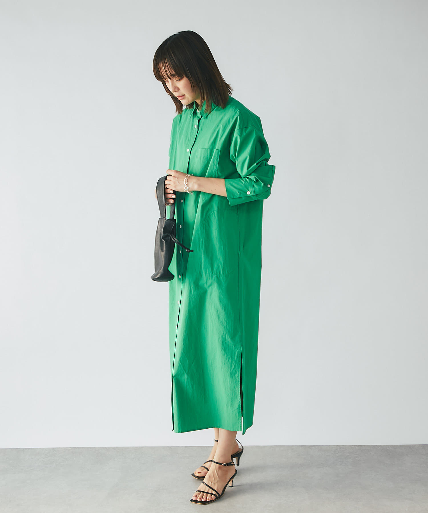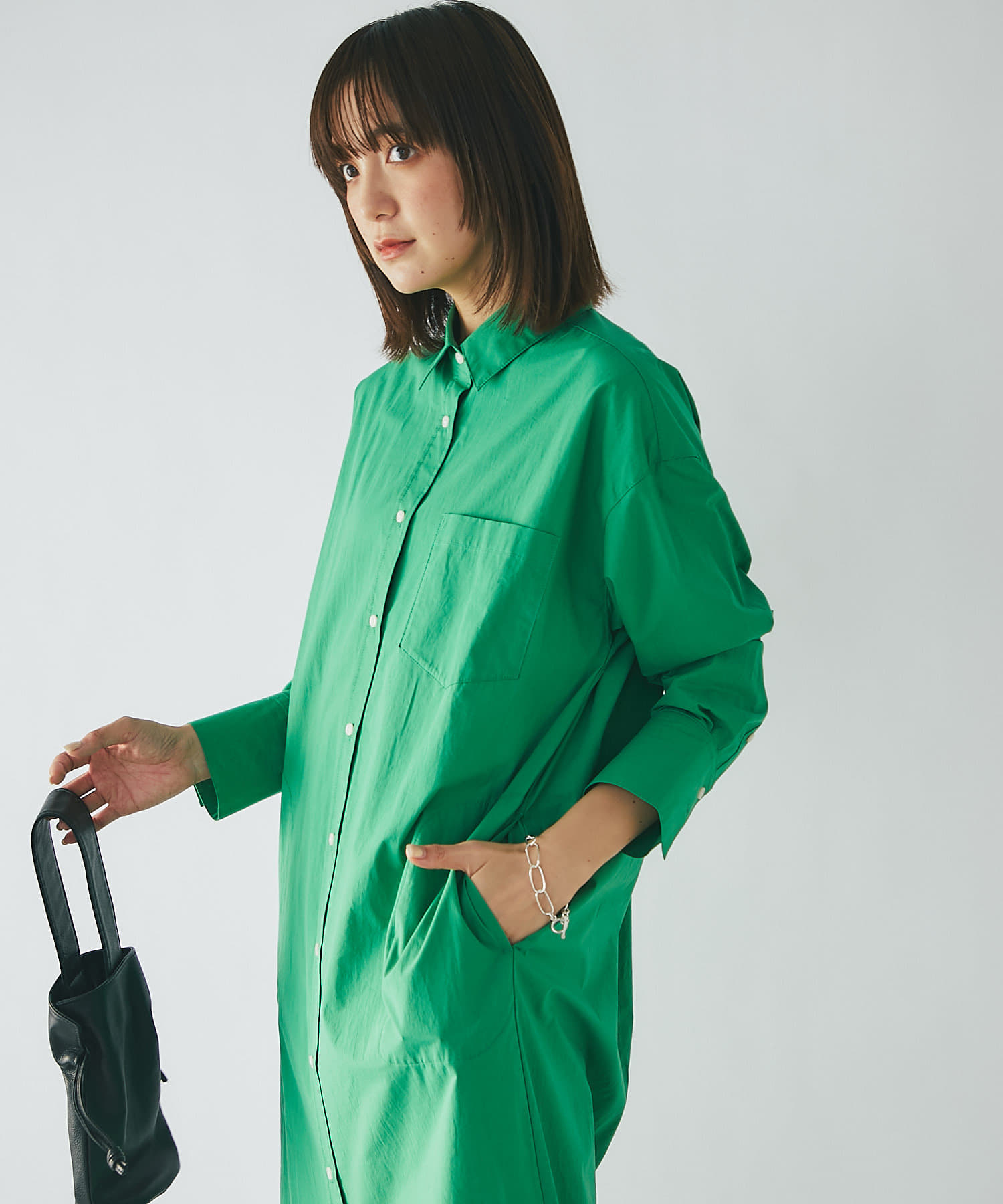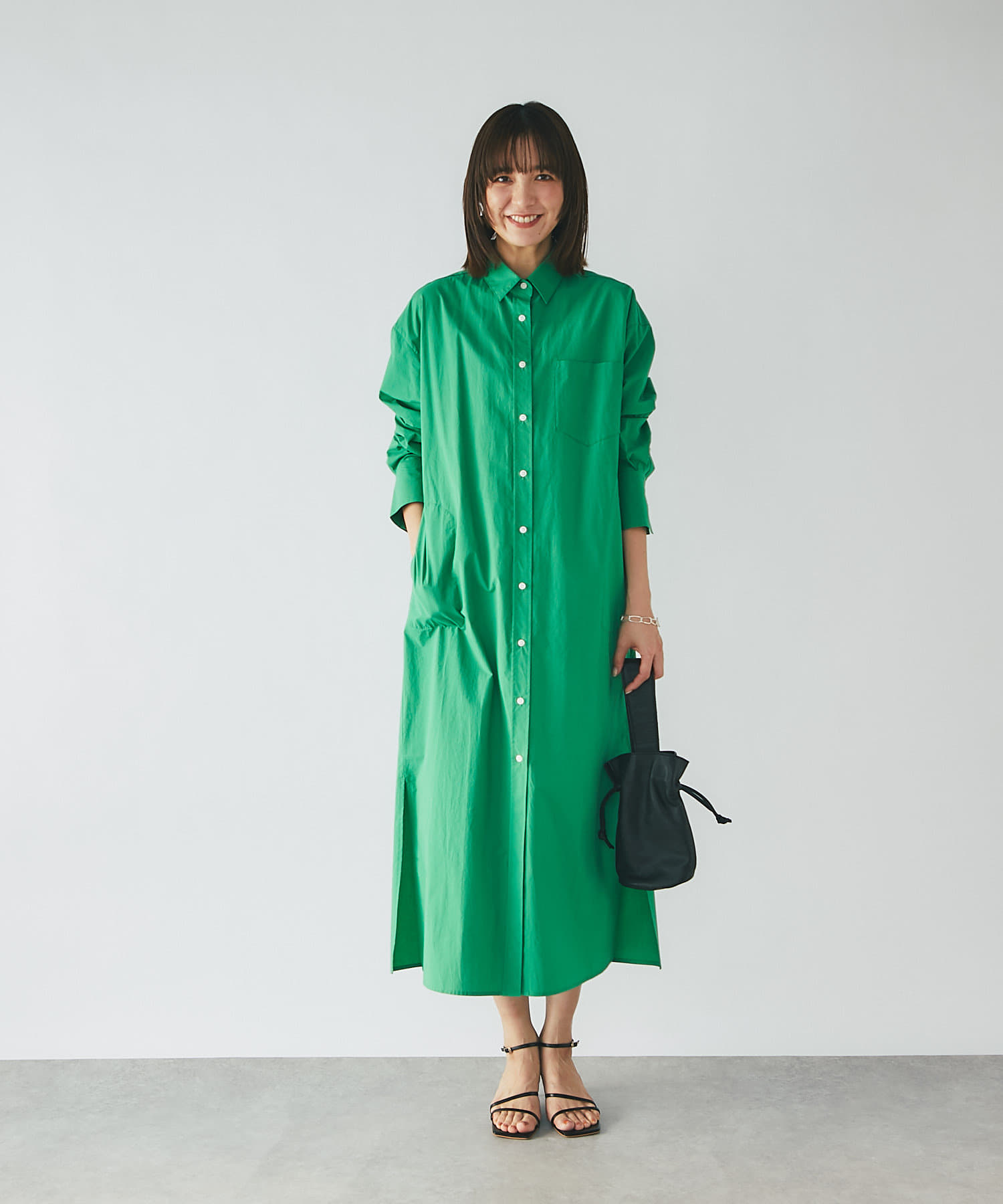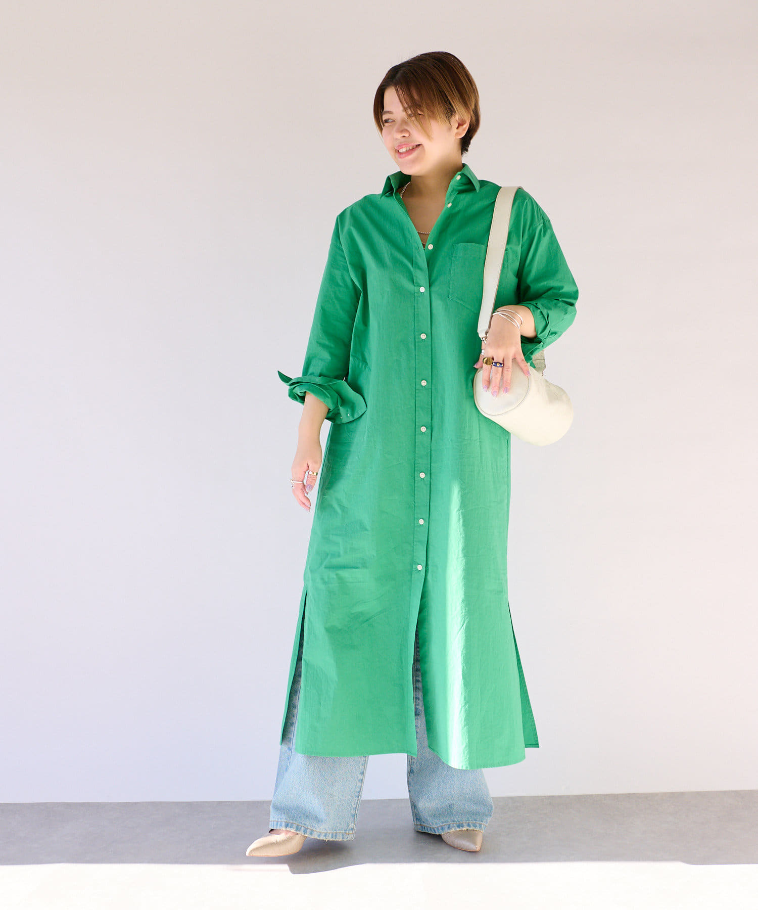 今季トレンドのグリーンとサックスが印象的なシャツワンピース。
