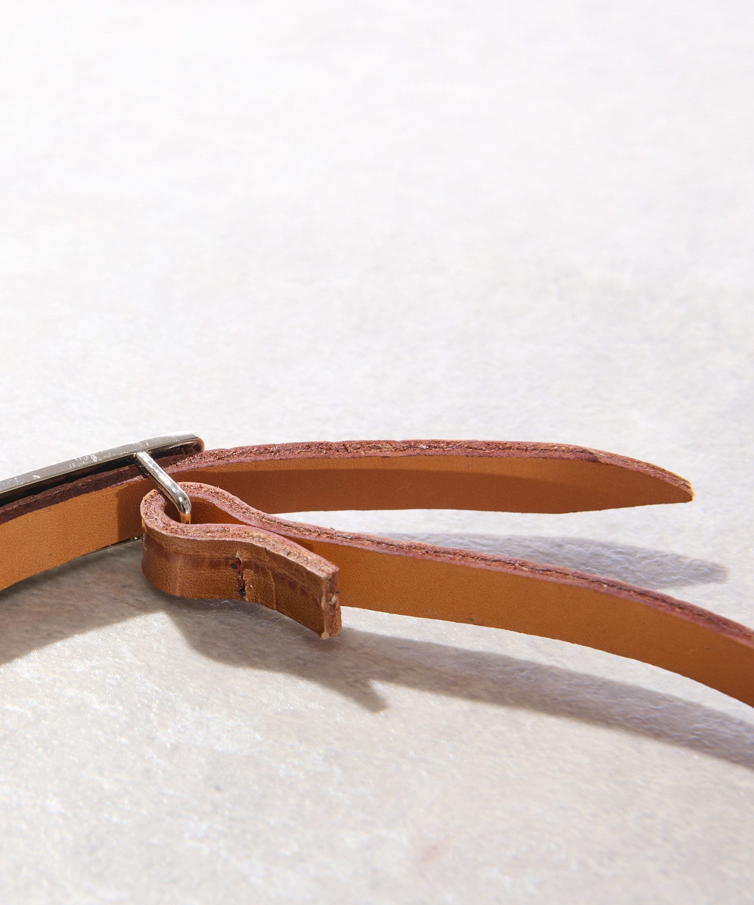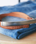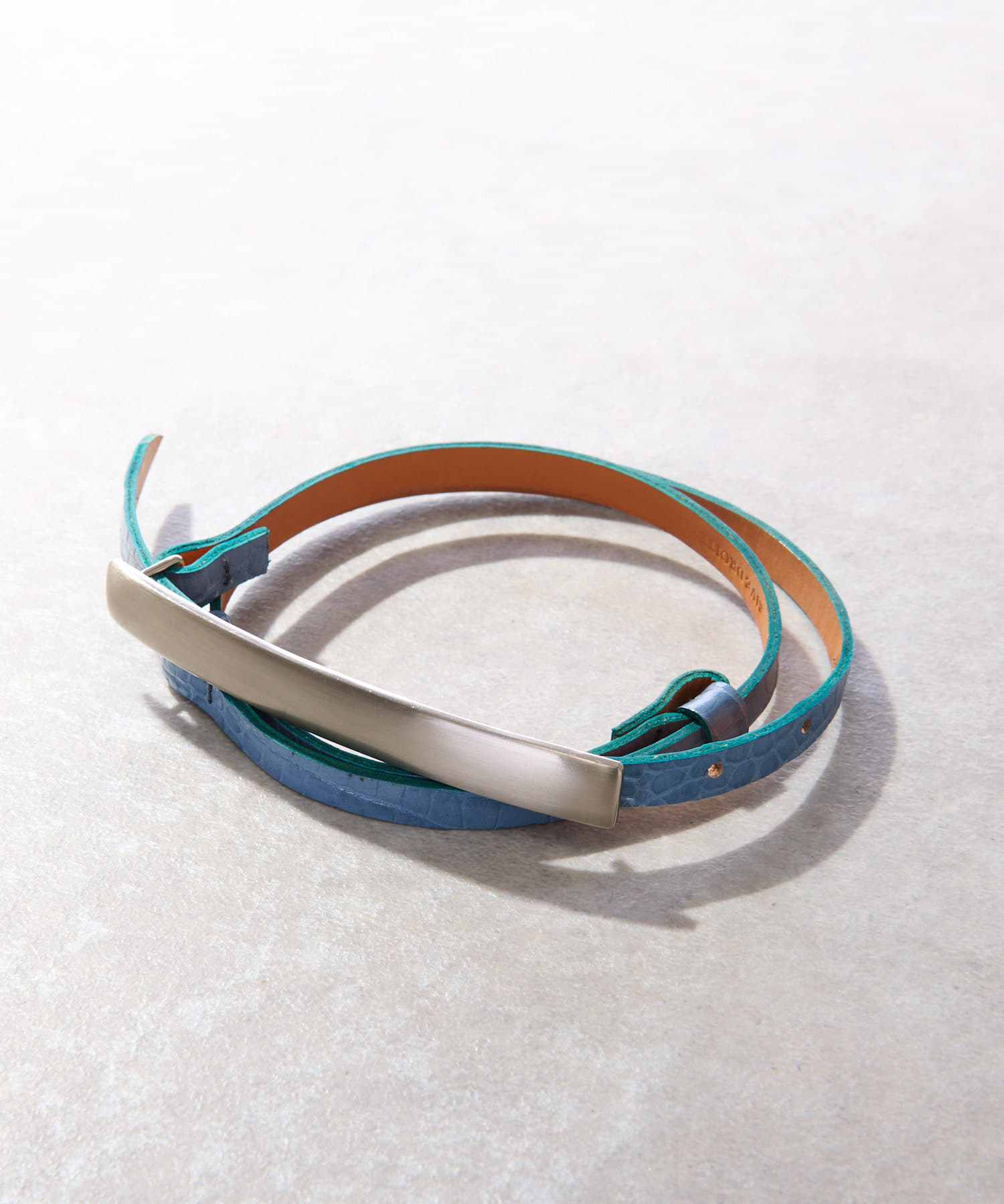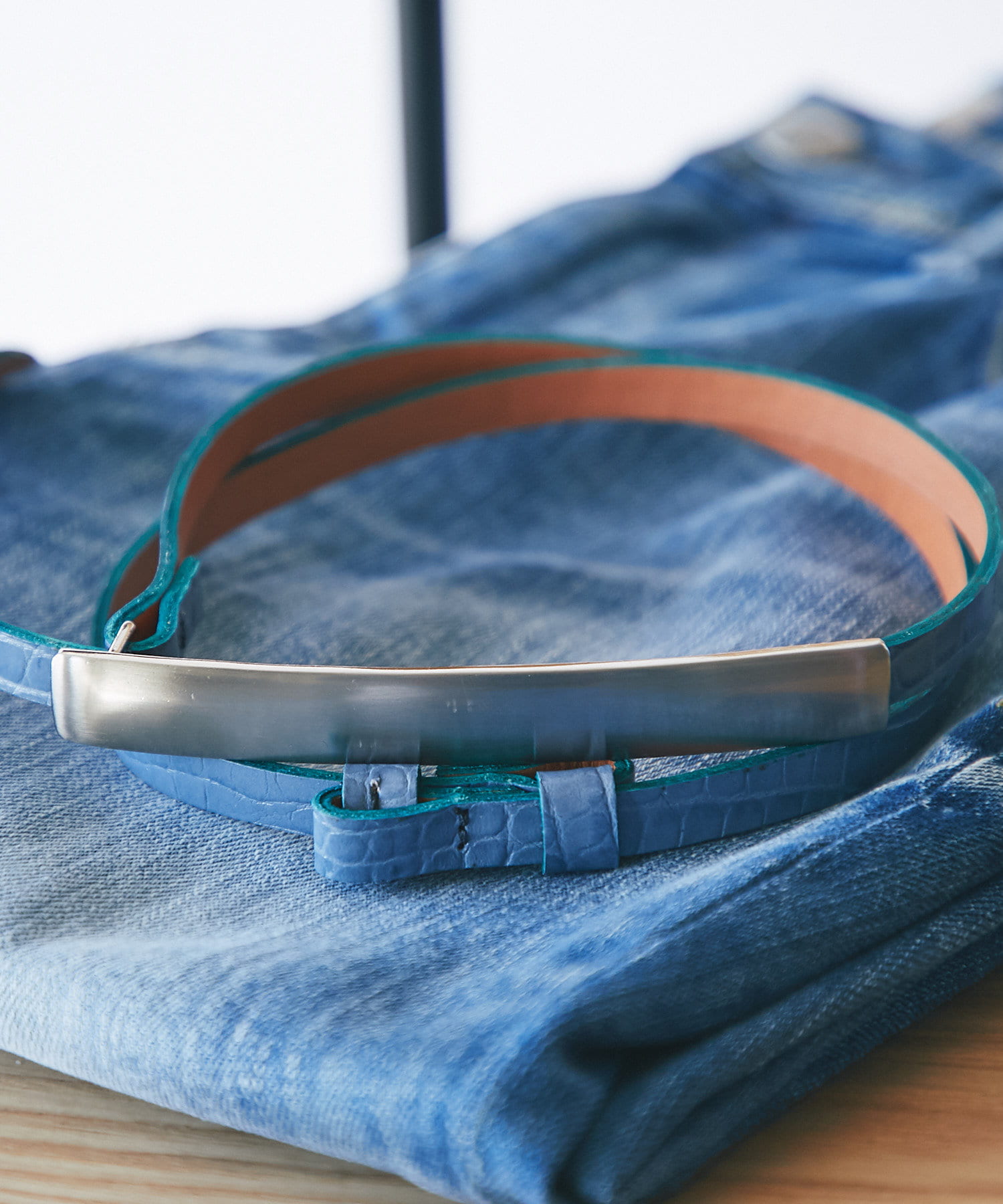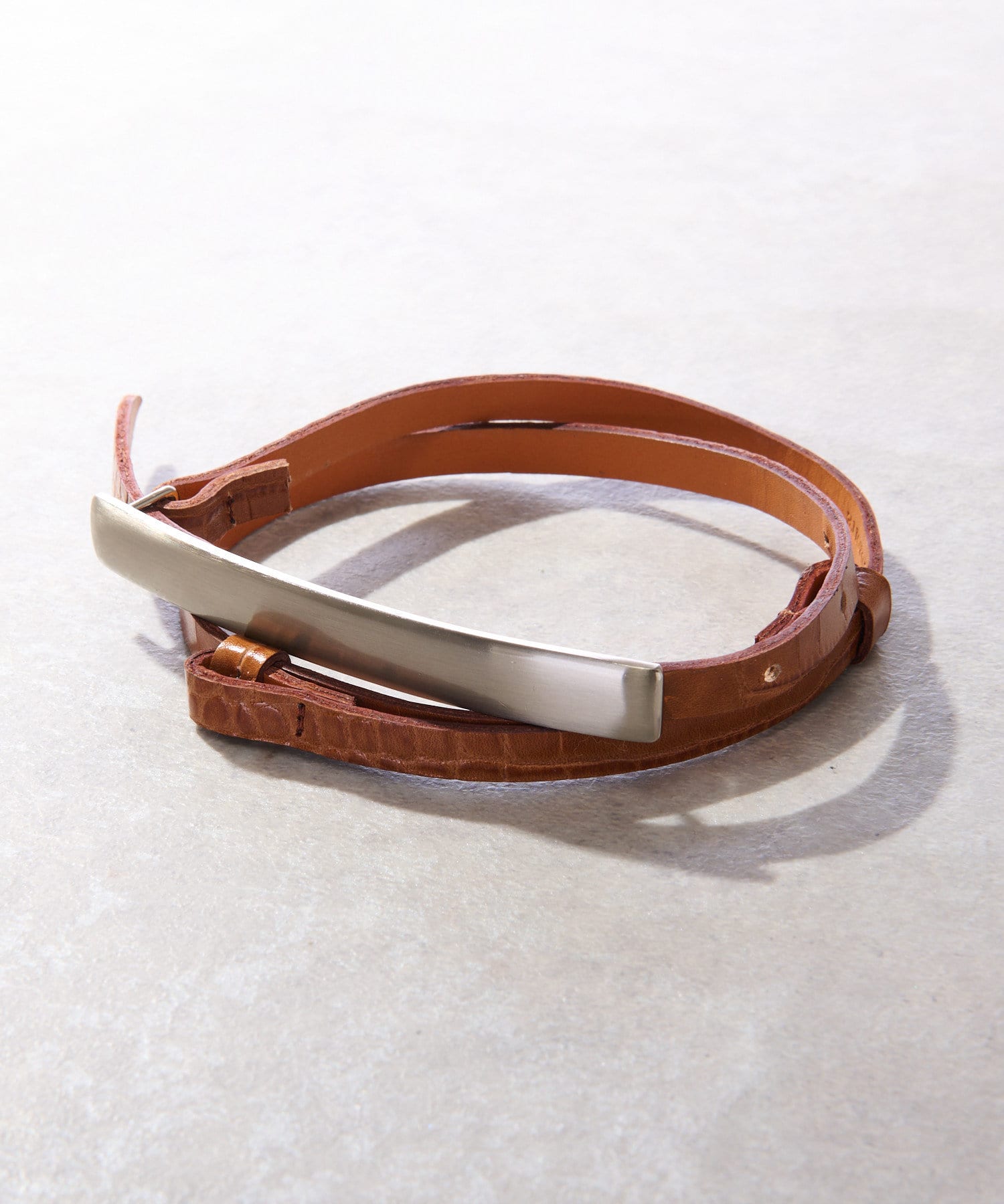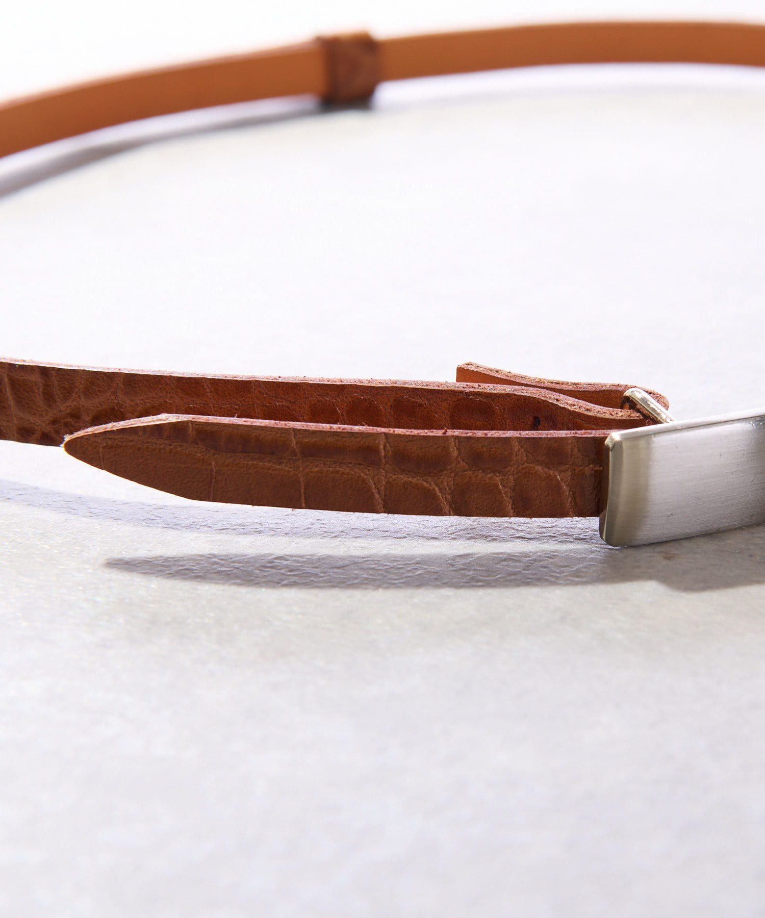 スリムなシルバープレートと牛革のクロコ型押しが魅力の細ベルト。