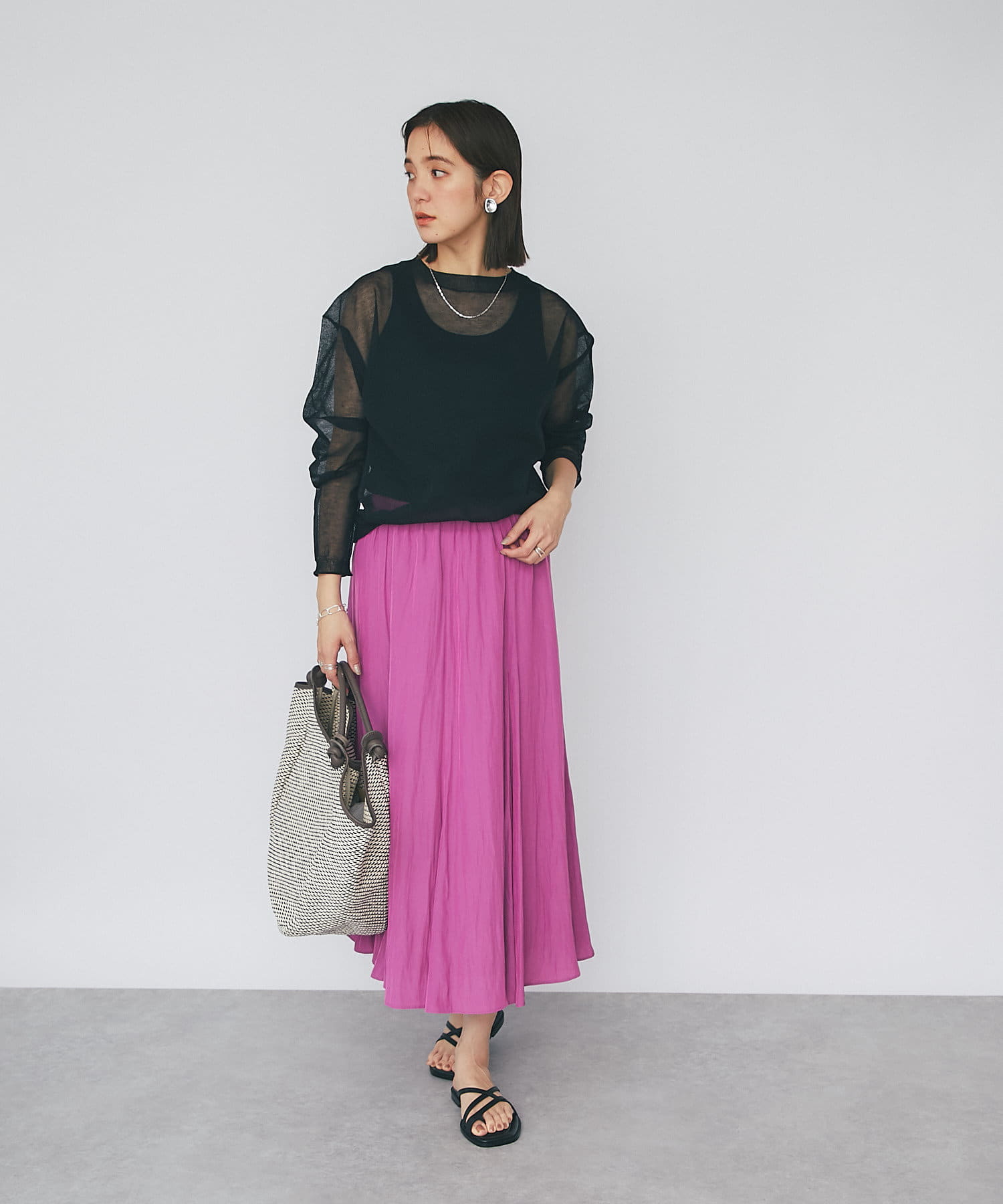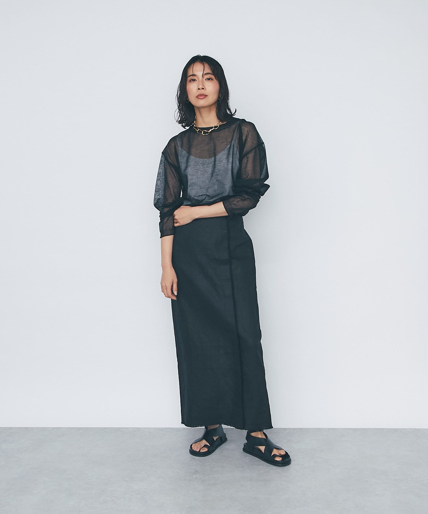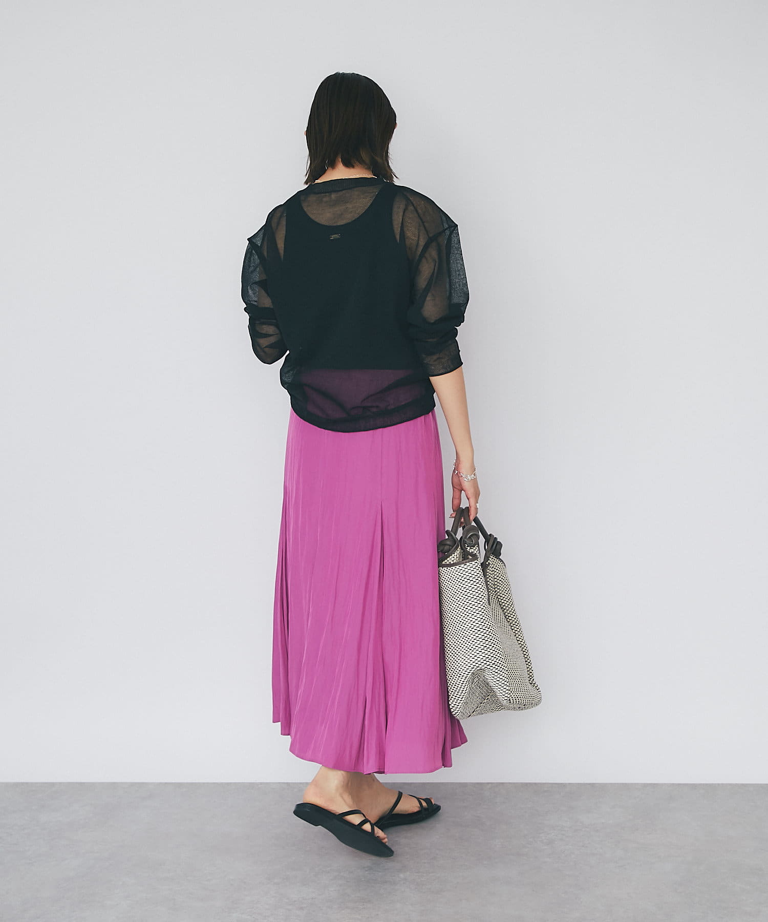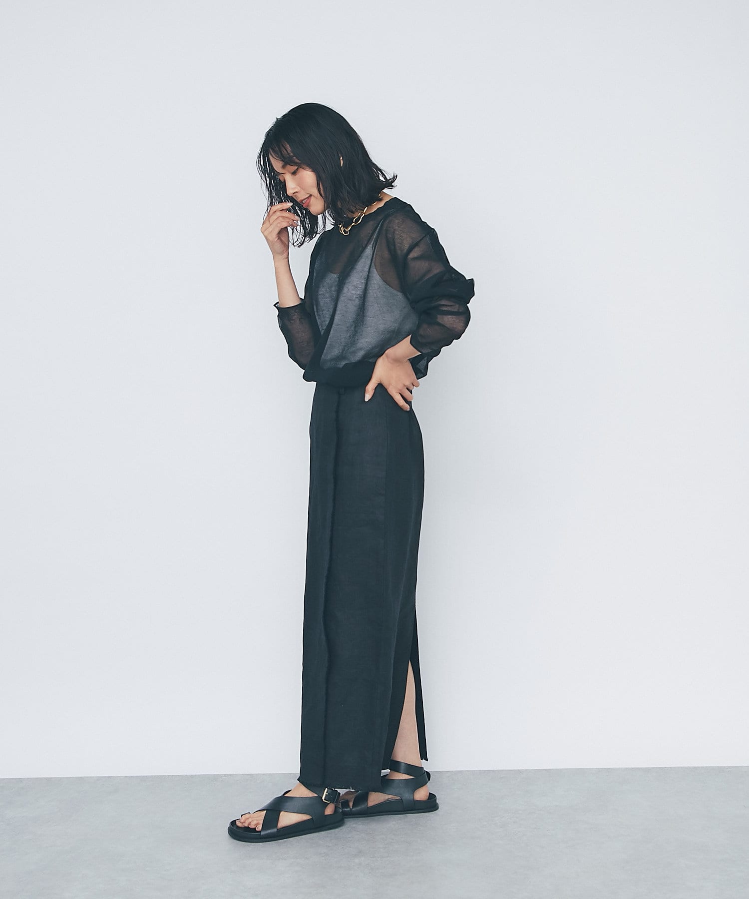 オーガンジーのようなハリと光沢のある素材感が女性らしく、リネン混のさらりとした素材で快適な着心地。