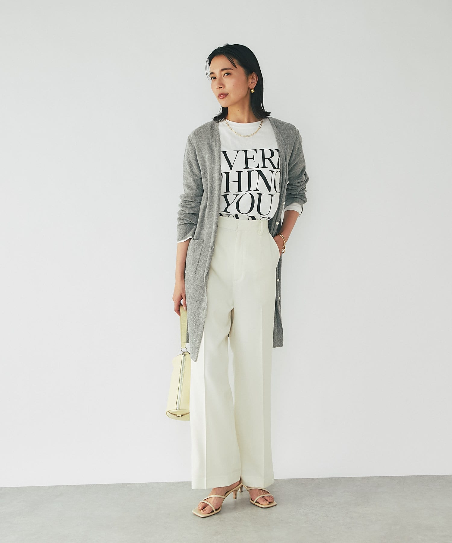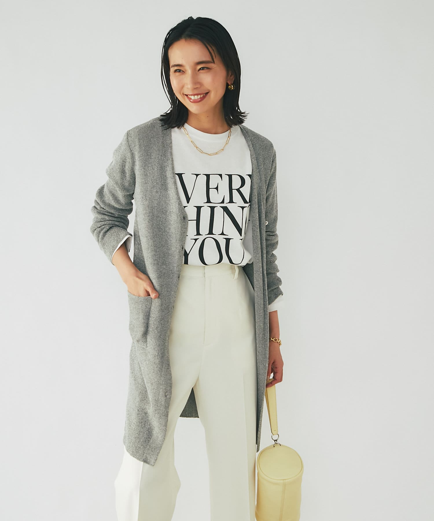 すとんとしたIラインのシルエットになるので、シルエットを生かせるストレートパンツやタイトスカートとのコーディネートがおすすめ。