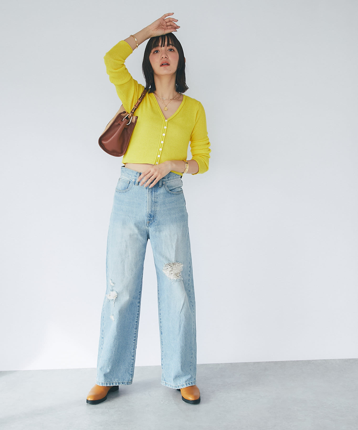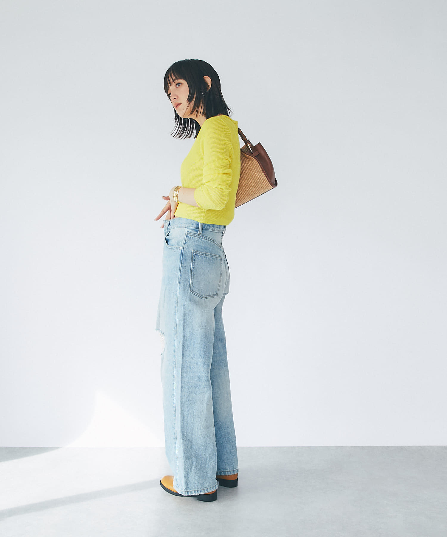 フェミニンな着こなしができるため、ボトムはあえてカーゴパンツやデニムで外しても可愛い。
