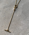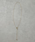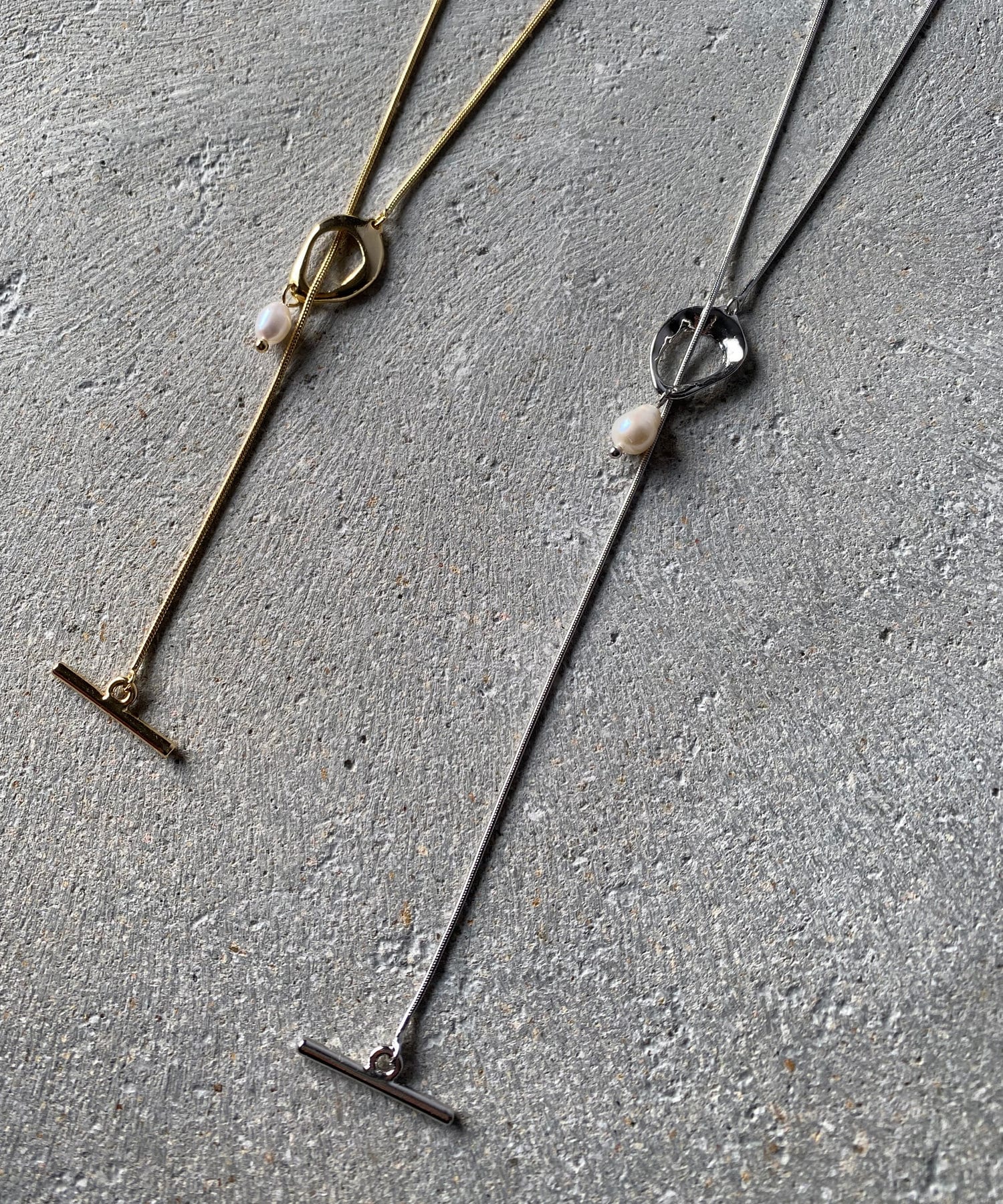 留め具のサークル型のメタルデザインがアクセントになったスライド式のロングネックレスです。