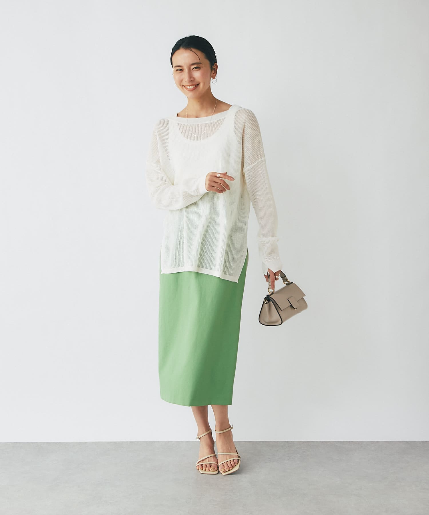 すっきりとスタイルアップ効果抜群で、ブラウスやニット・TシャツなどをINしてきれいに着ていただけます。