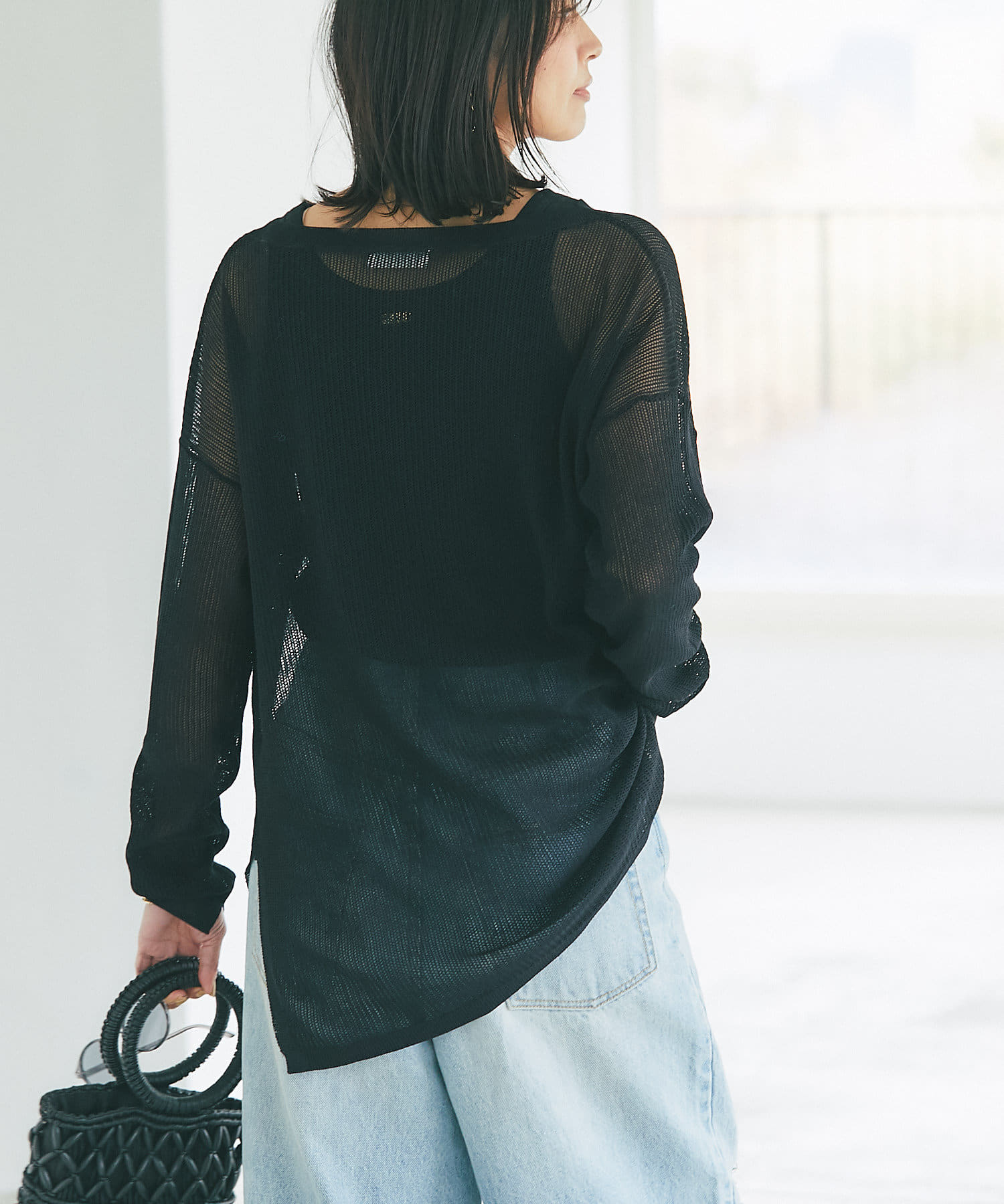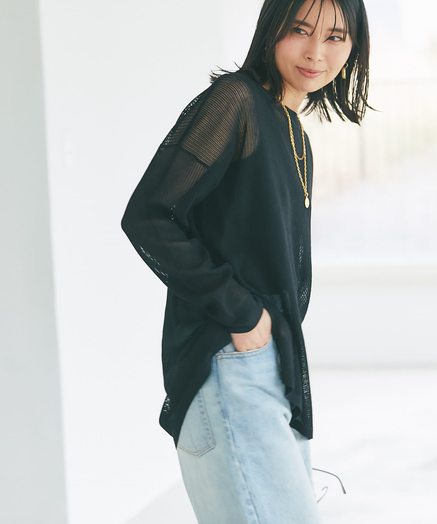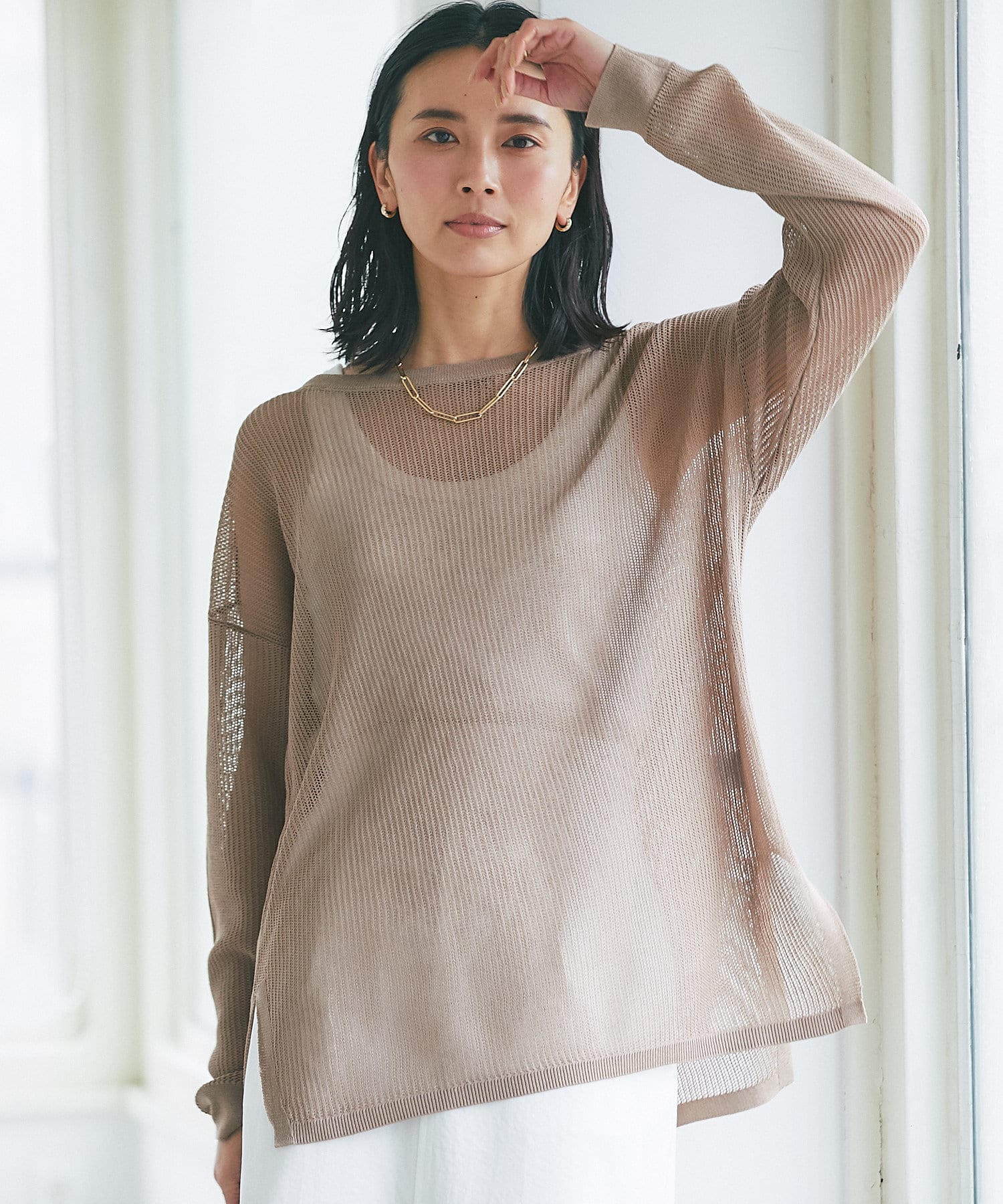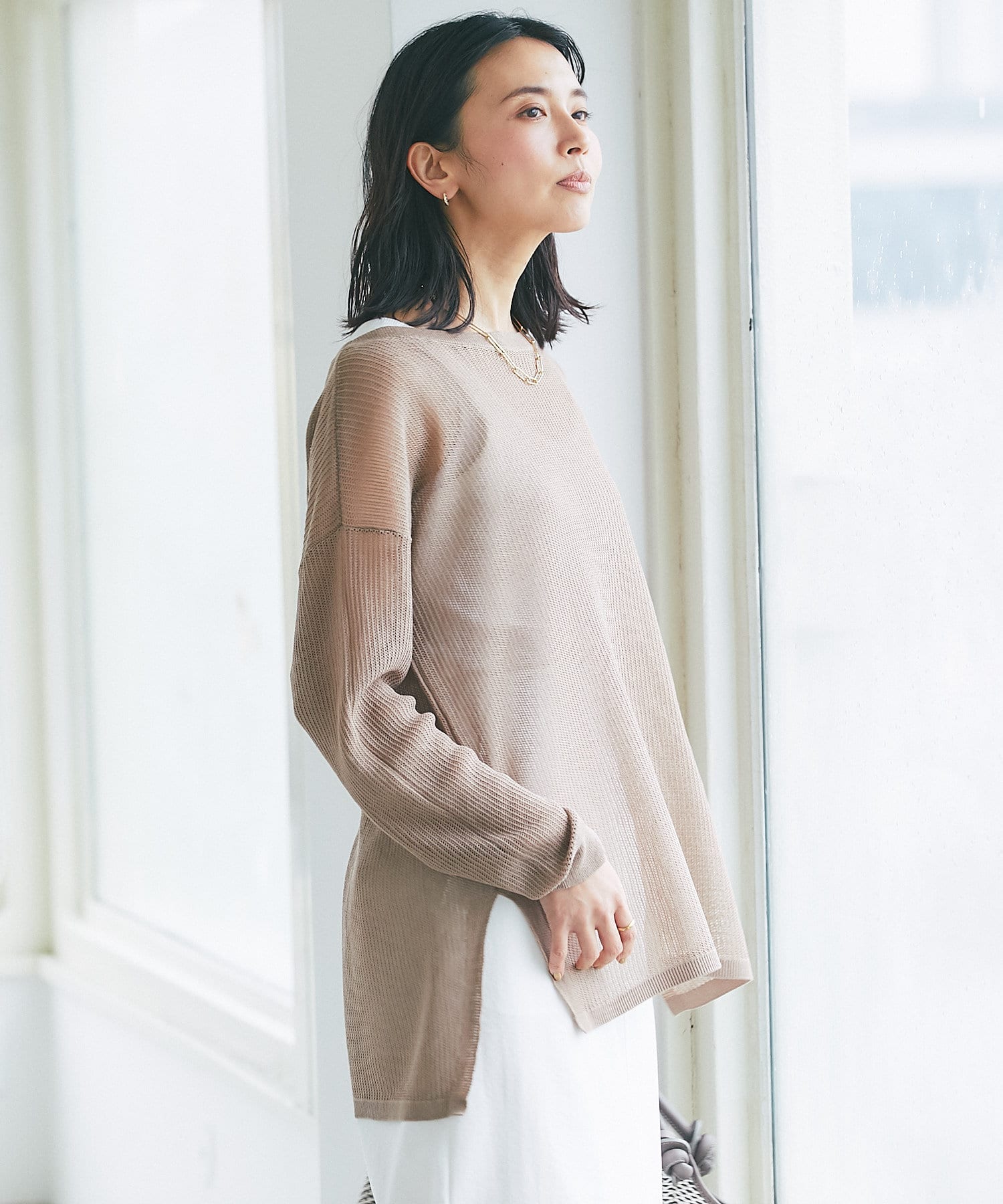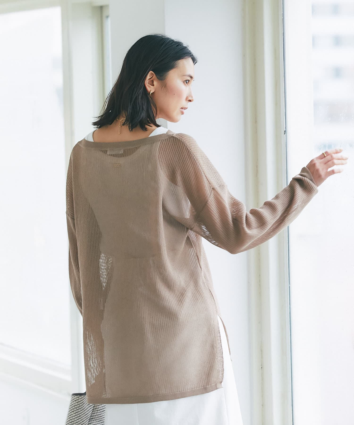目の細かなメッシュを採用したナチュラルな透け感と、体型カバーできる着丈が大人にピッタリ。