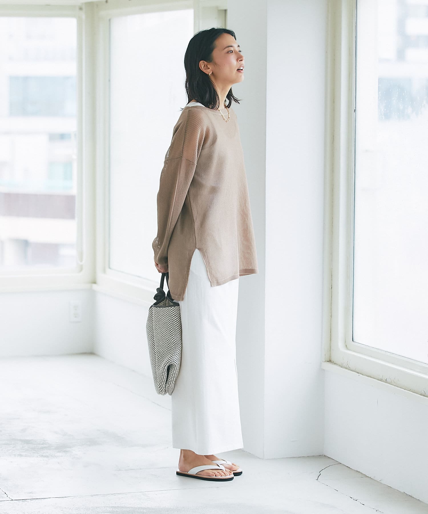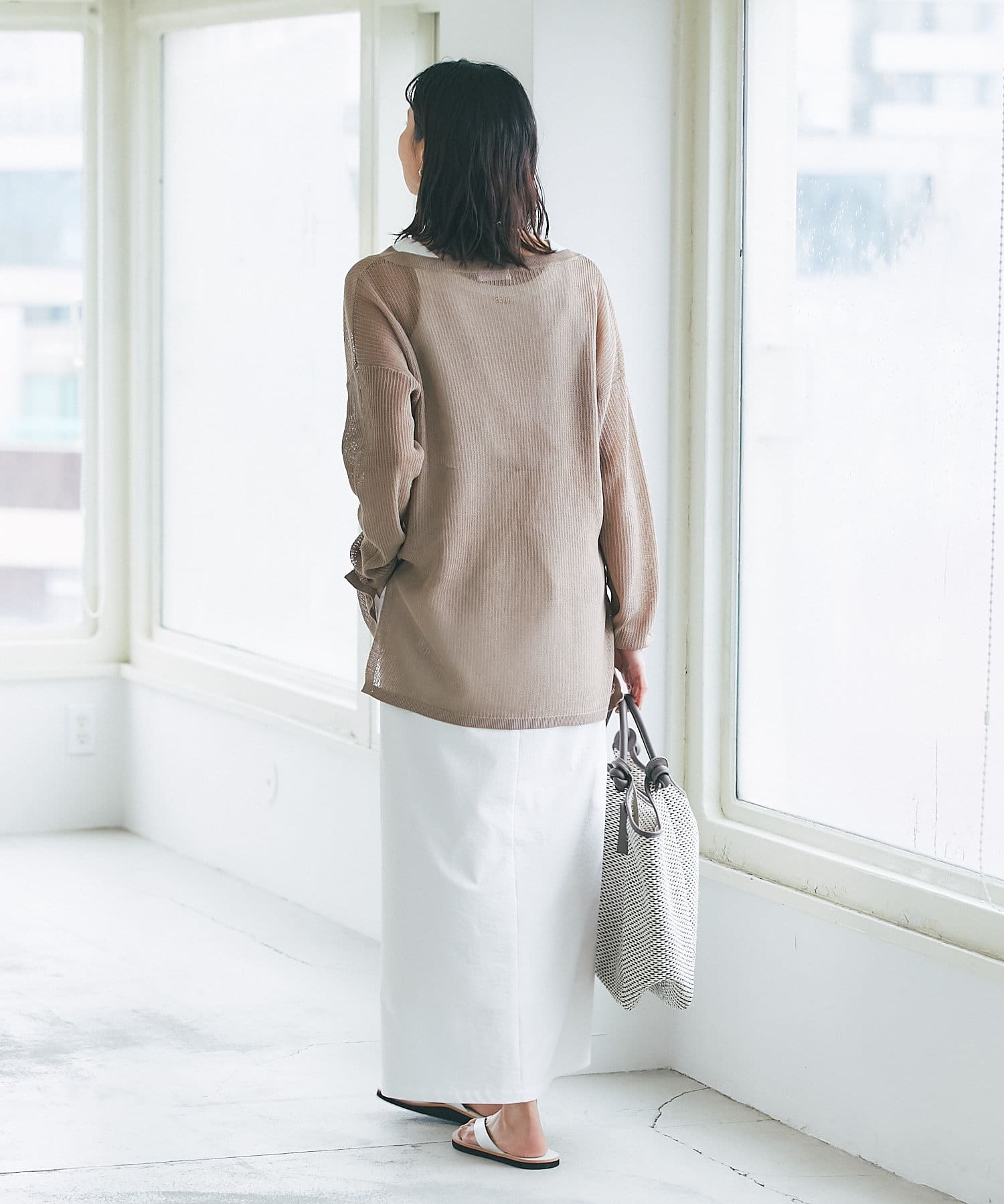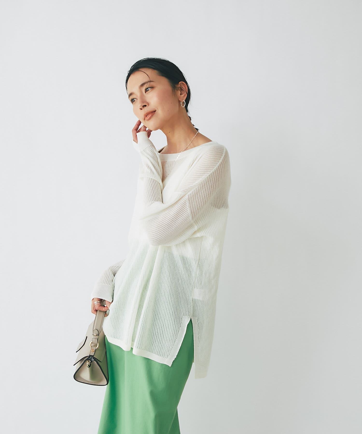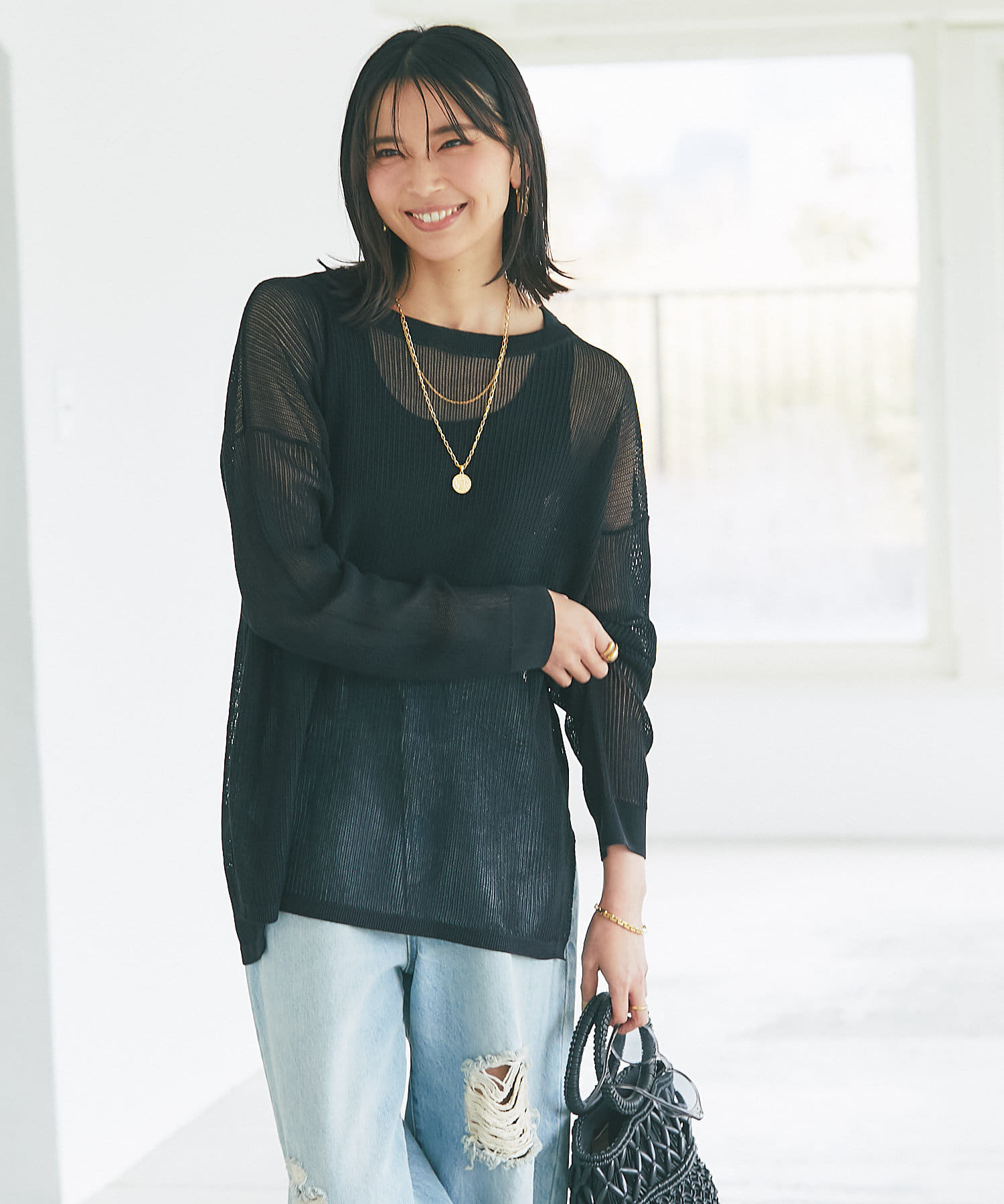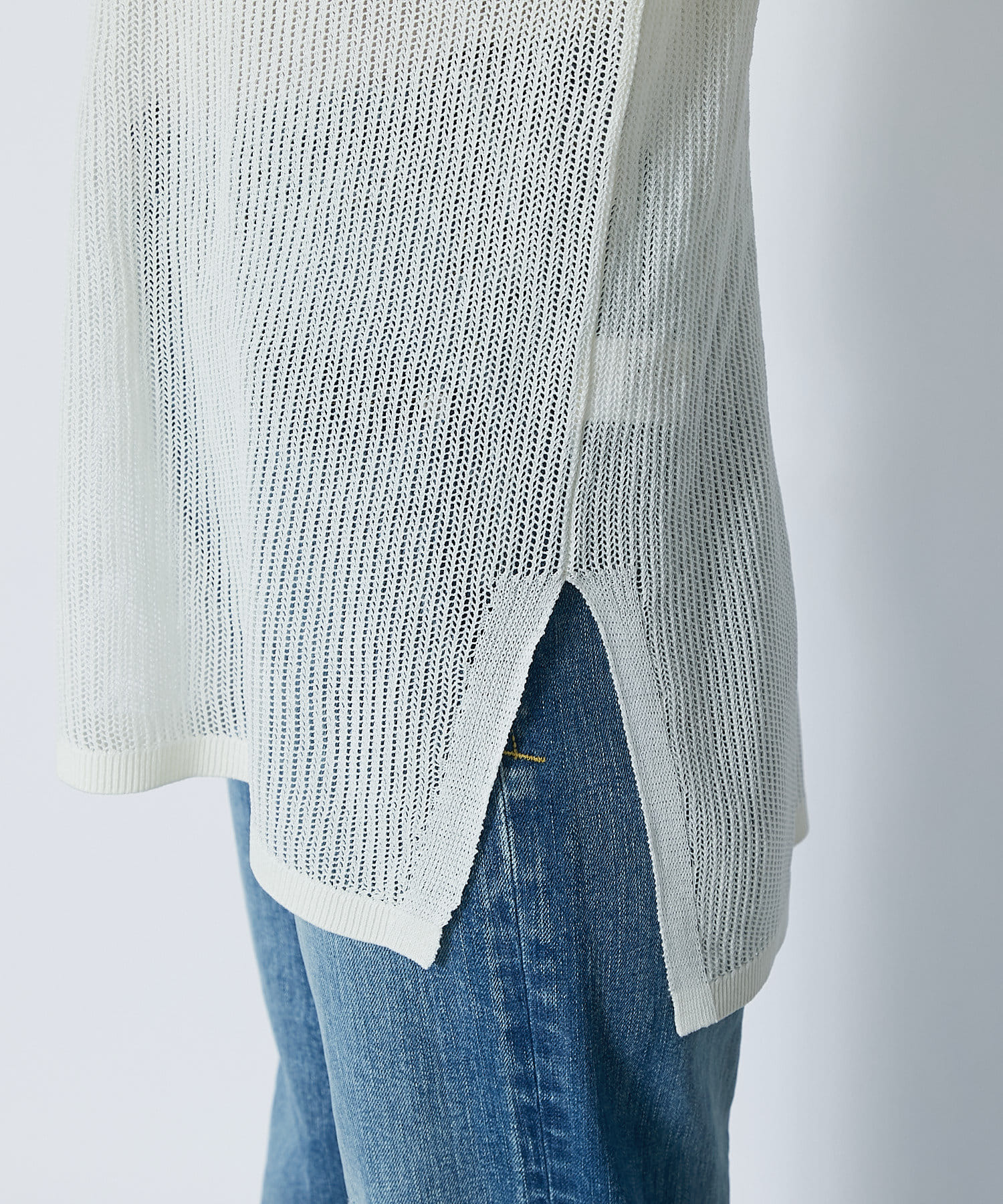 目の細かなメッシュを採用したナチュラルな透け感と、体型カバーできる着丈が大人にピッタリ。