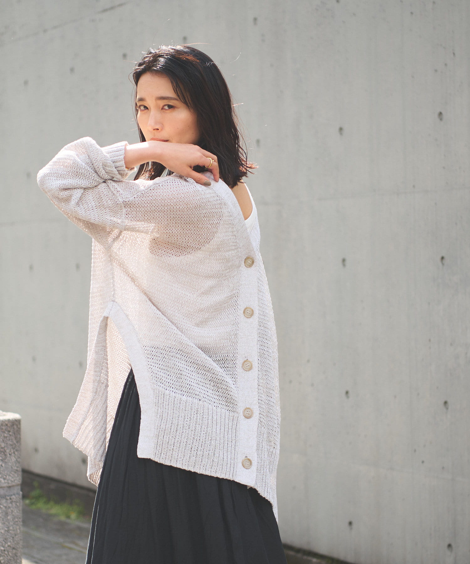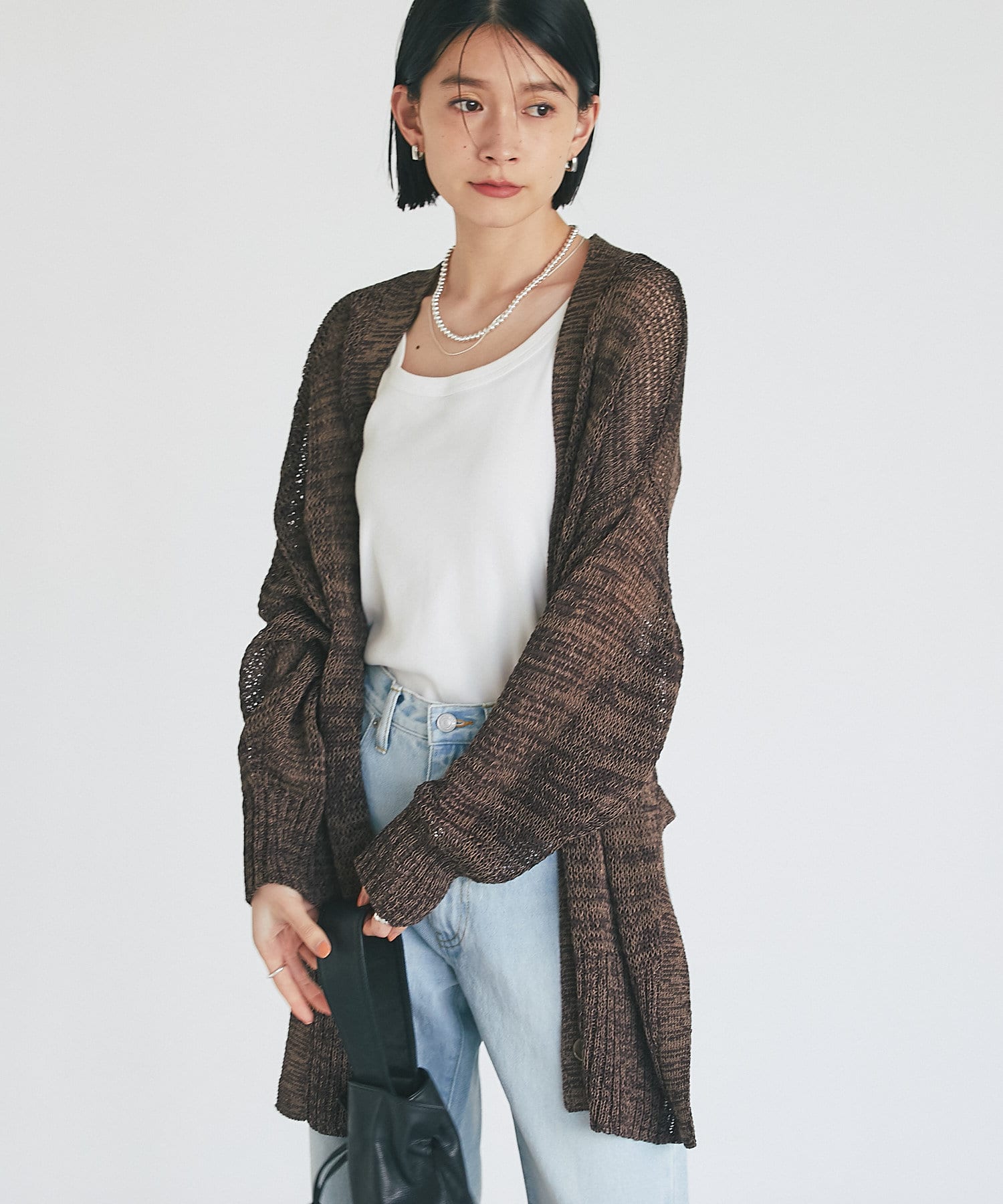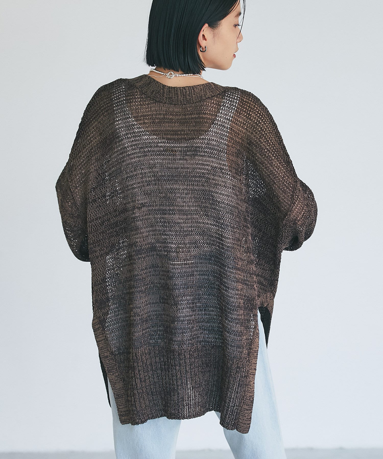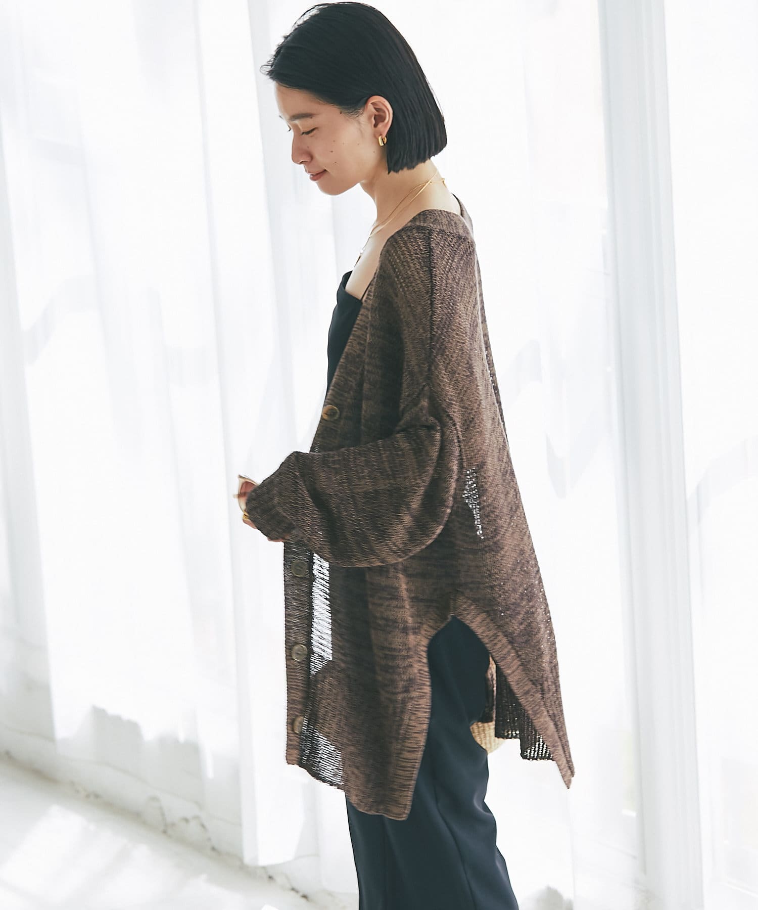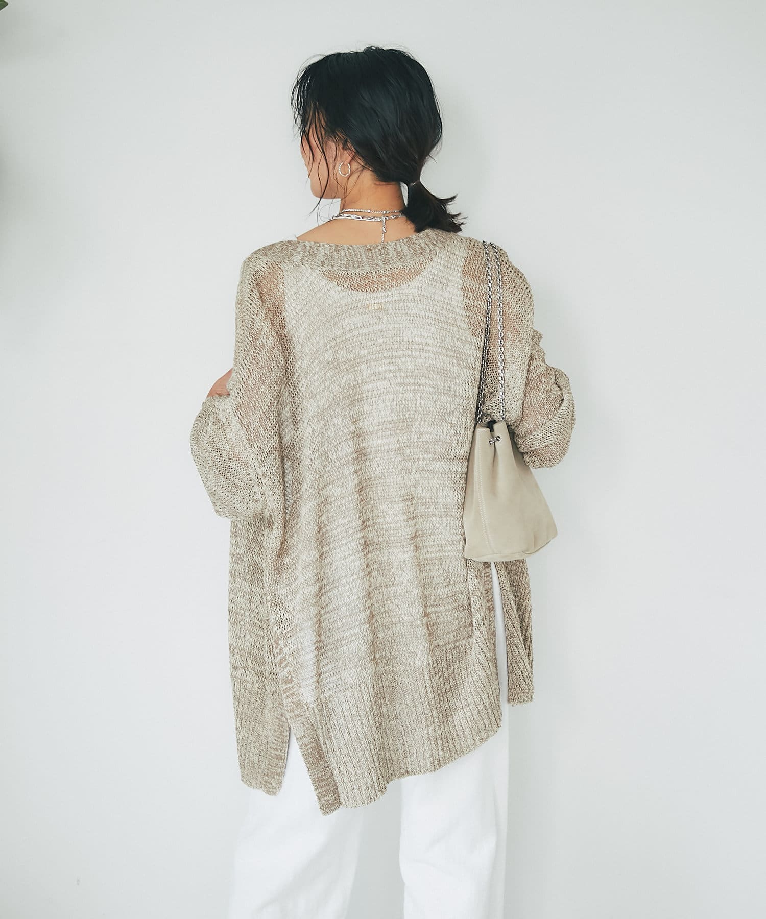 透け感を気にせず、通常のニットカーディガンを着用する際と同じようにコーディネートしていただいても素敵に着こなしていただけます。