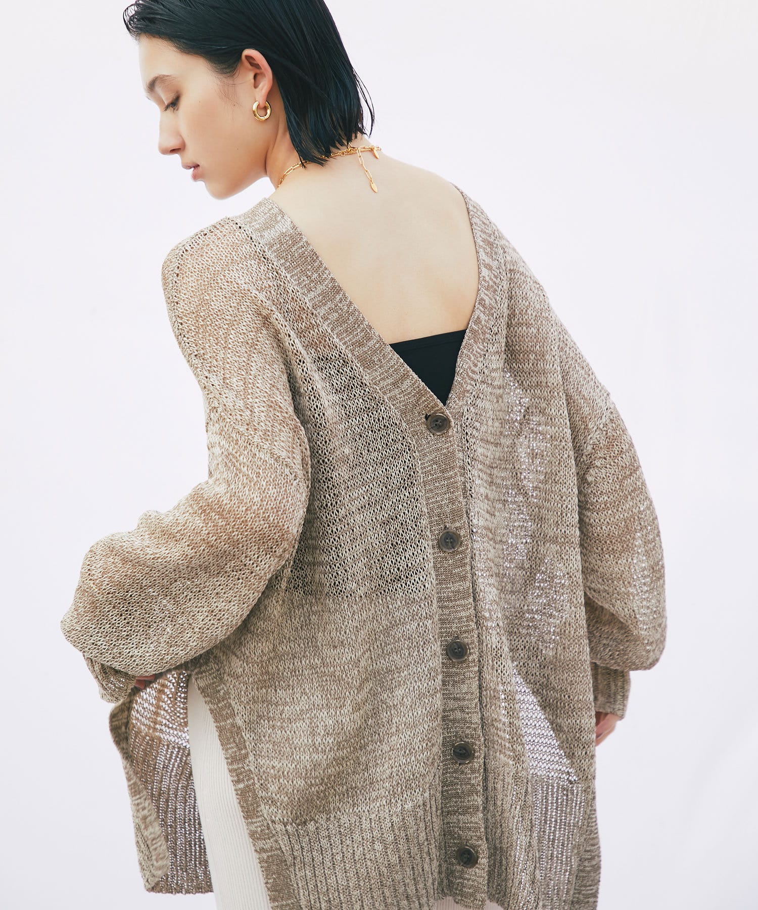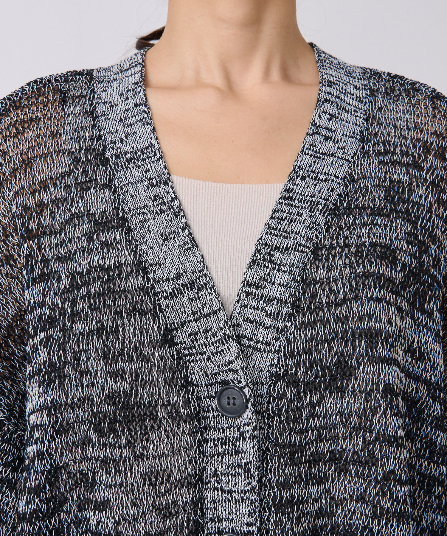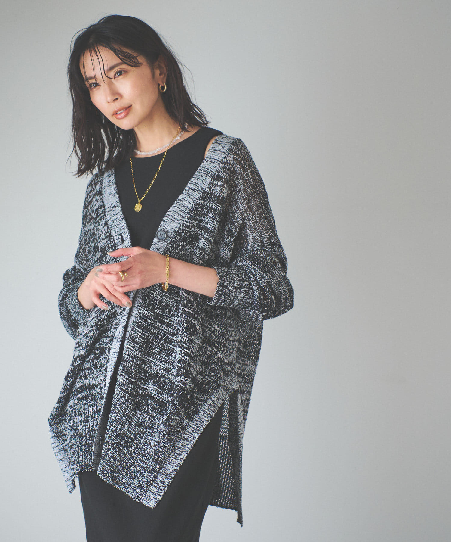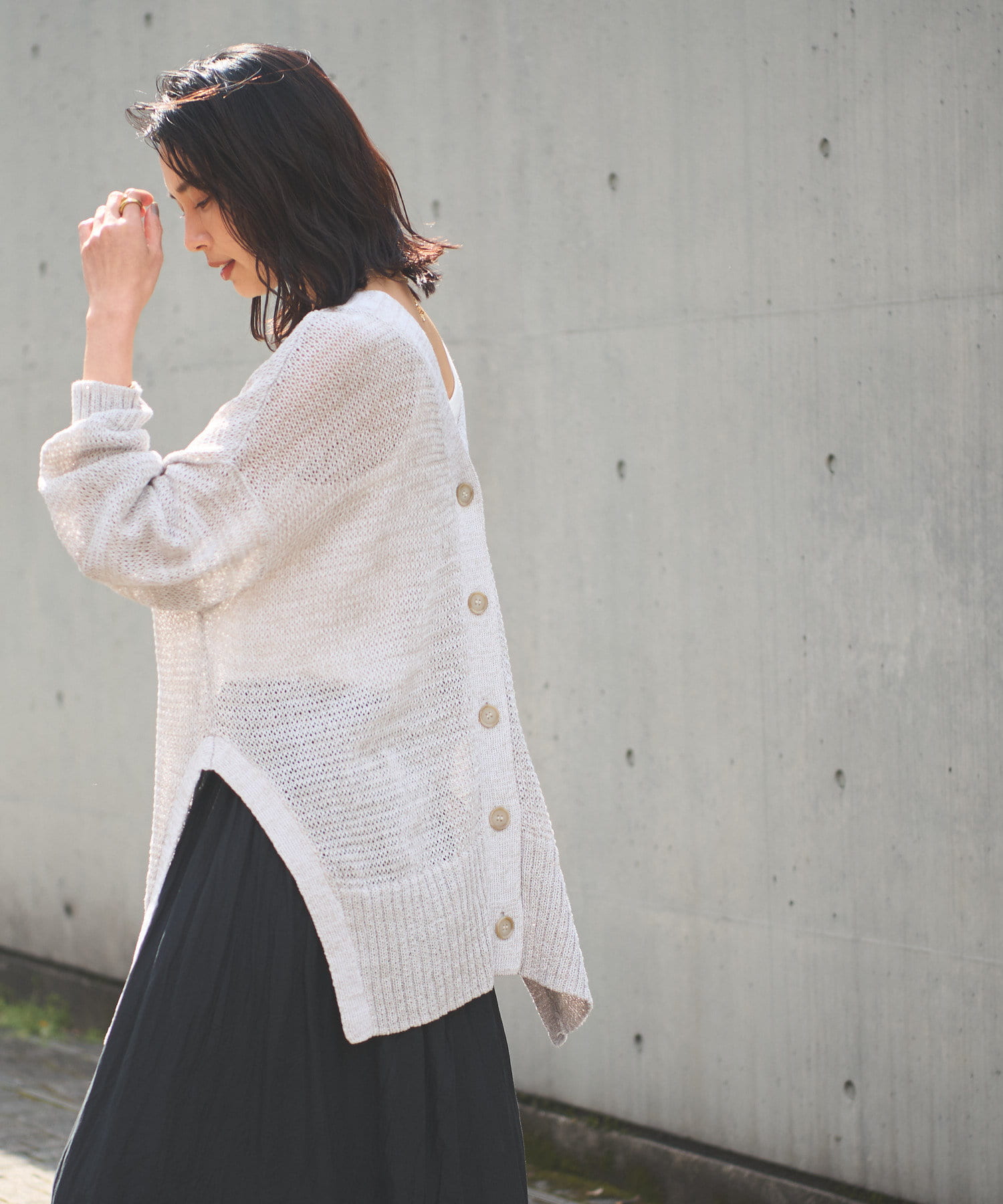 透け感を気にせず、通常のニットカーディガンを着用する際と同じようにコーディネートしていただいても素敵に着こなしていただけます。