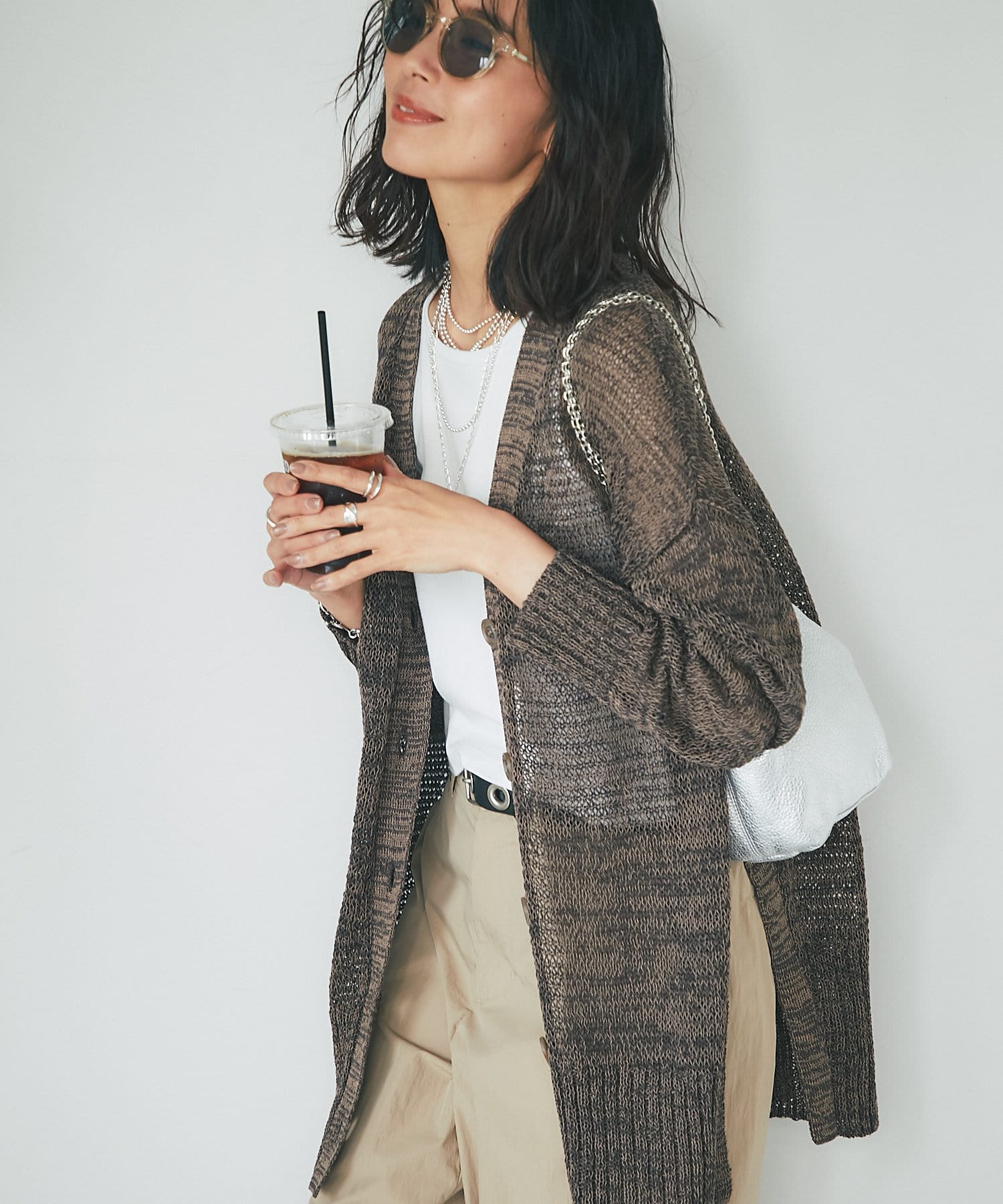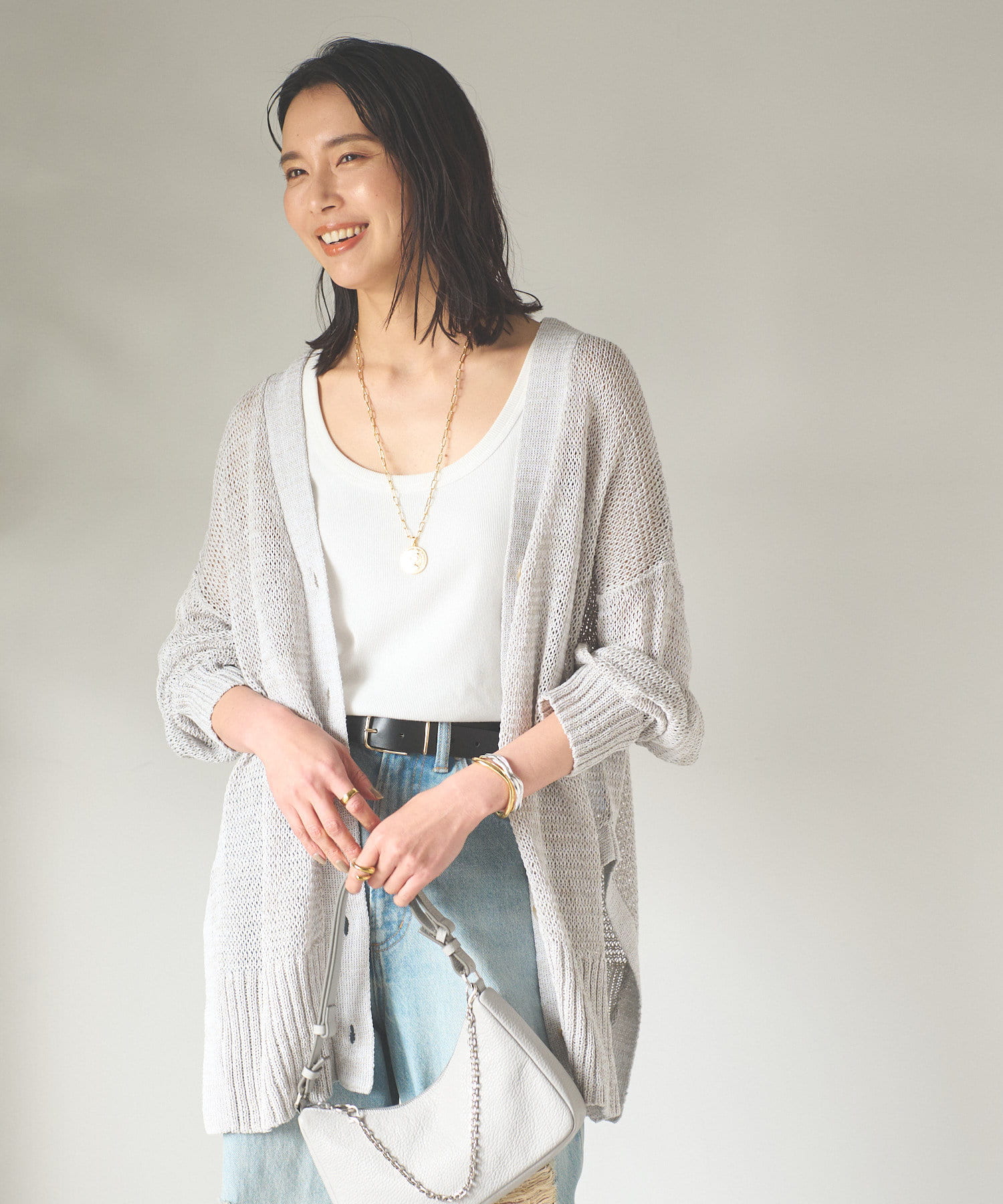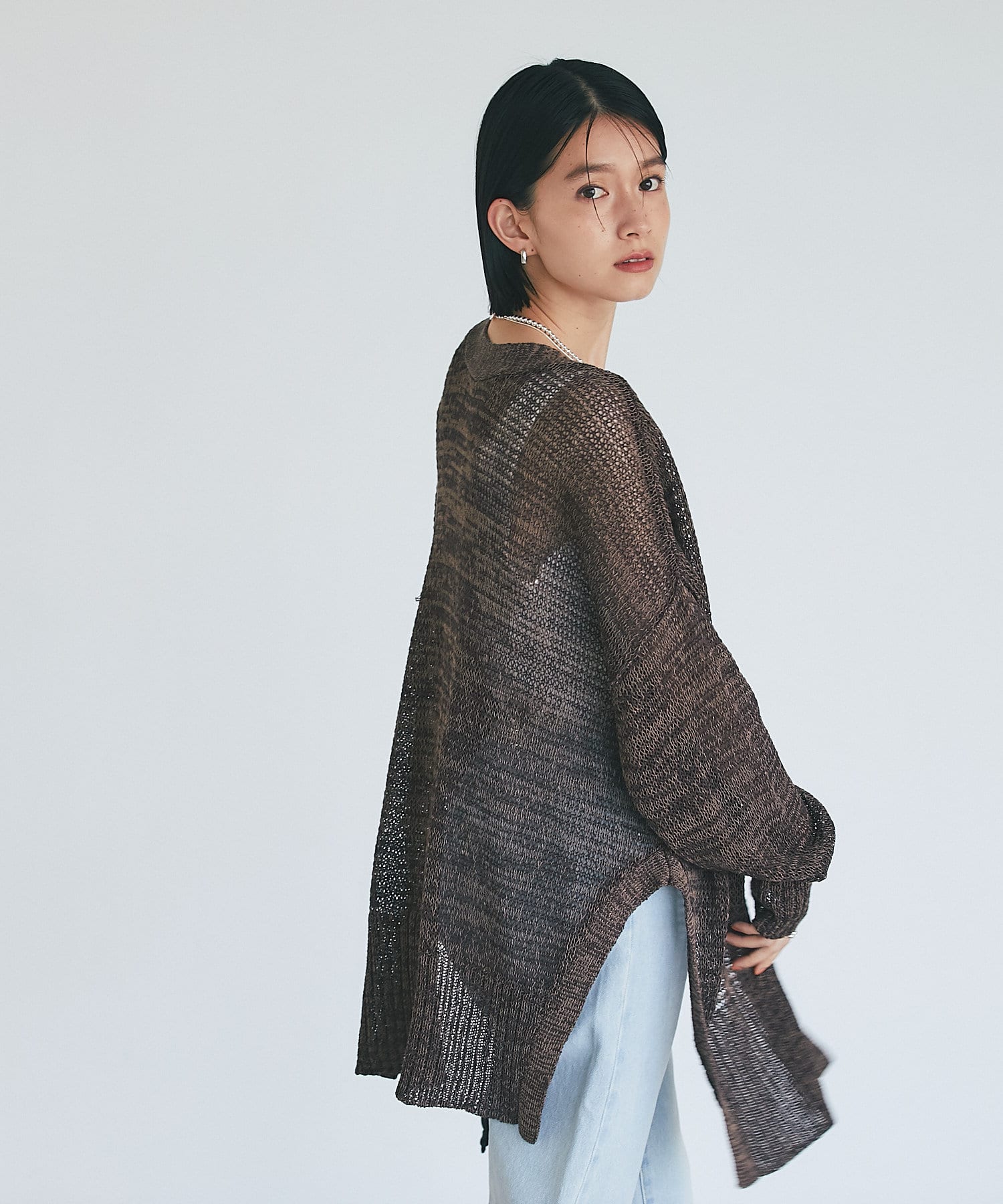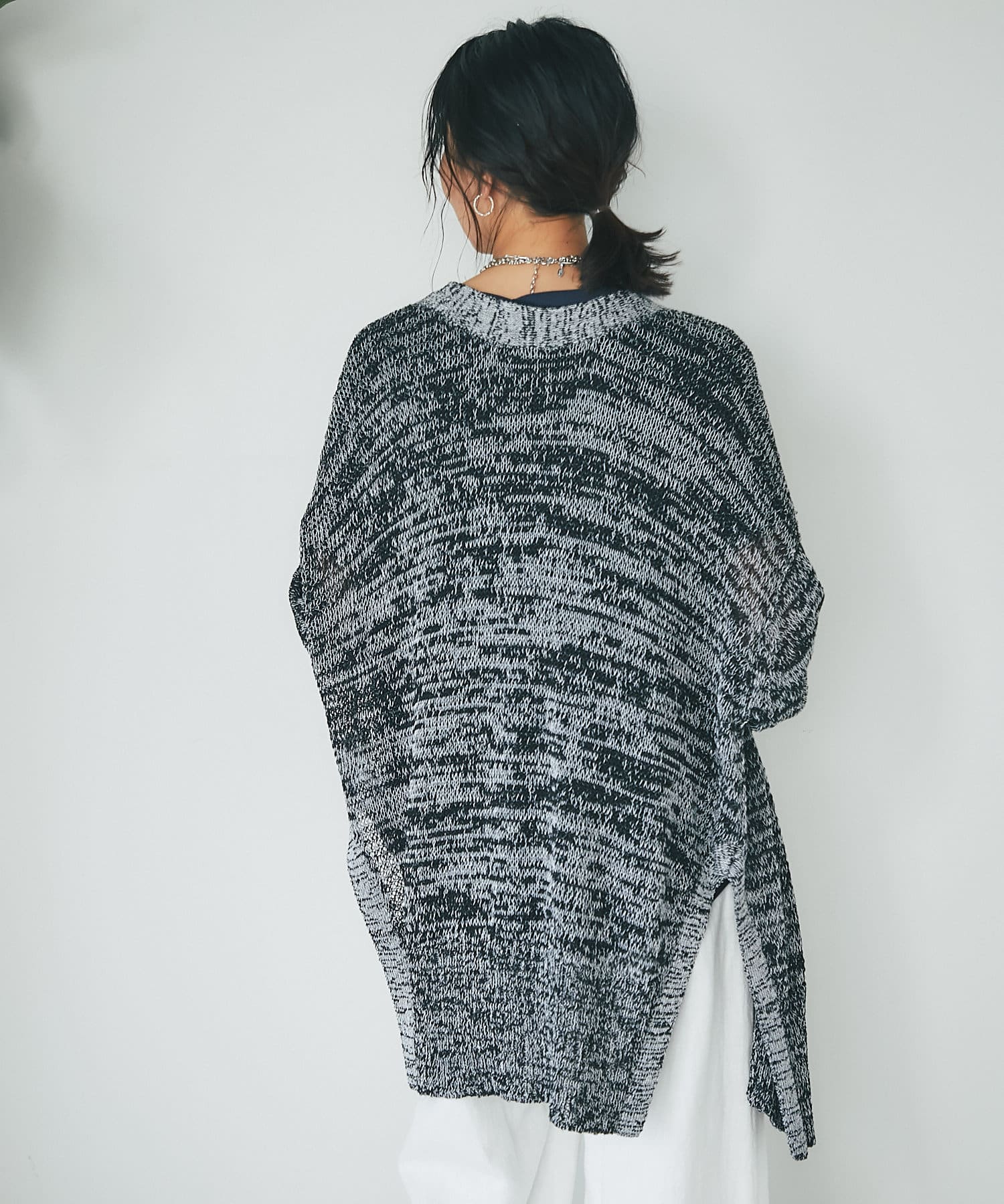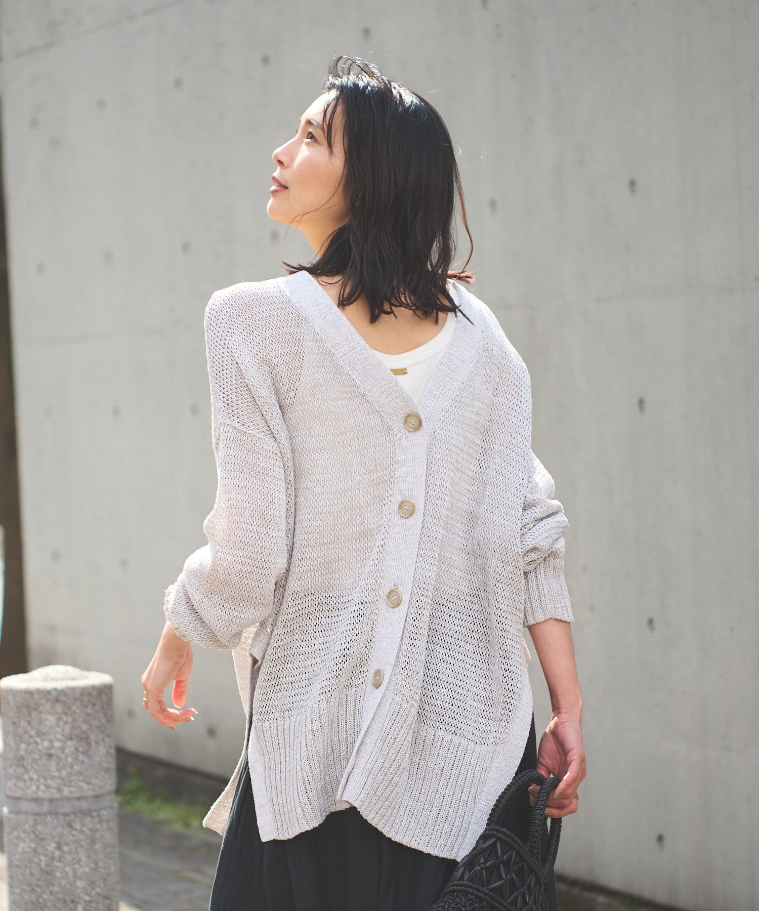 透け感を気にせず、通常のニットカーディガンを着用する際と同じようにコーディネートしていただいても素敵に着こなしていただけます。