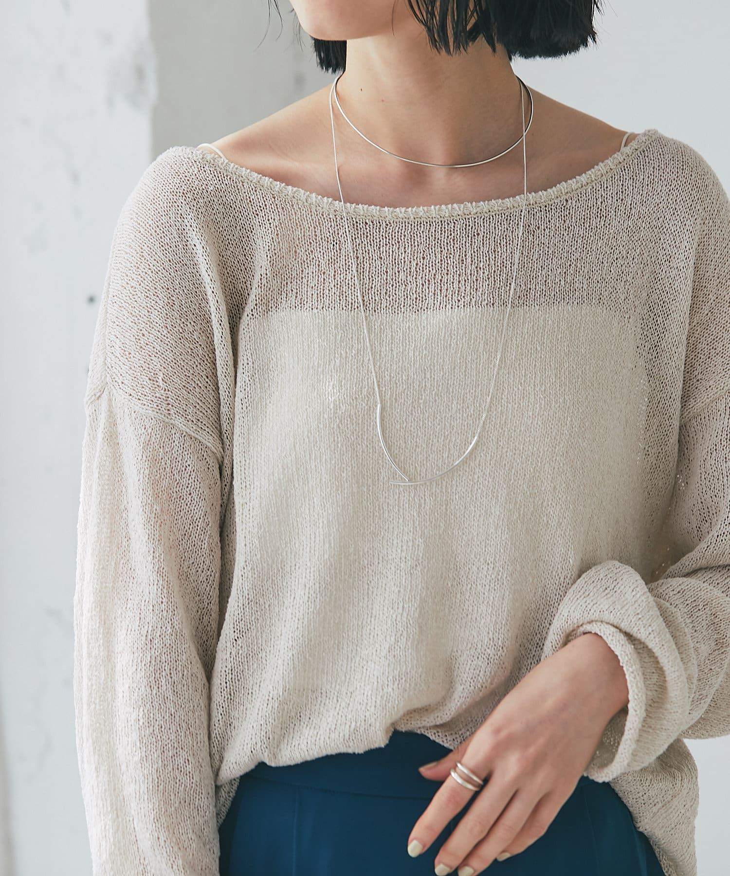 また、胸元がまっすぐなのでVネックのトップスやシャツの間から覗いてもすっきりとした印象に。