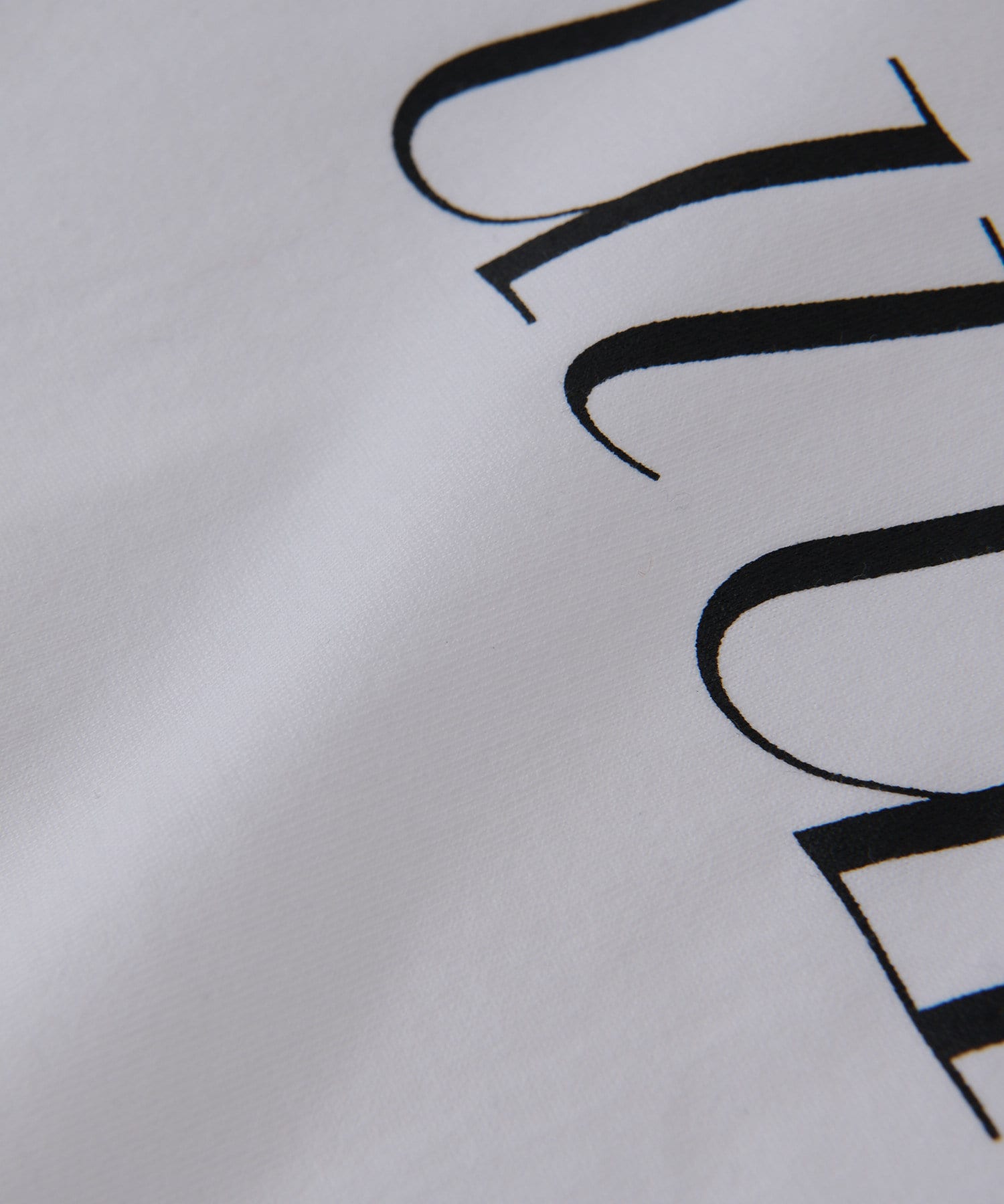 細身のフォントのロゴ入りでジャケットやベストのインナーにも便利な一枚です。