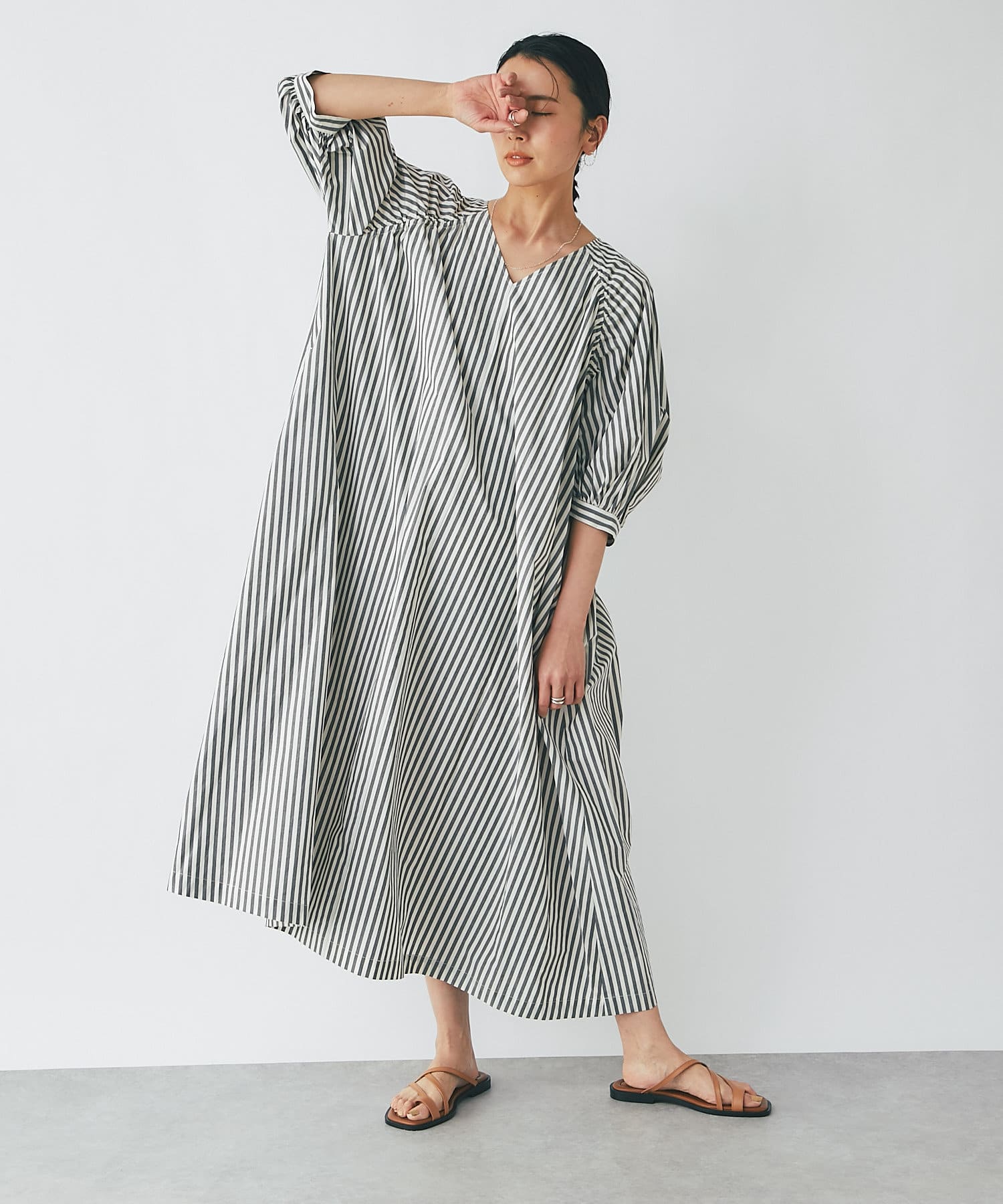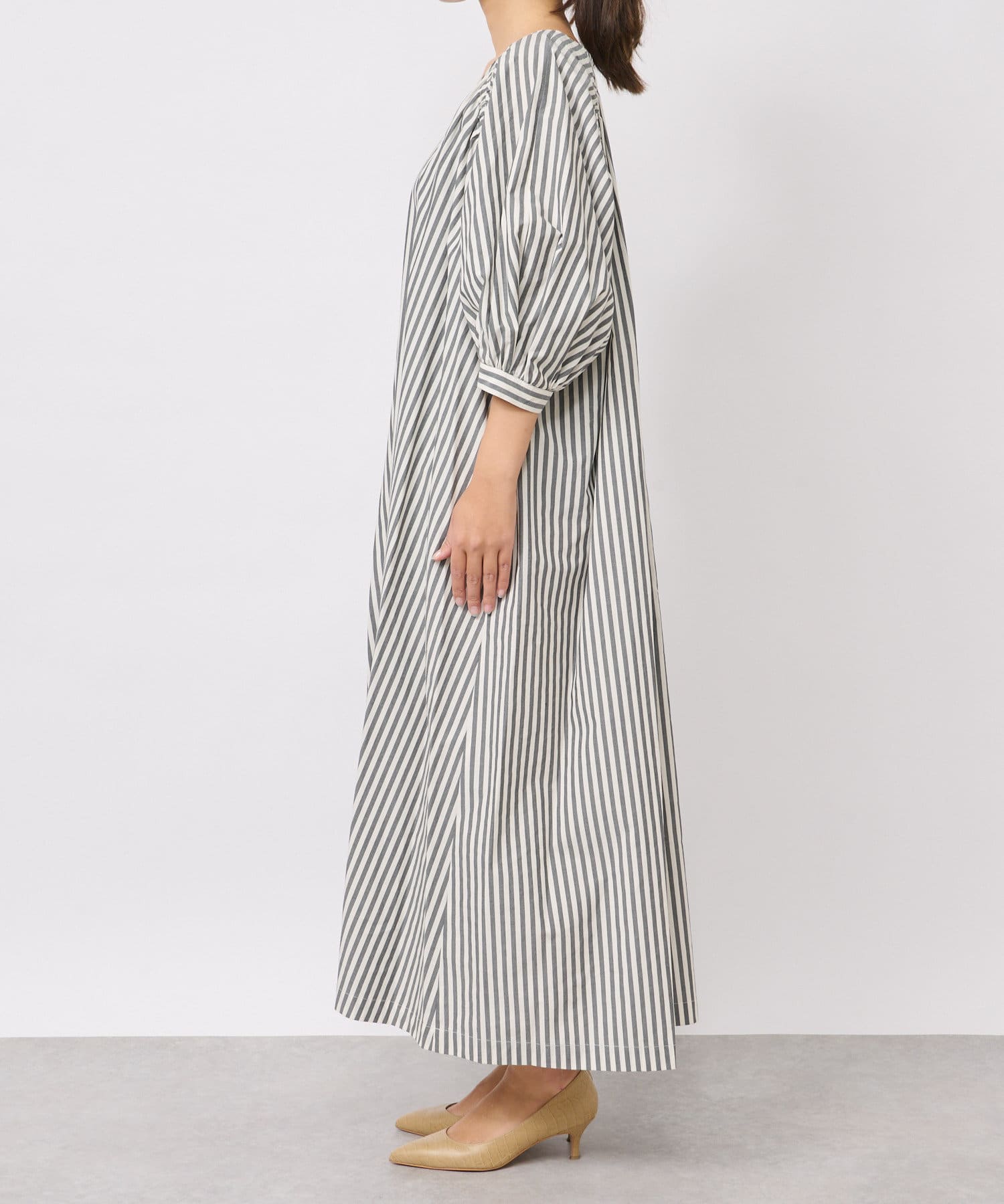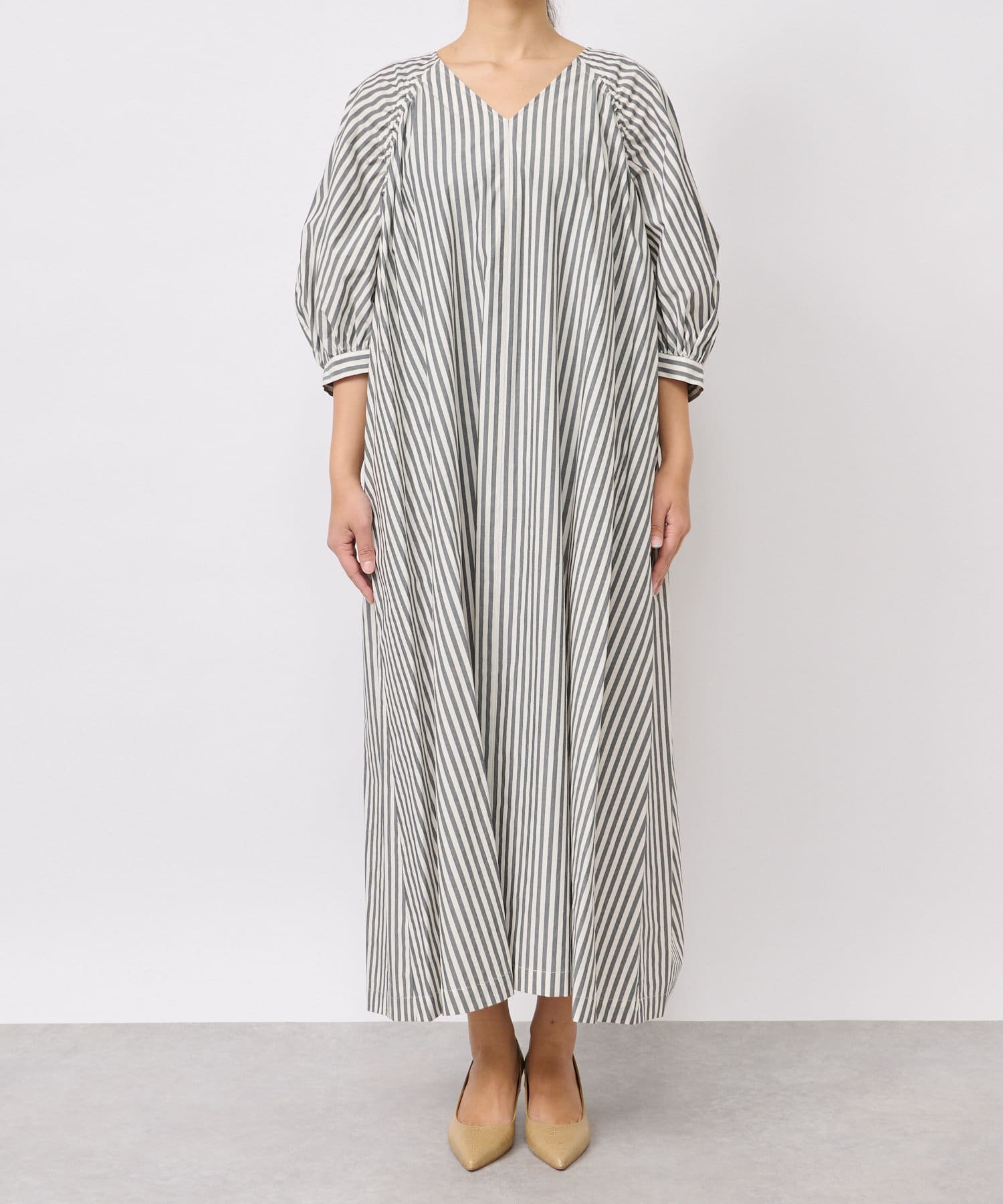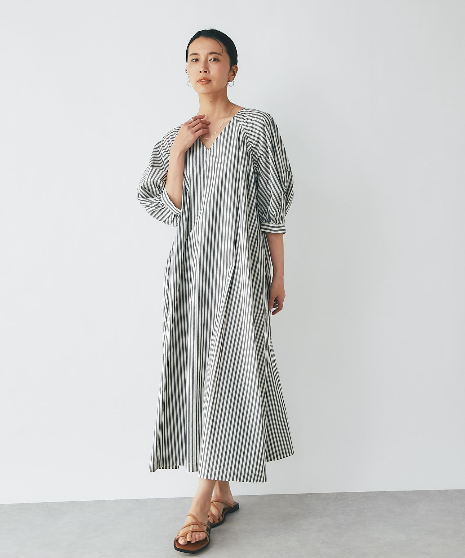 たっぷりと布を使用したワイドなマキシ丈ながら、首元のVネックやストライププリントのおかげで広がりすぎずにストンとキレイなシルエットに。