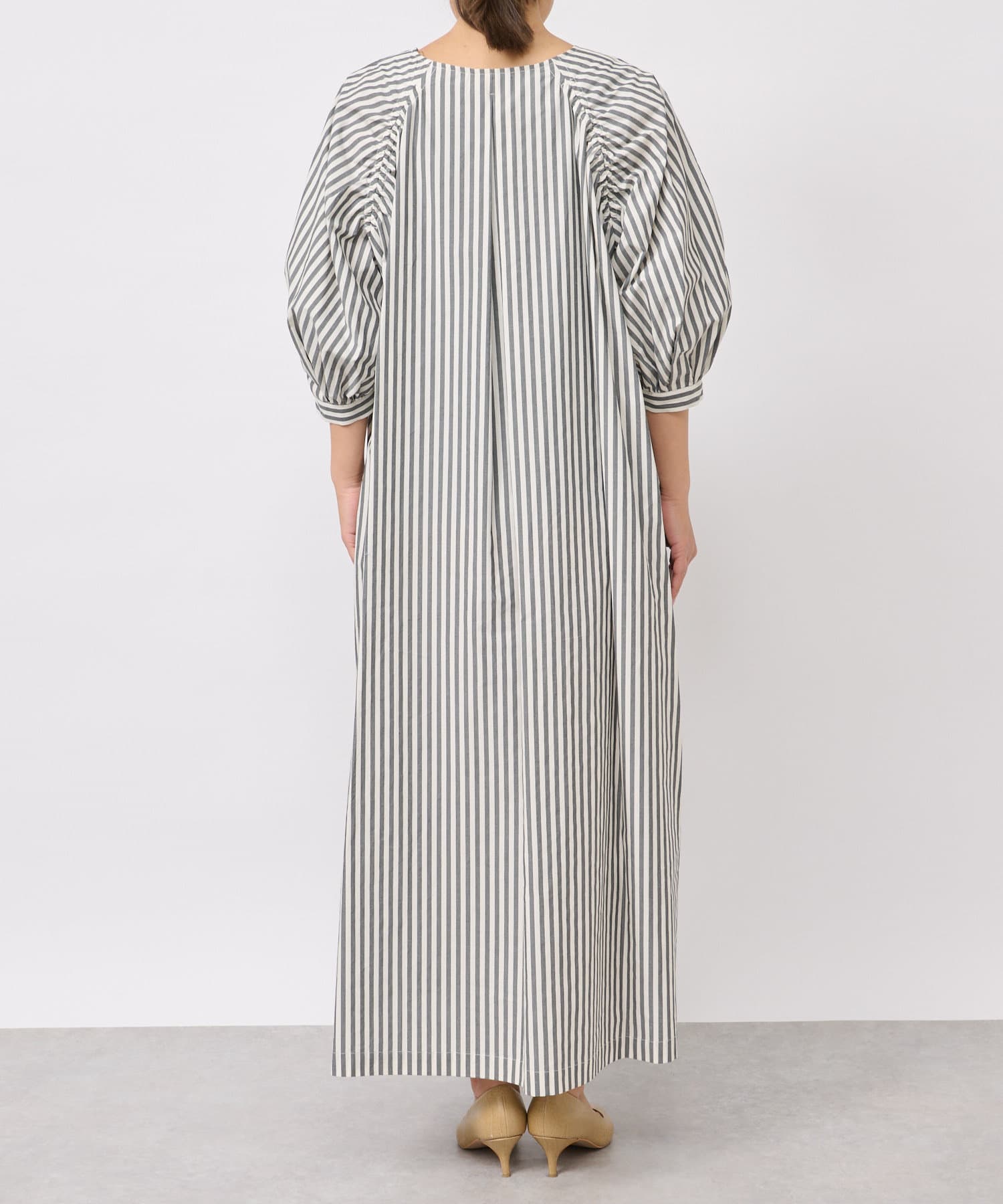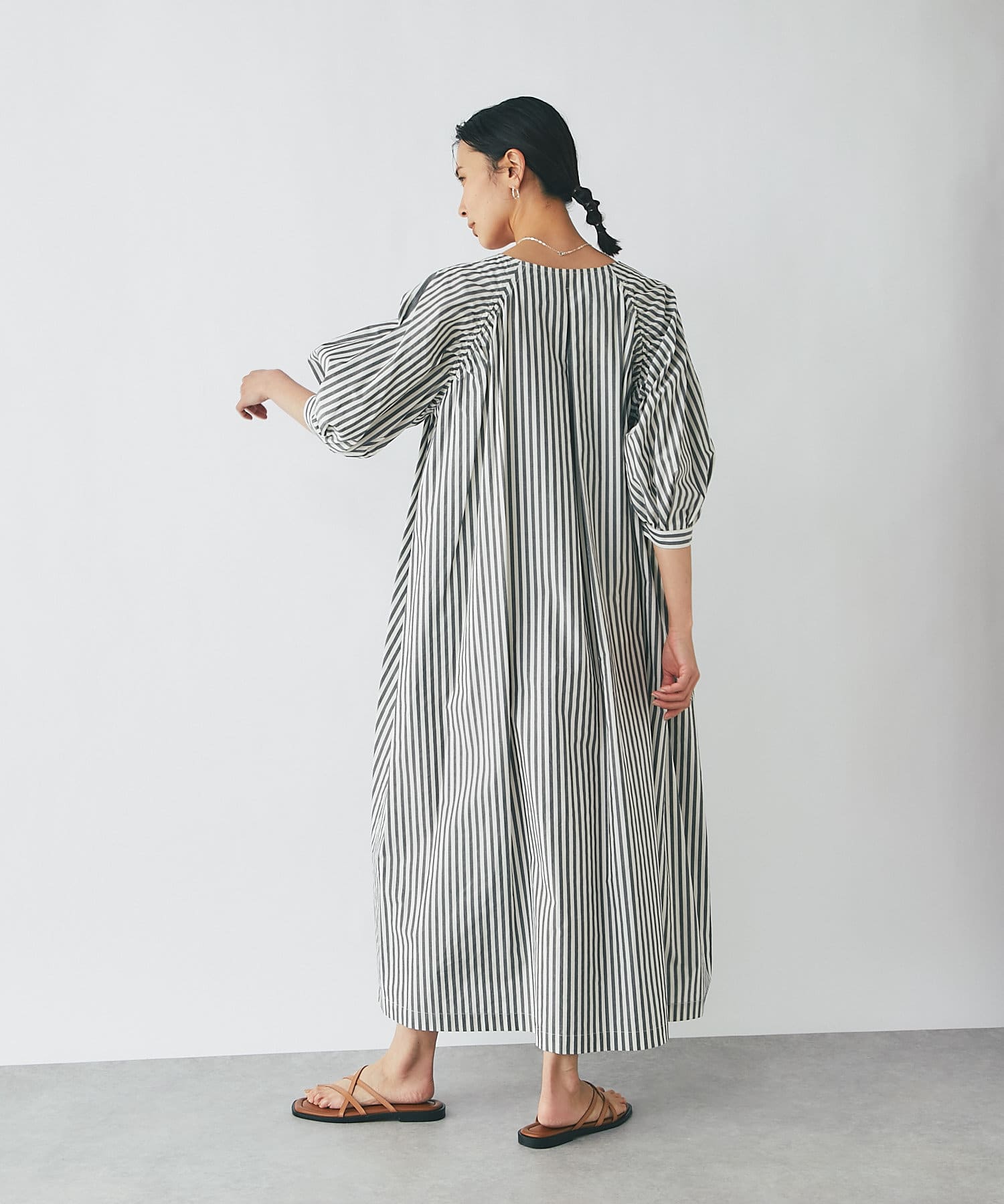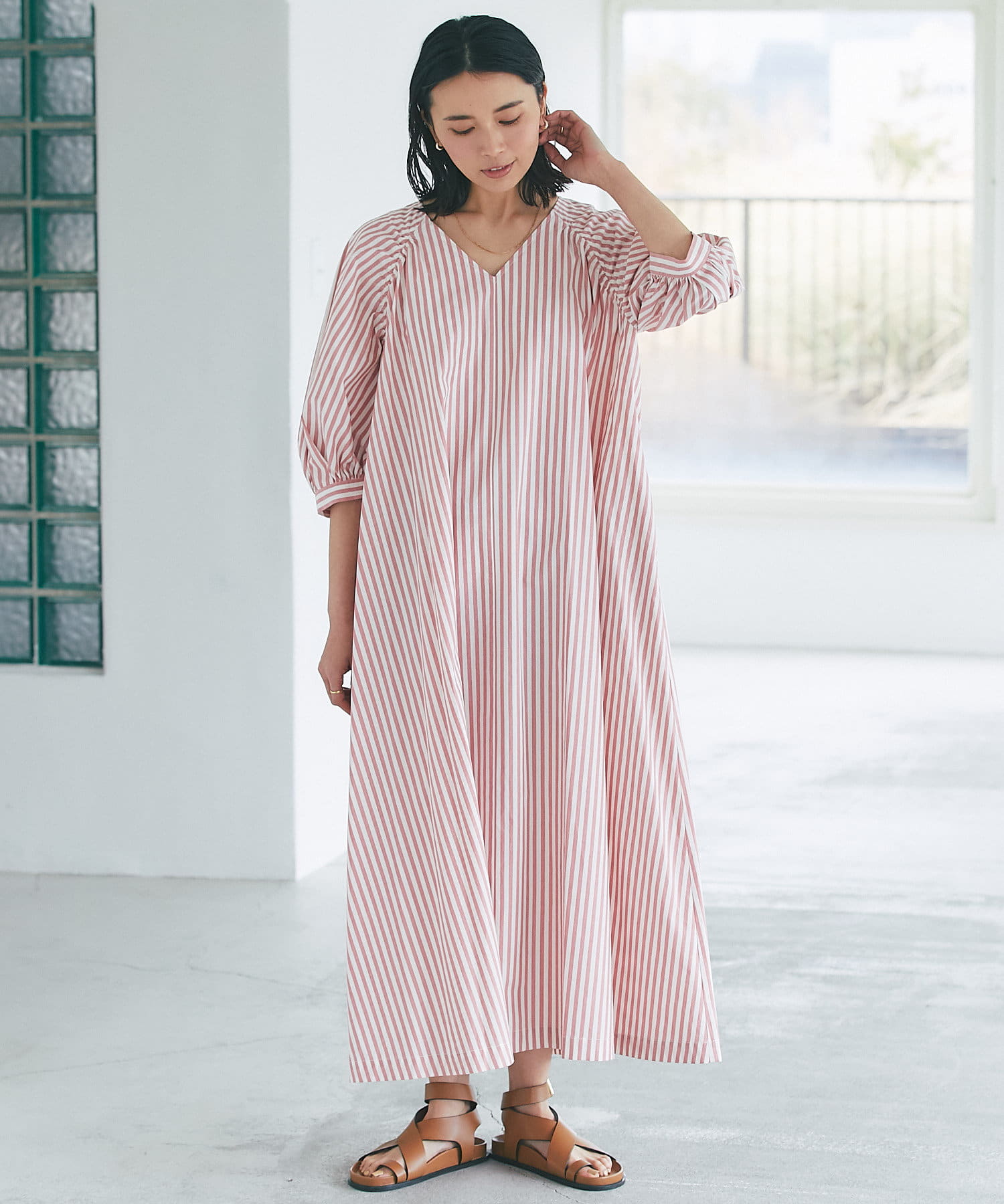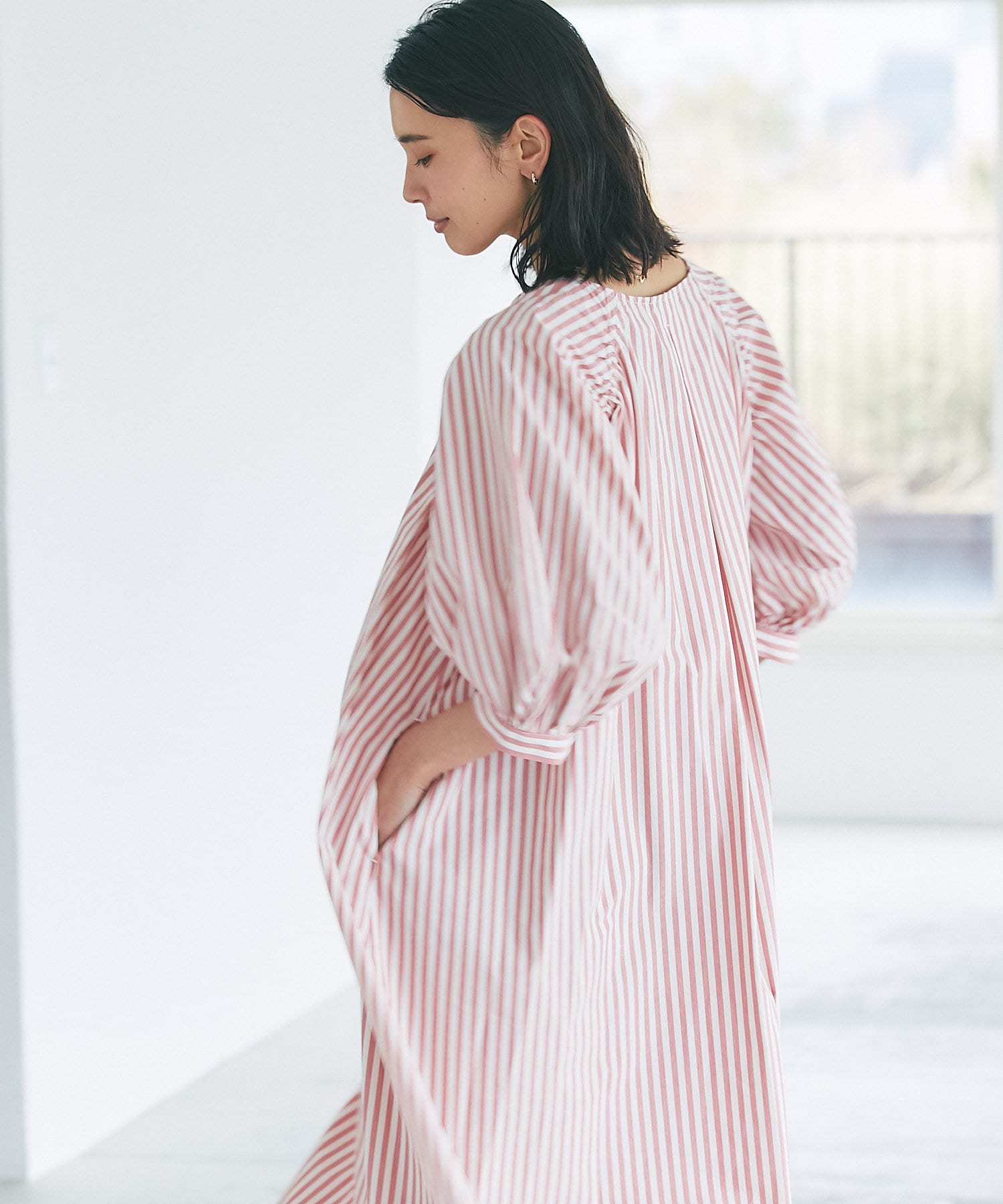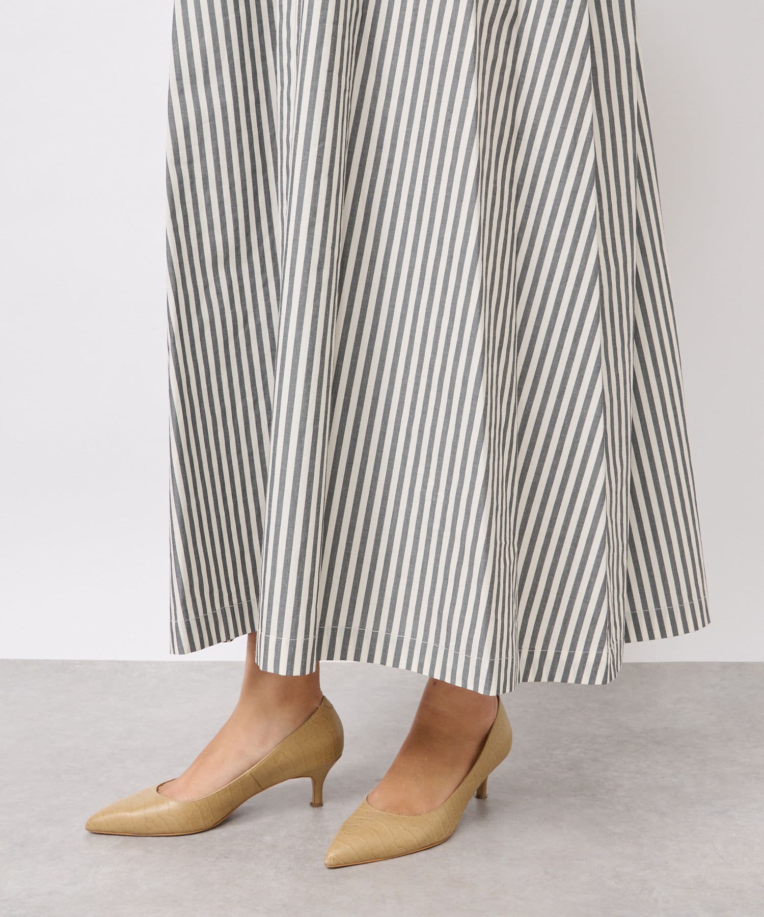 たっぷりと布を使用したワイドなマキシ丈ながら、首元のVネックやストライププリントのおかげで広がりすぎずにストンとキレイなシルエットに。