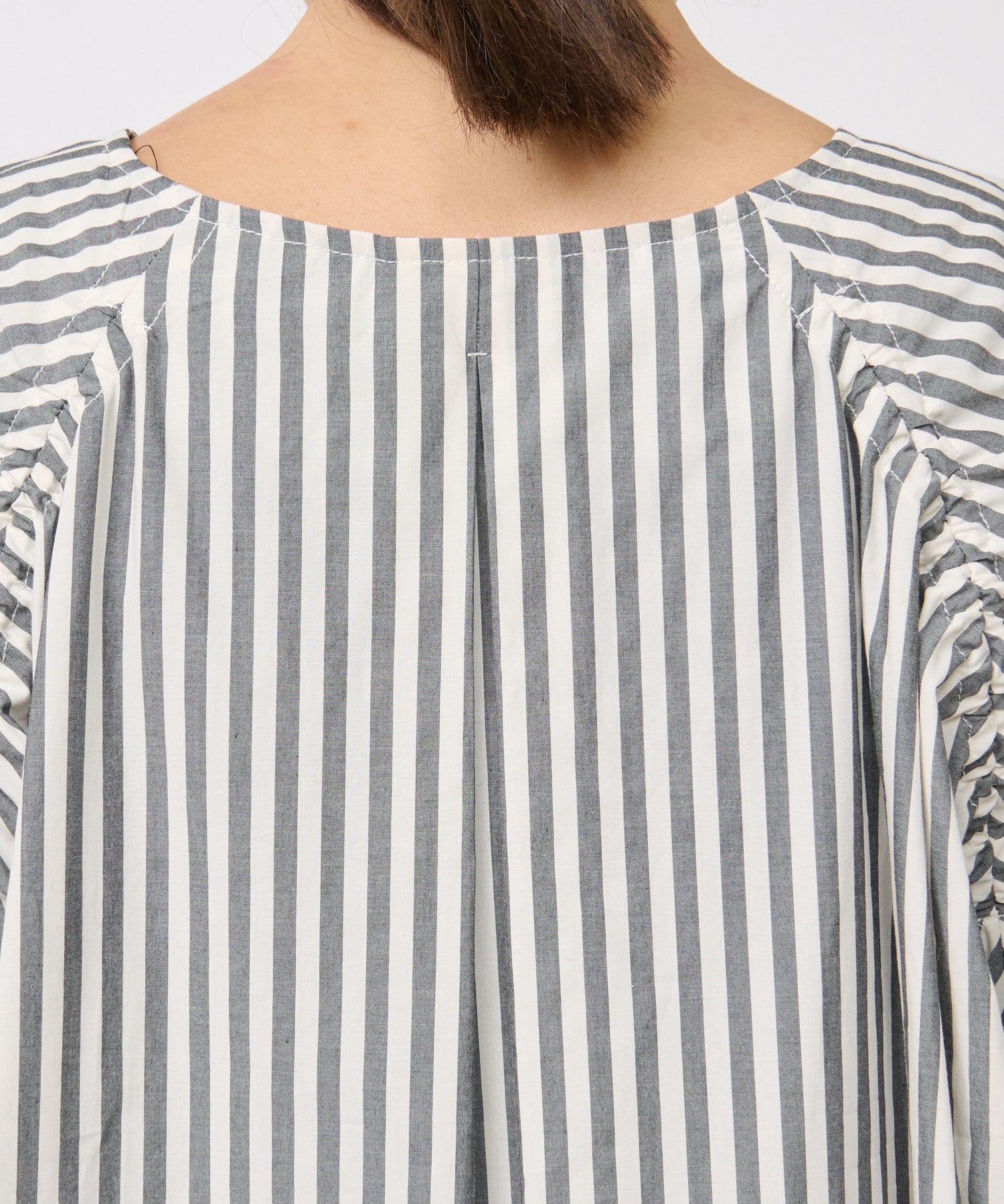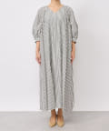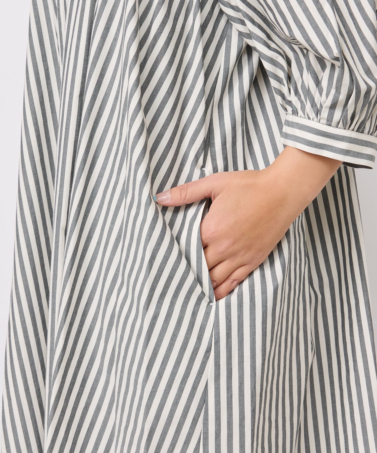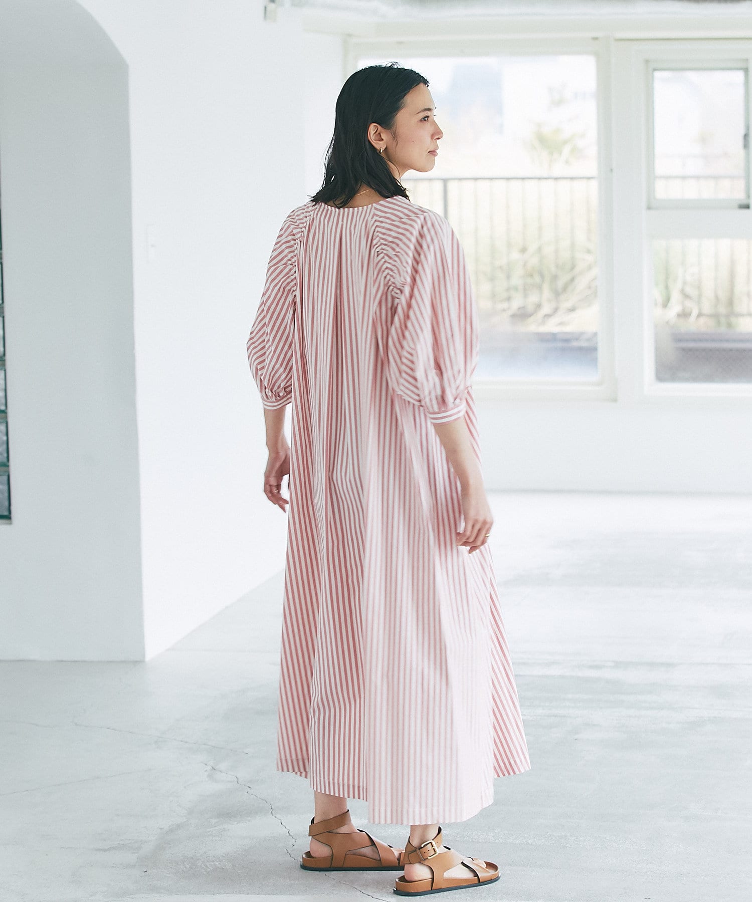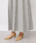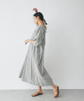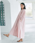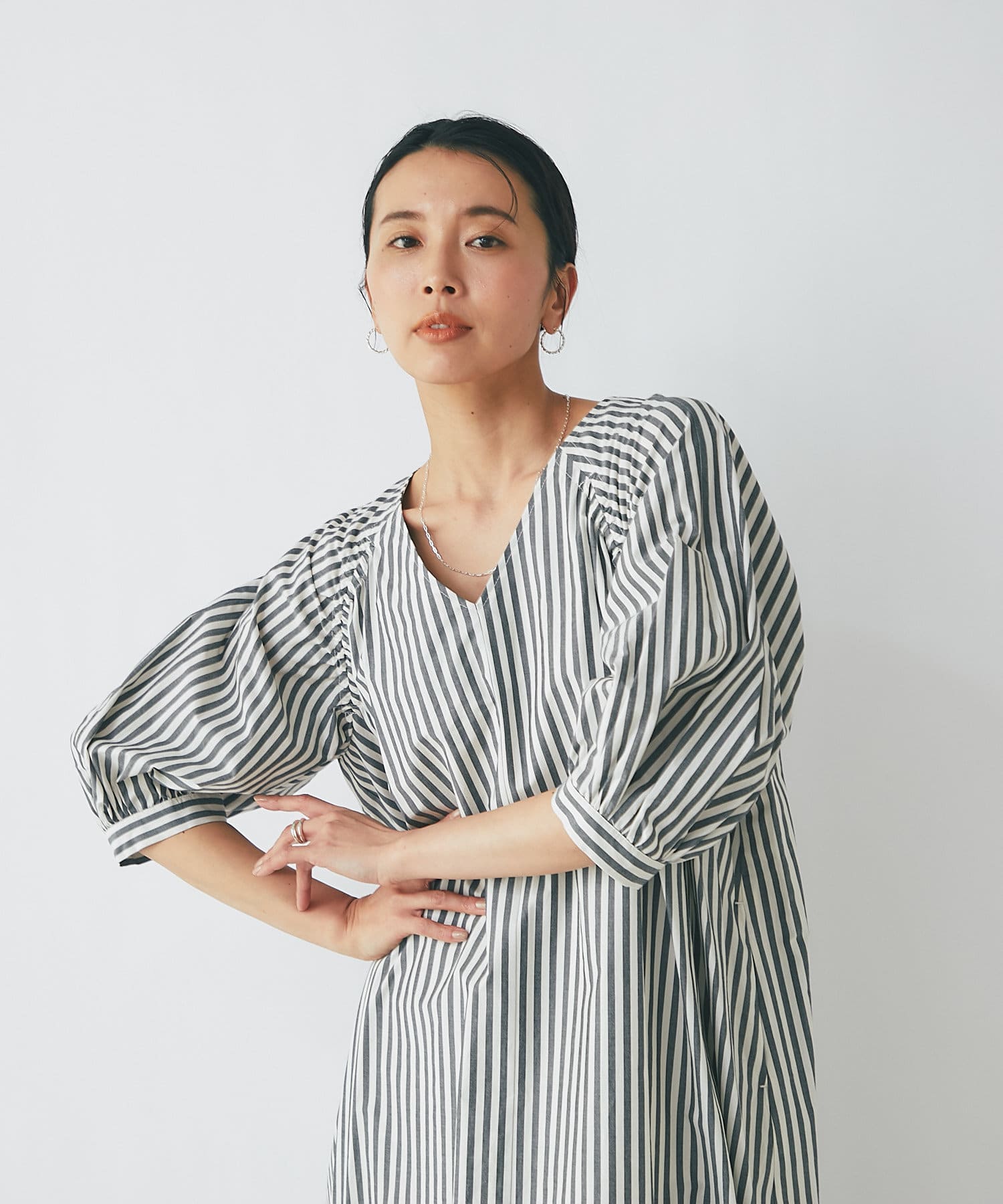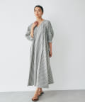 たっぷりと布を使用したワイドなマキシ丈ながら、首元のVネックやストライププリントのおかげで広がりすぎずにストンとキレイなシルエットに。