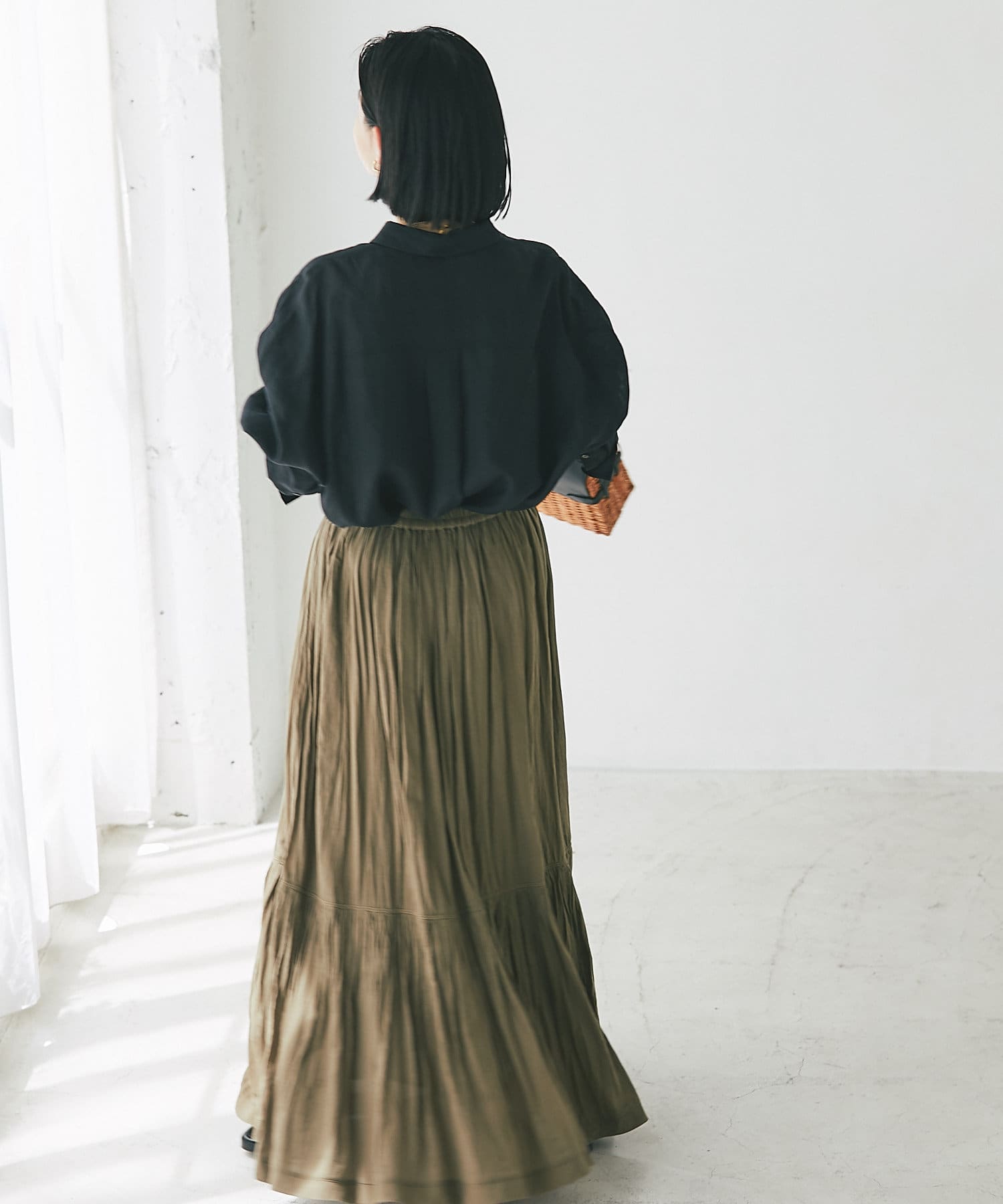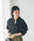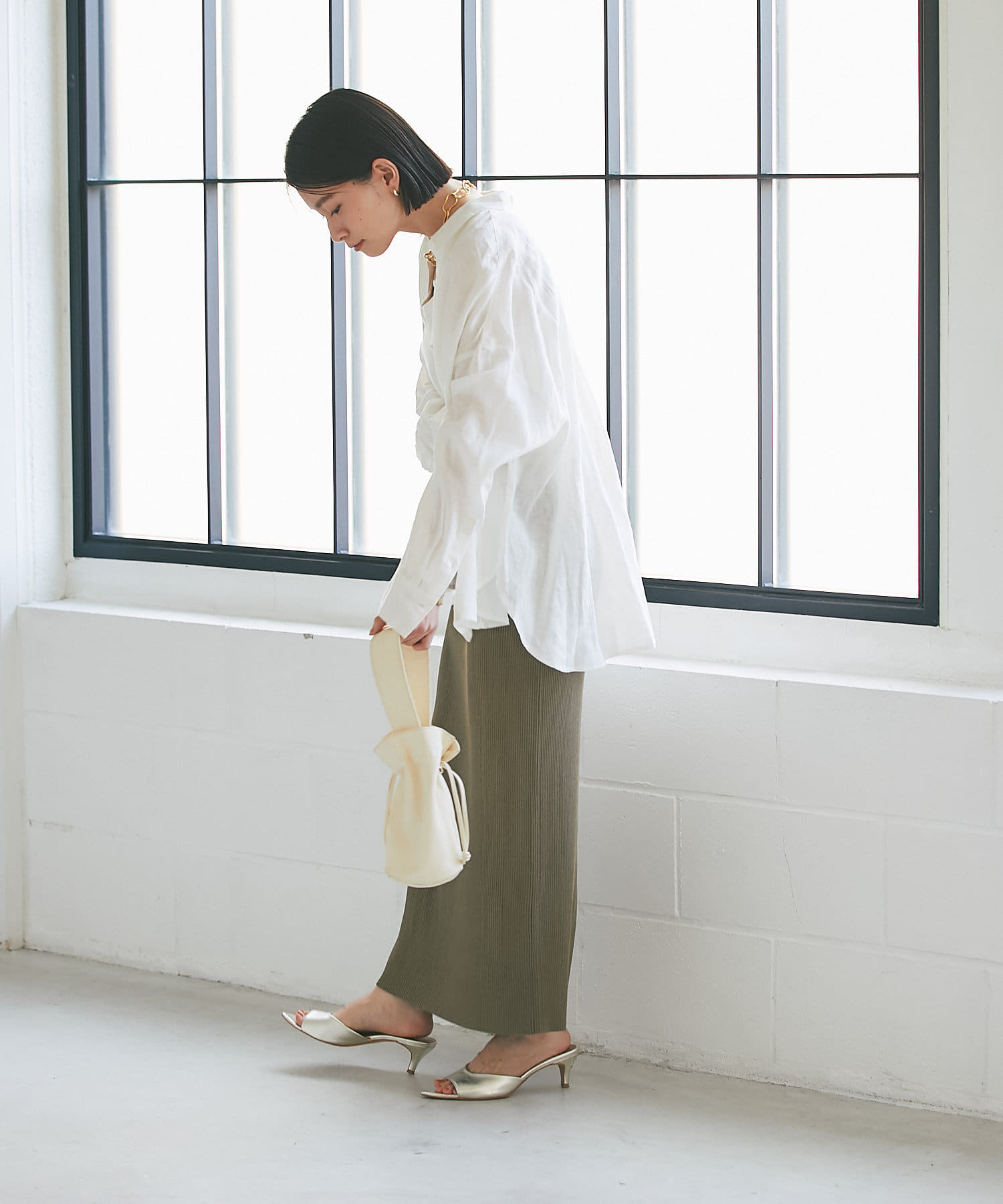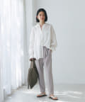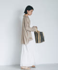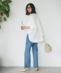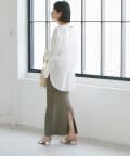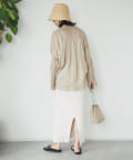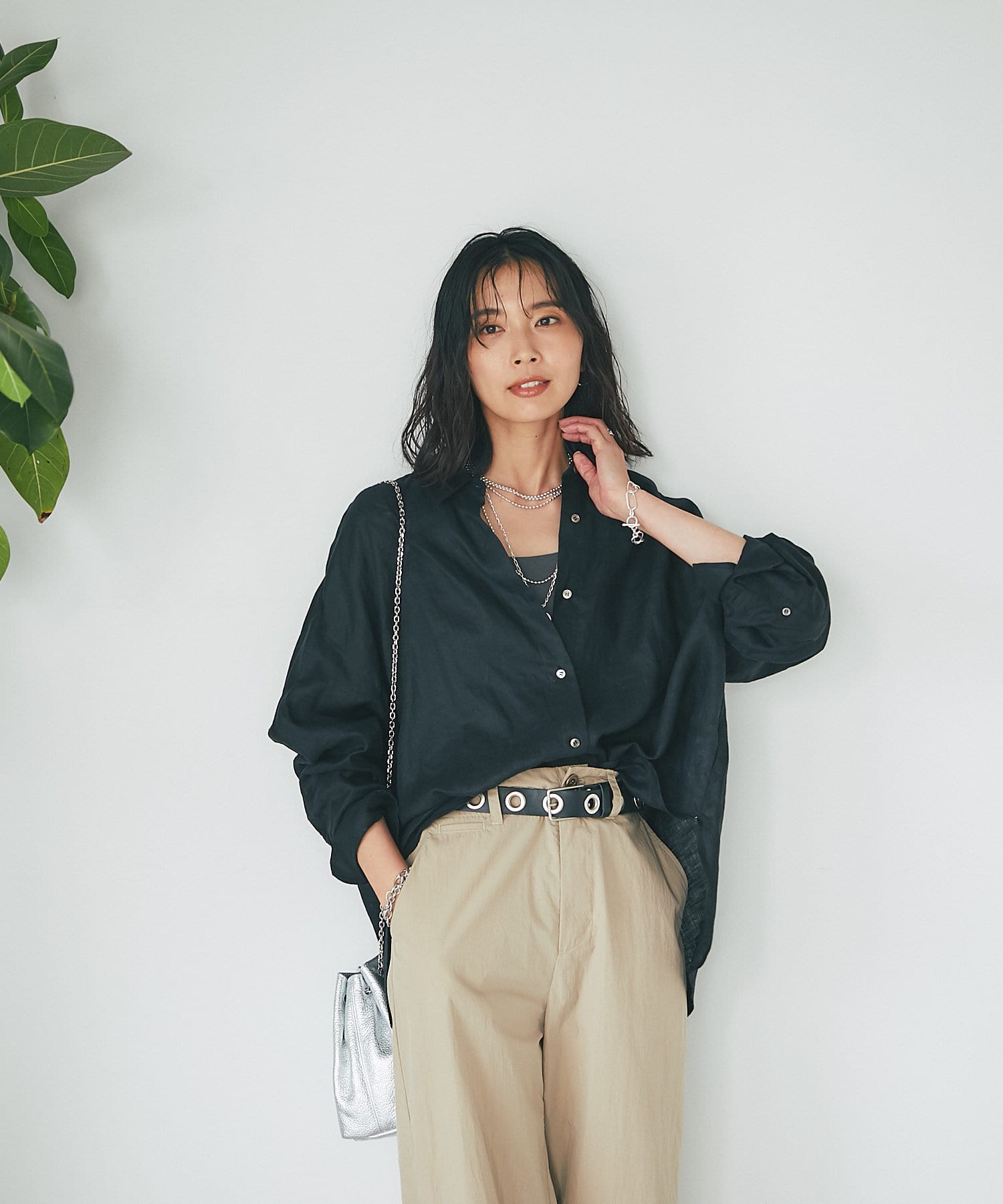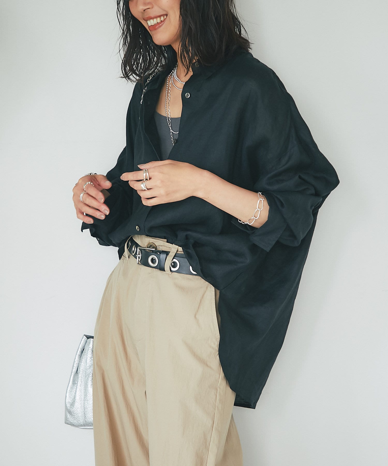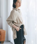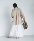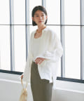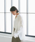 ゆったりとしたシルエットなのでタイトスカートや細身のパンツとの相性は抜群。フレアスカートなどボリュームのあるアイテムと合わせるときはボタンを少し開けたり袖をまくる、フロント部分の裾を片方だけ入れるなどの工夫ですっきり着ていただけます。
