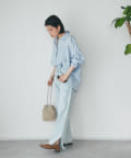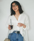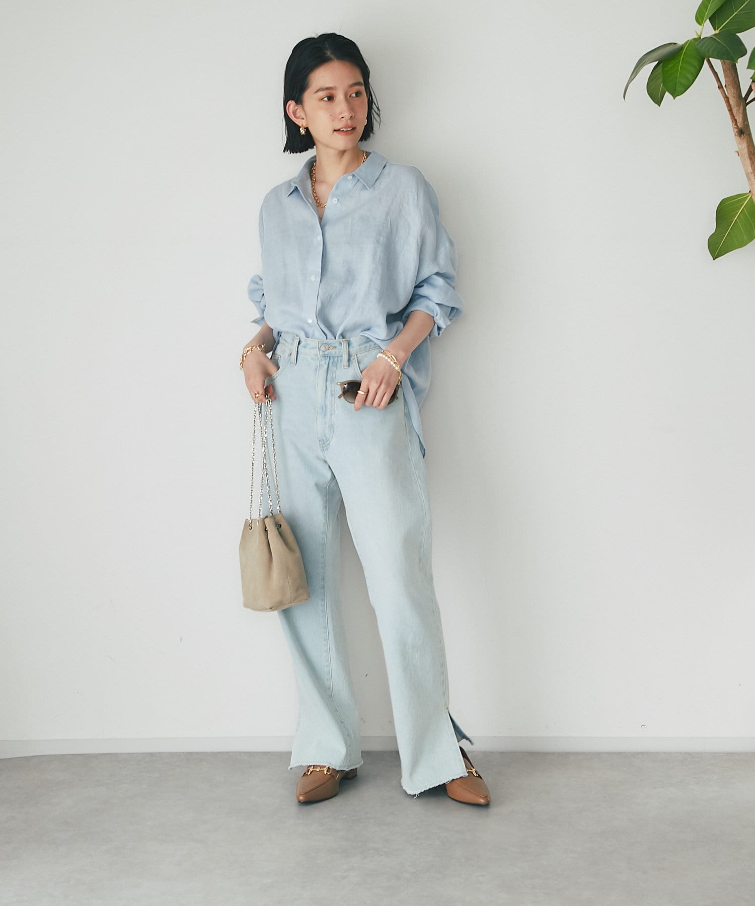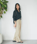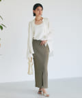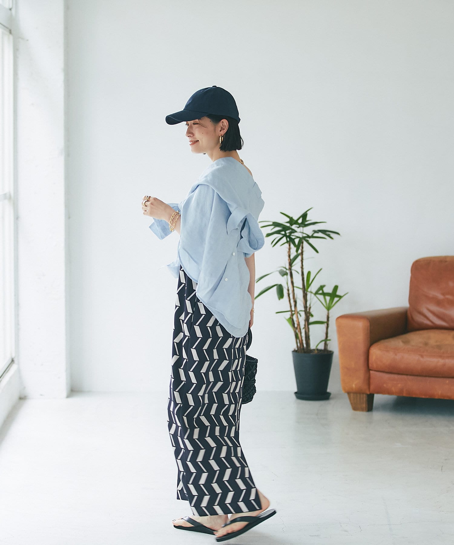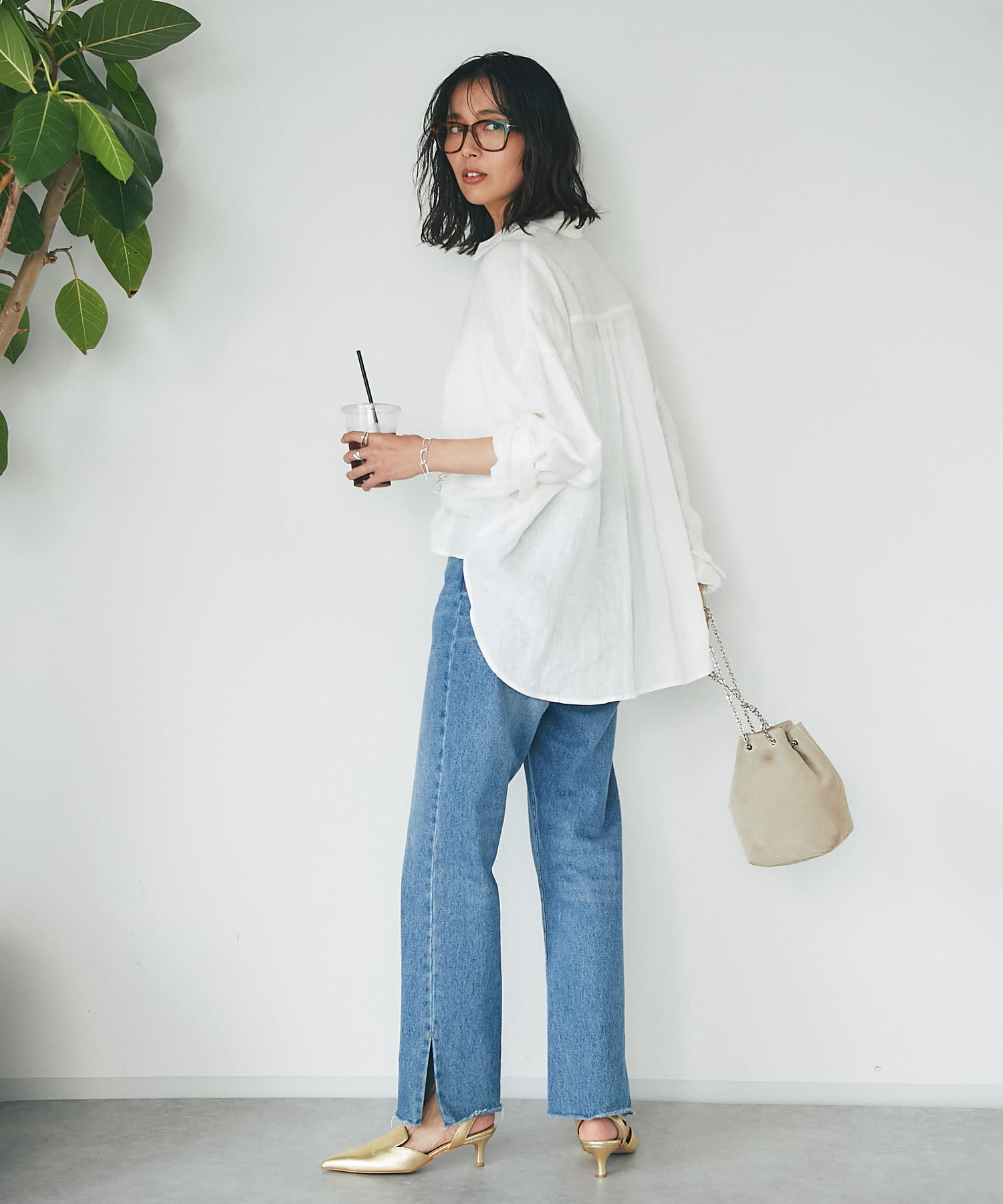 ゆったりとしたシルエットなのでタイトスカートや細身のパンツとの相性は抜群。フレアスカートなどボリュームのあるアイテムと合わせるときはボタンを少し開けたり袖をまくる、フロント部分の裾を片方だけ入れるなどの工夫ですっきり着ていただけます。