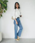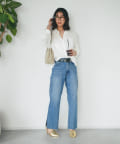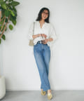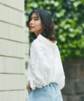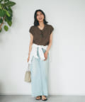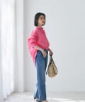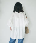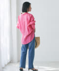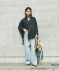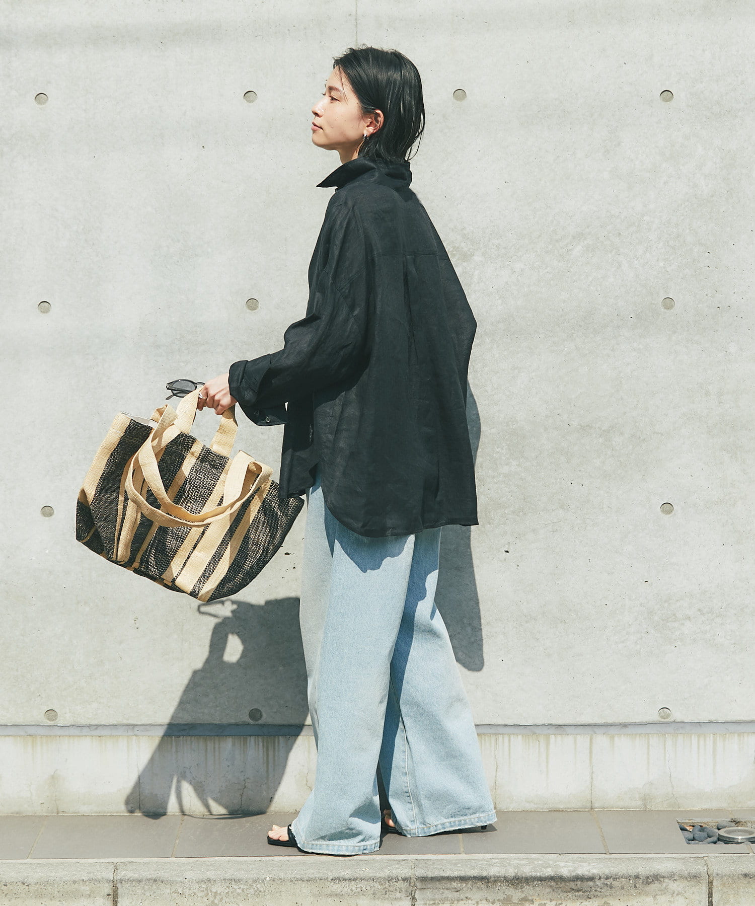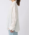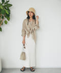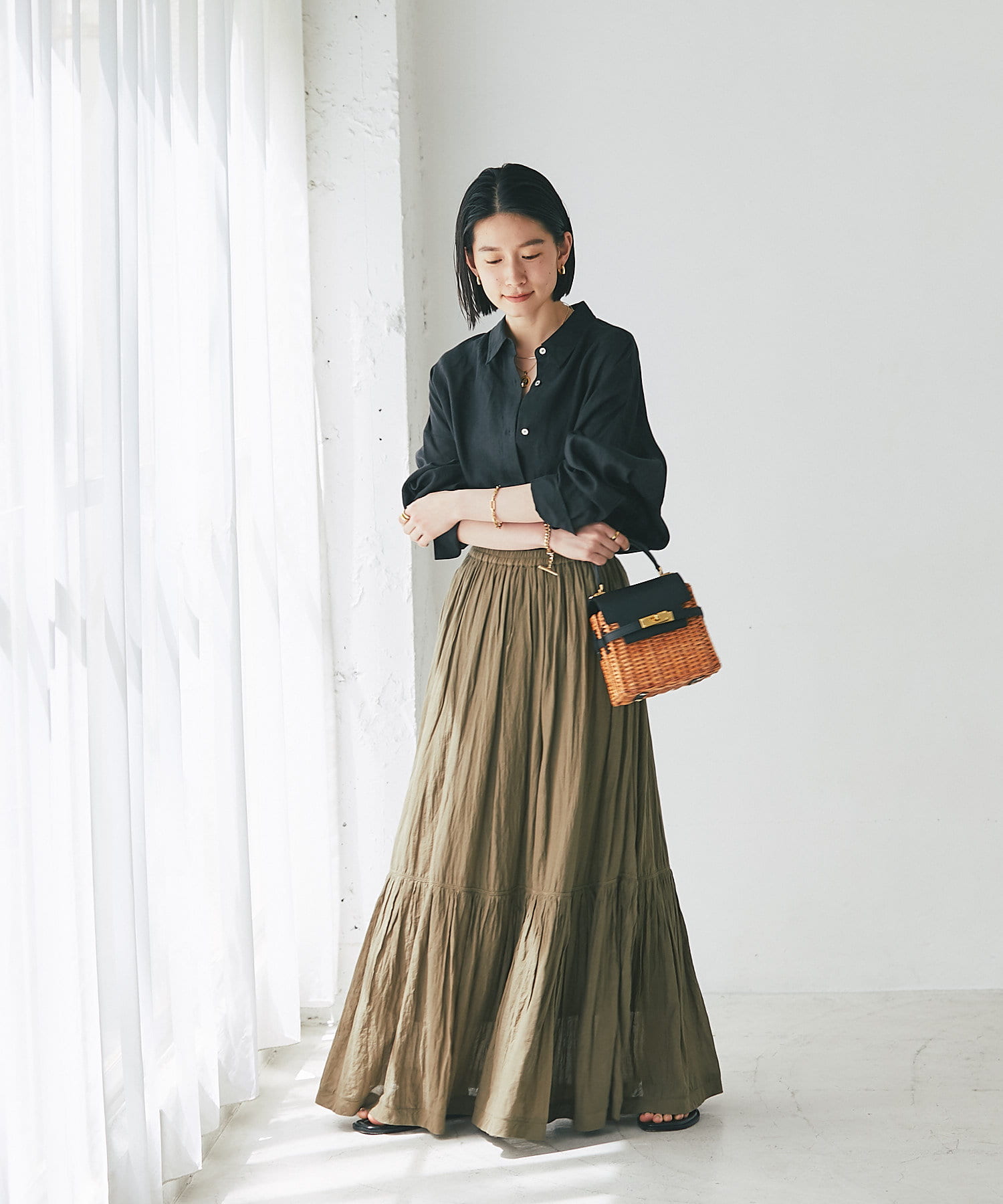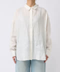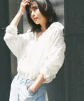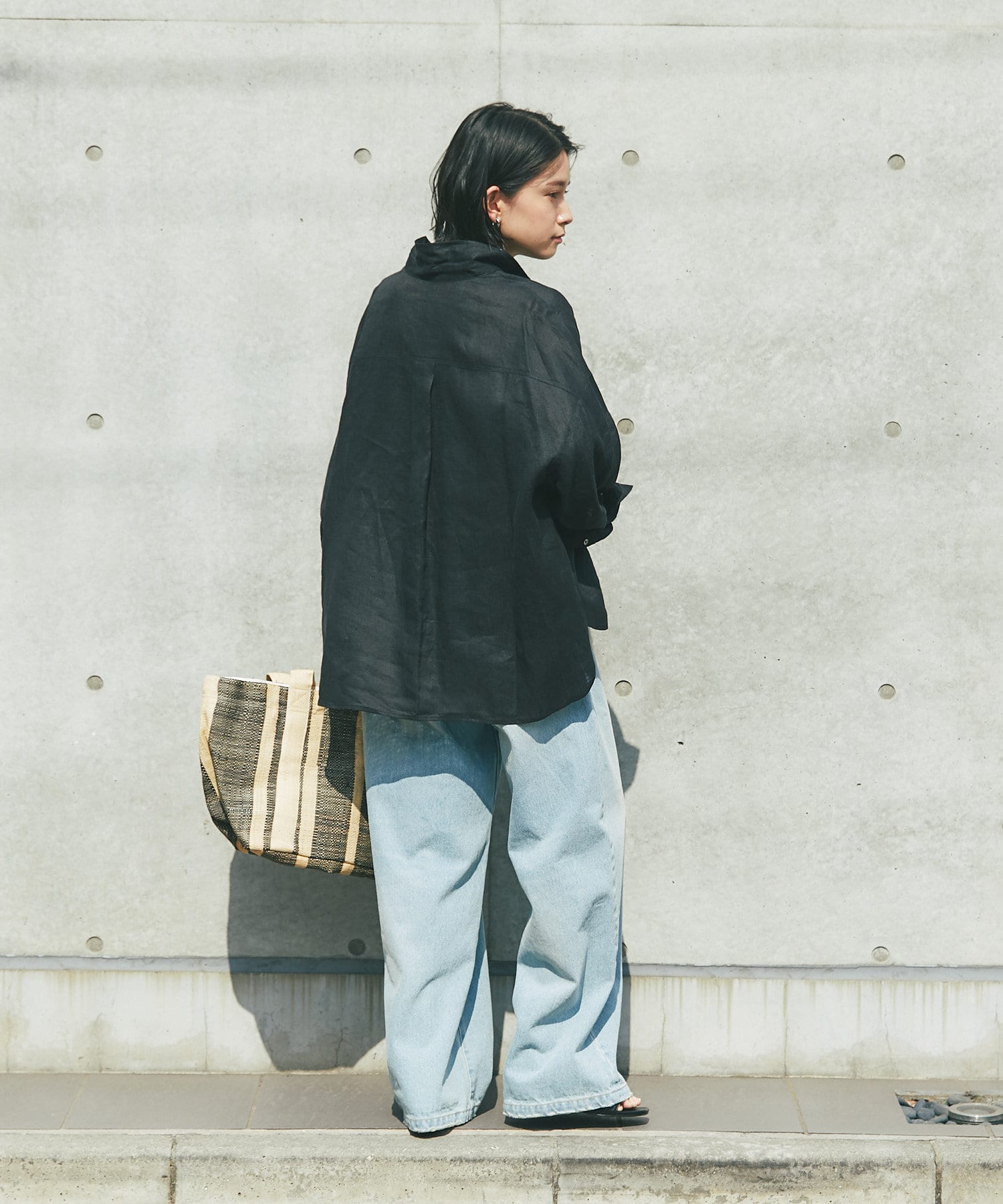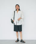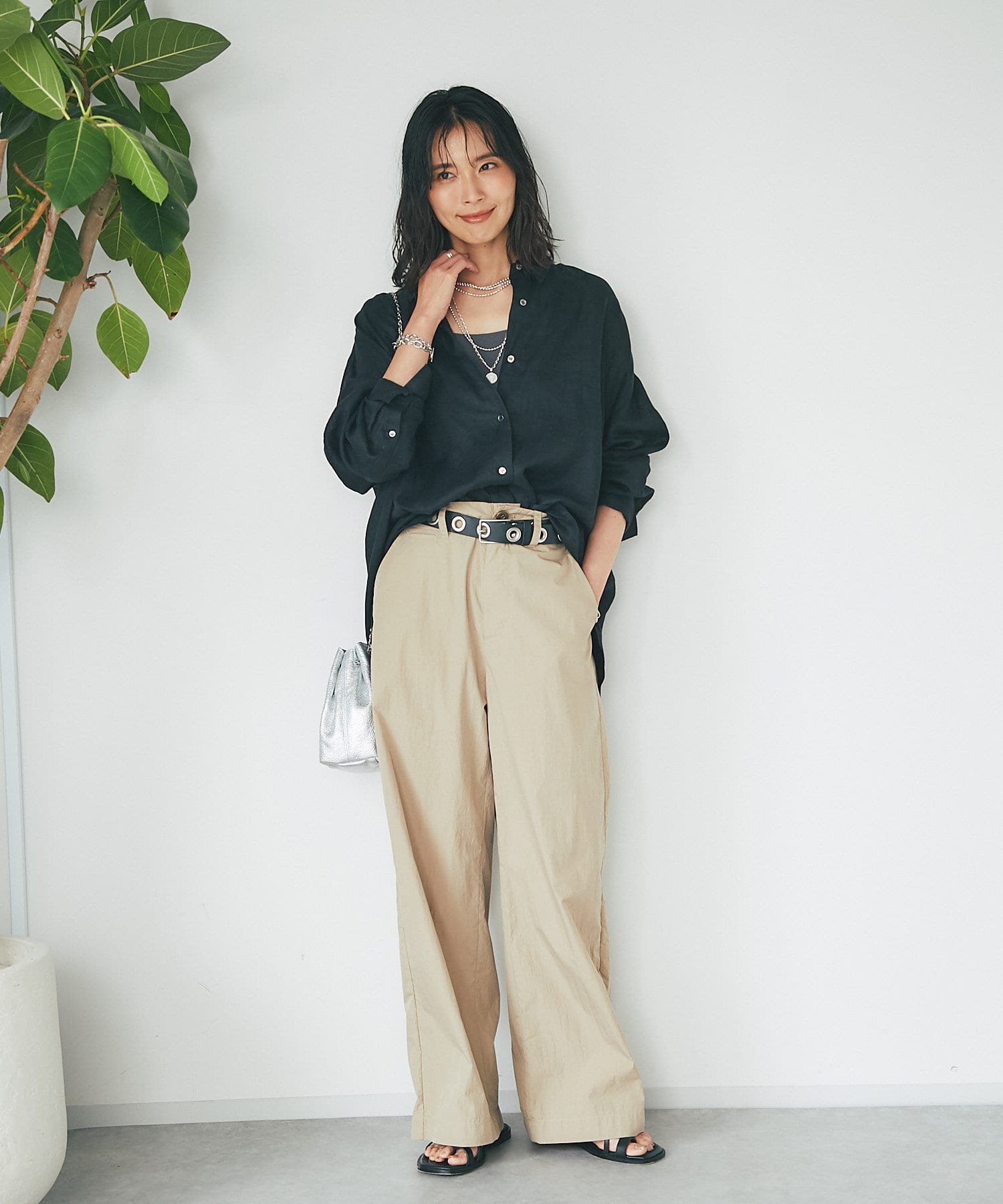 ゆったりとしたシルエットなのでタイトスカートや細身のパンツとの相性は抜群。フレアスカートなどボリュームのあるアイテムと合わせるときはボタンを少し開けたり袖をまくる、フロント部分の裾を片方だけ入れるなどの工夫ですっきり着ていただけます。