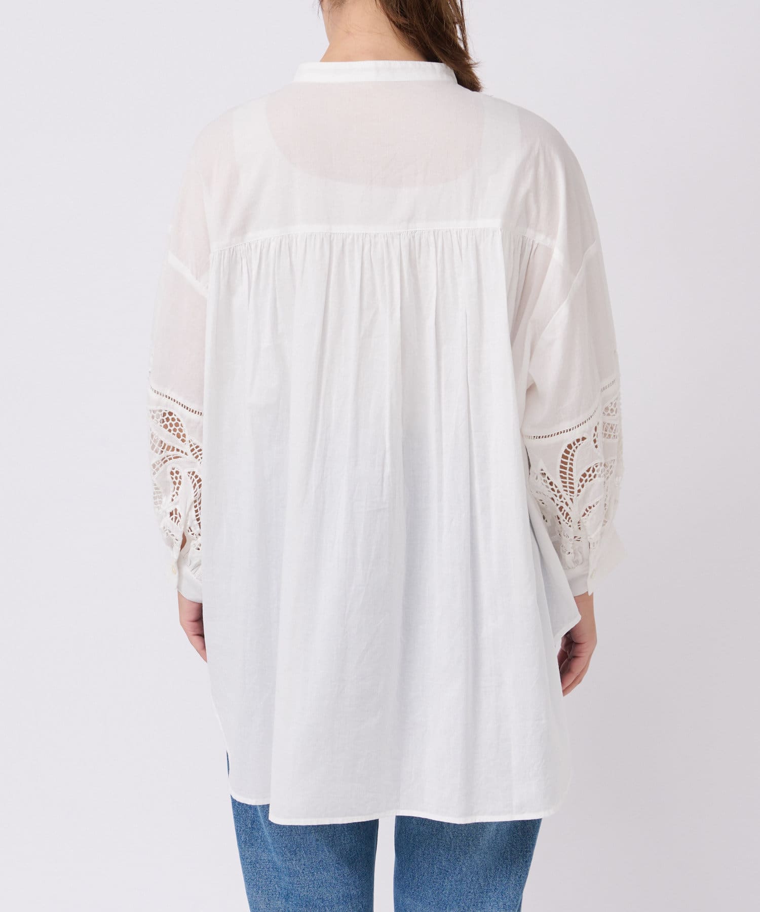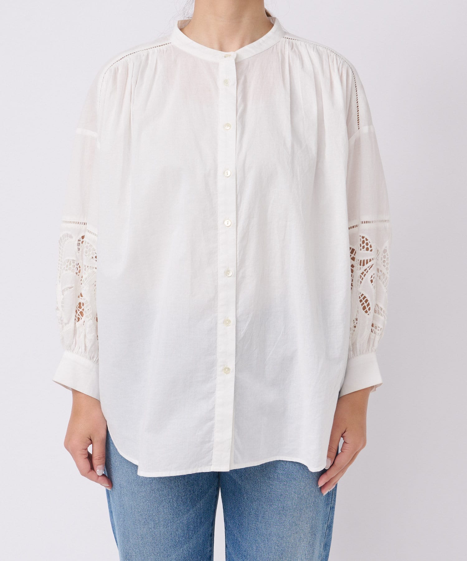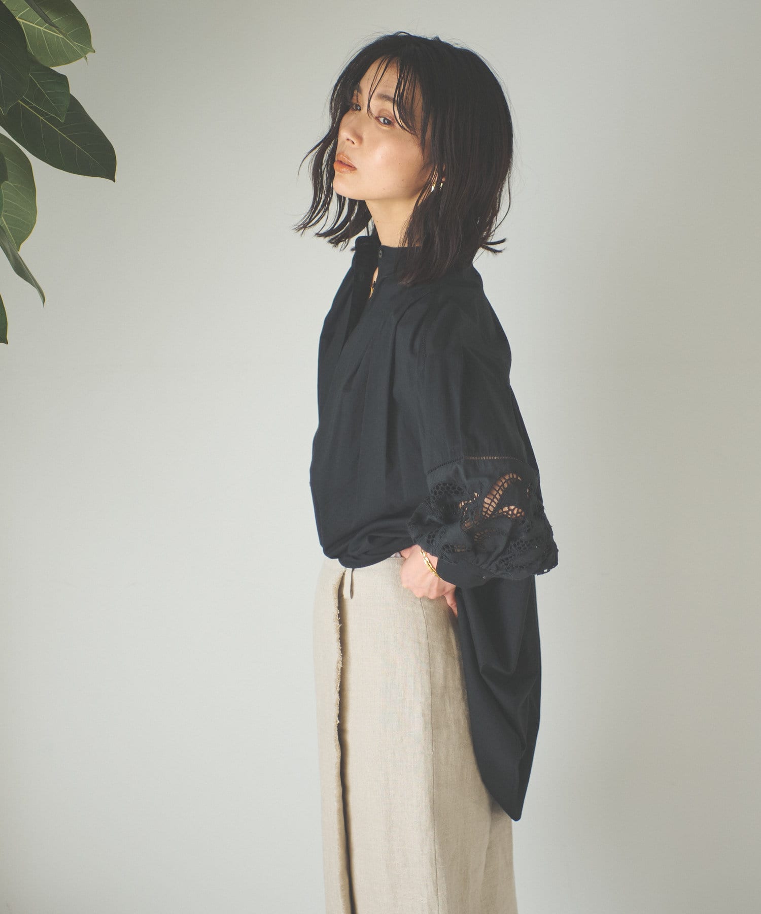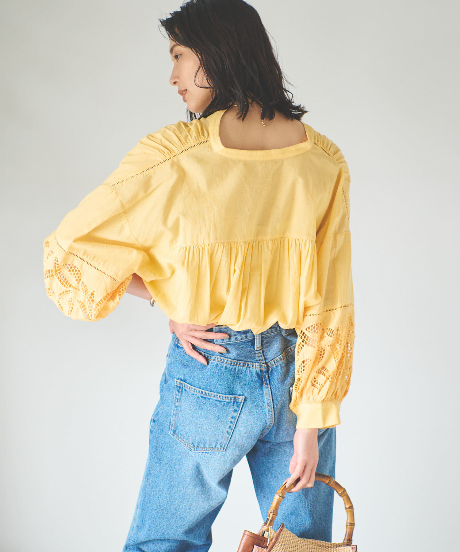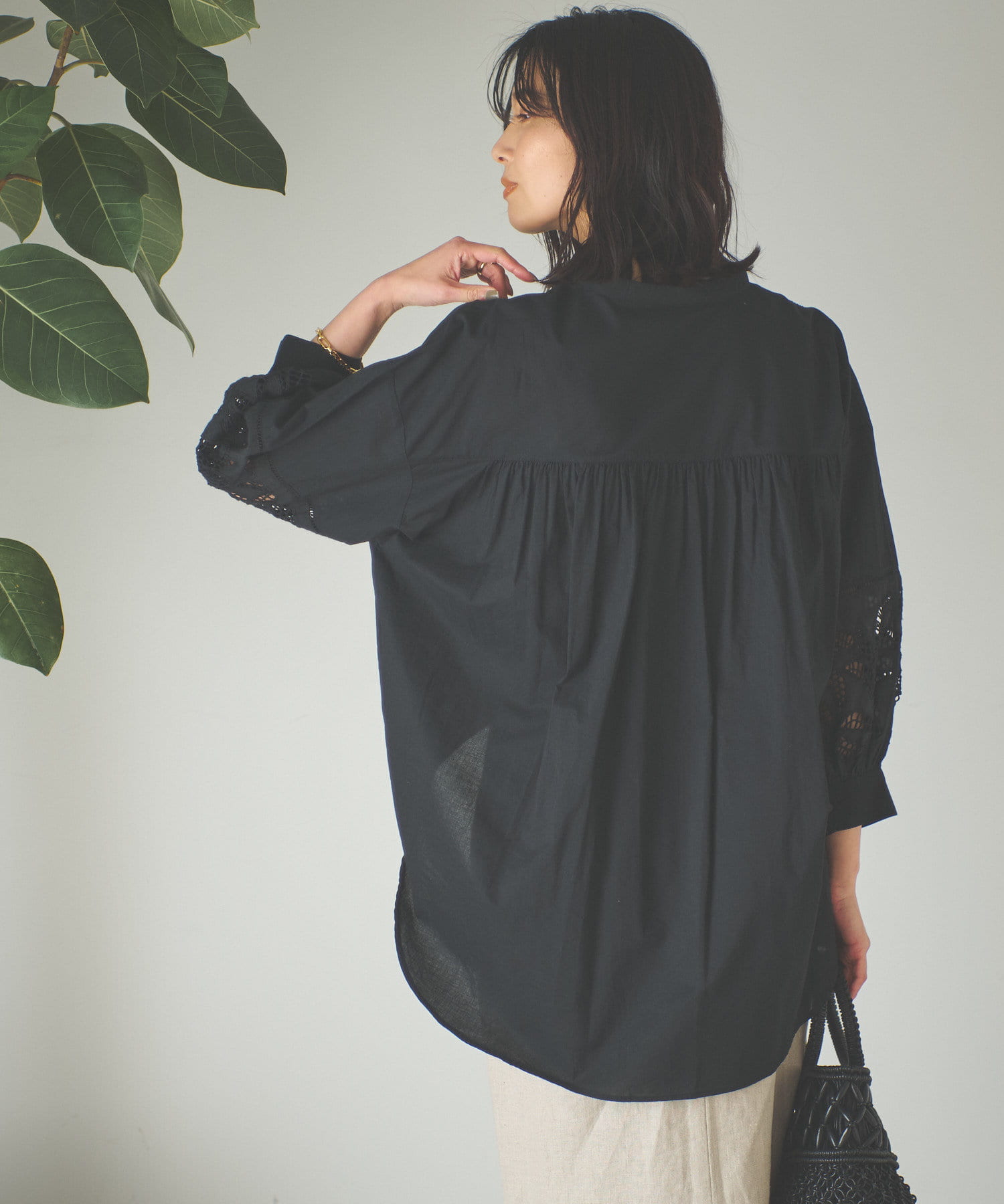 【袖口のレースがさりげない】コットン袖刺繍ギャザーブラウス