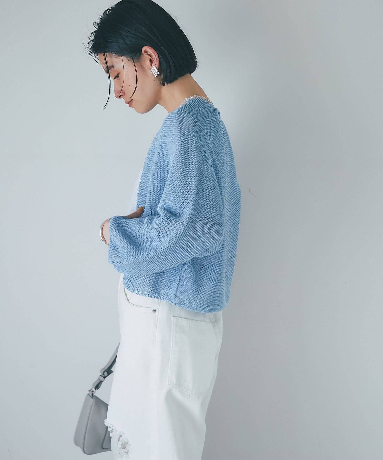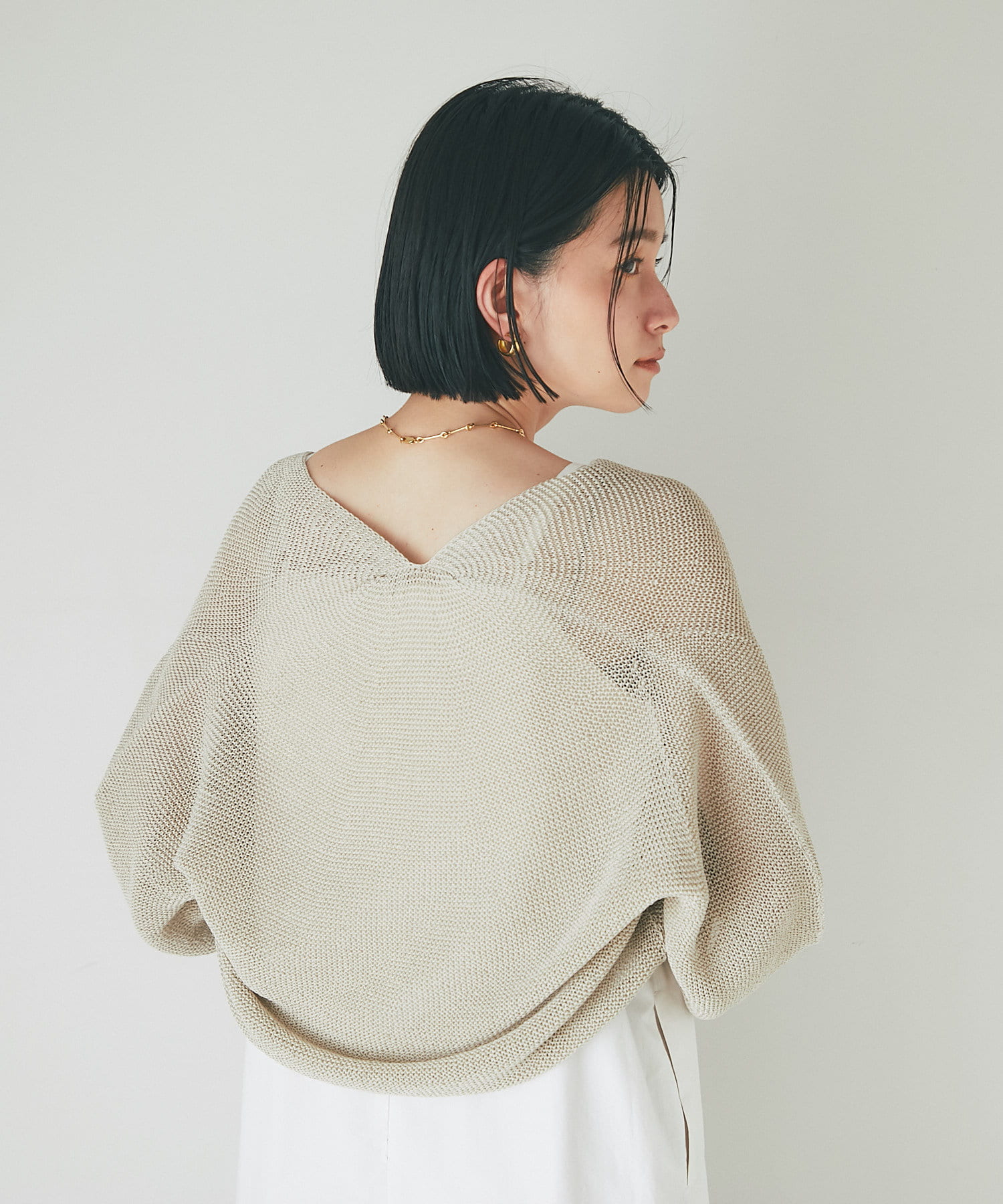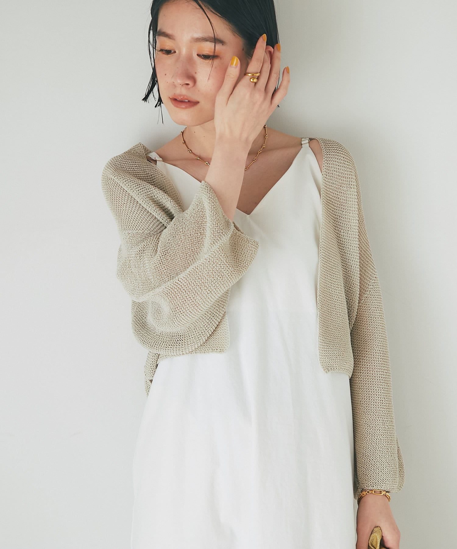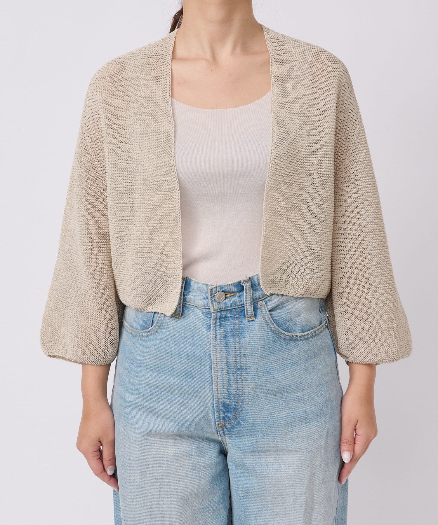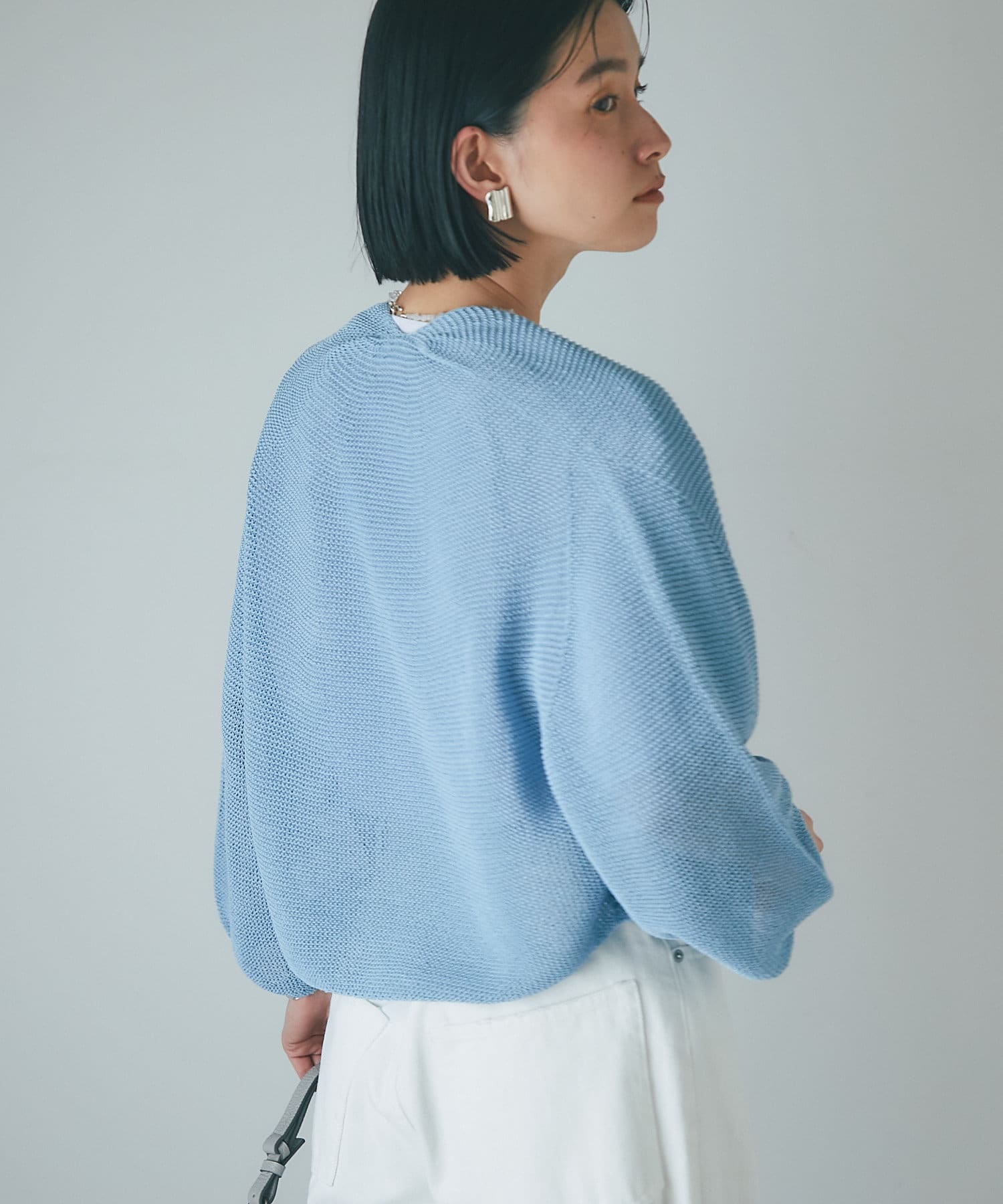 凹凸感のあるシアーな編地とふわっと軽い着心地のペーパーヤーンを使用したニットのトッパーカーディガン。