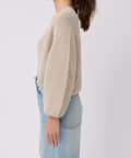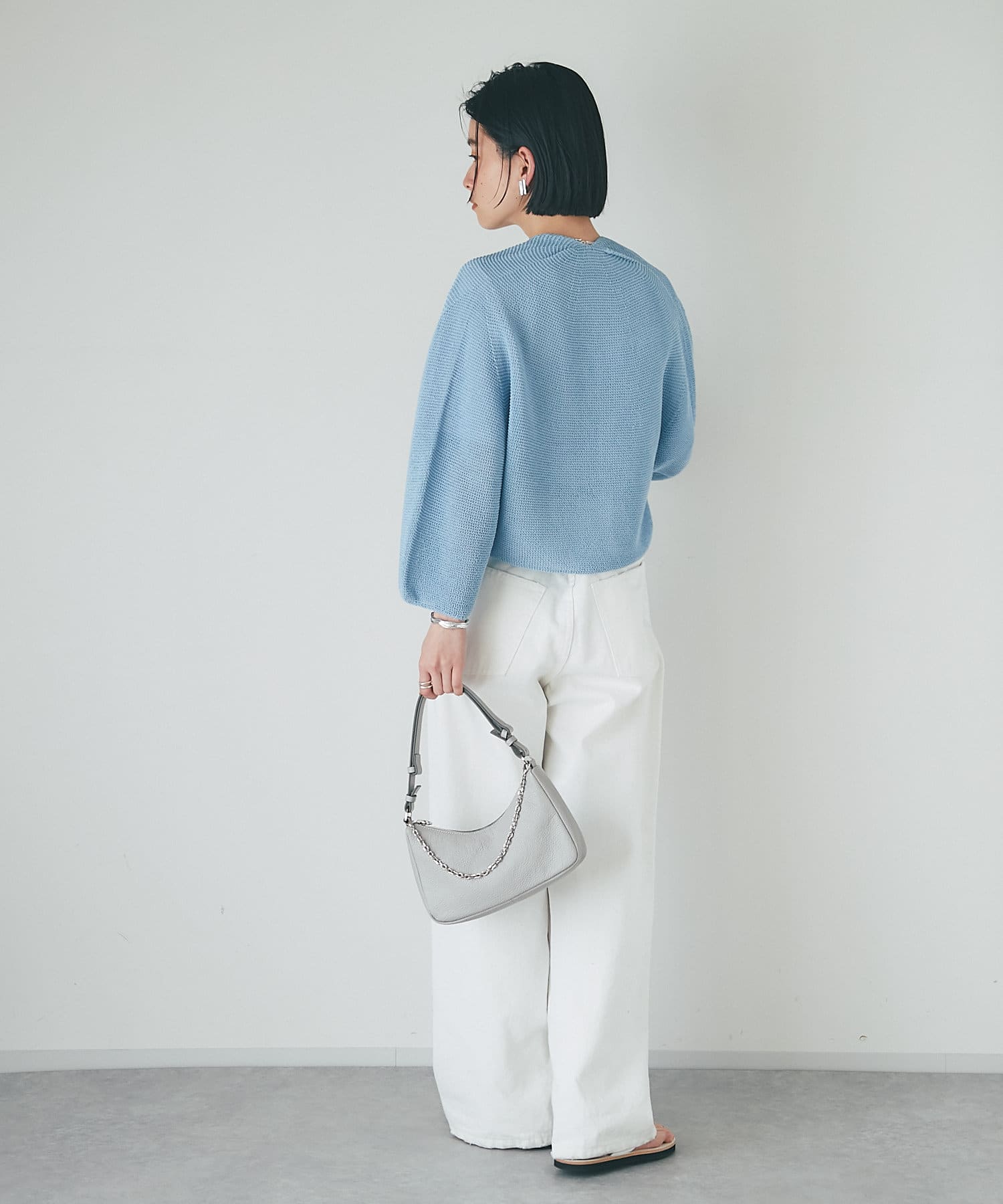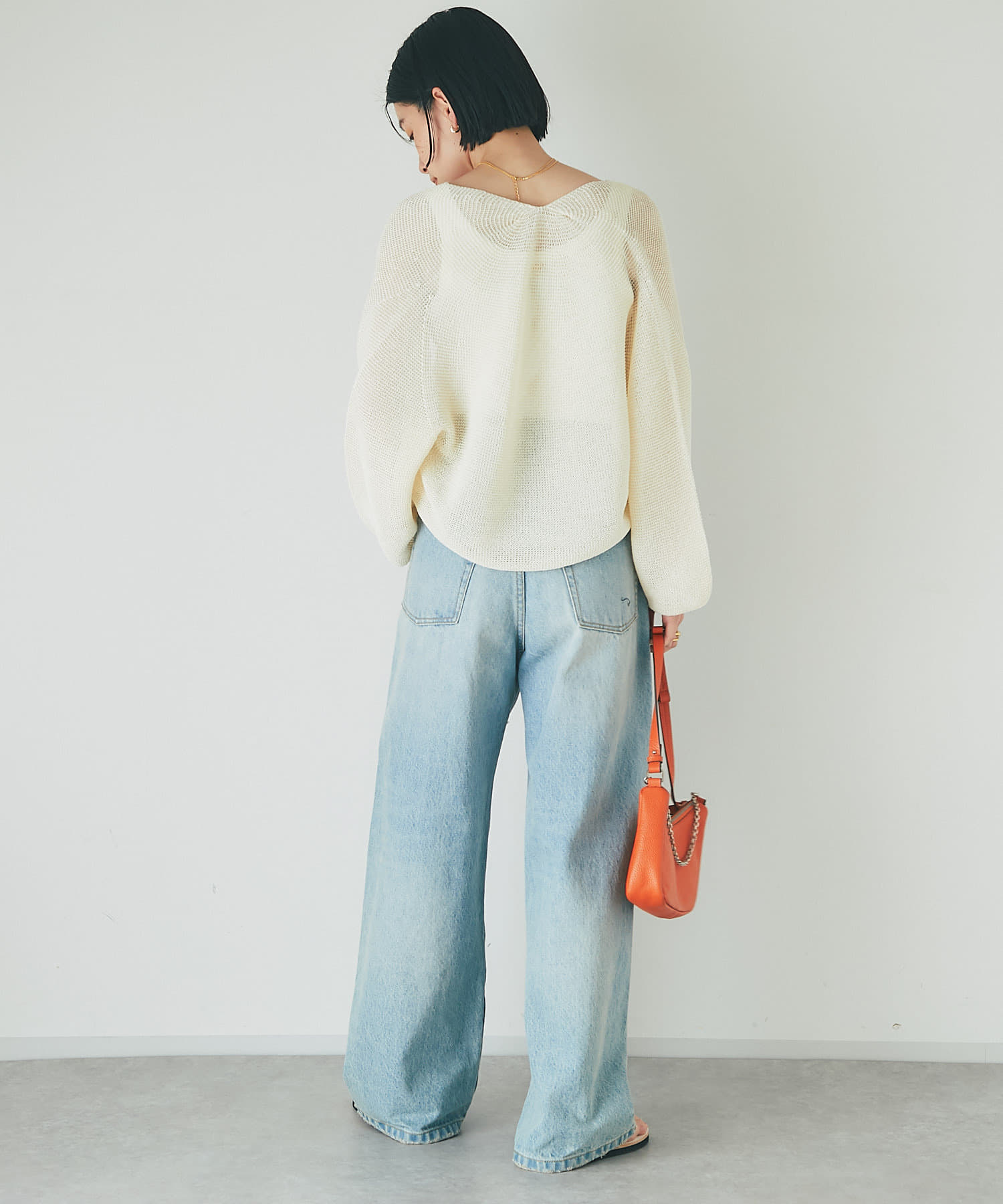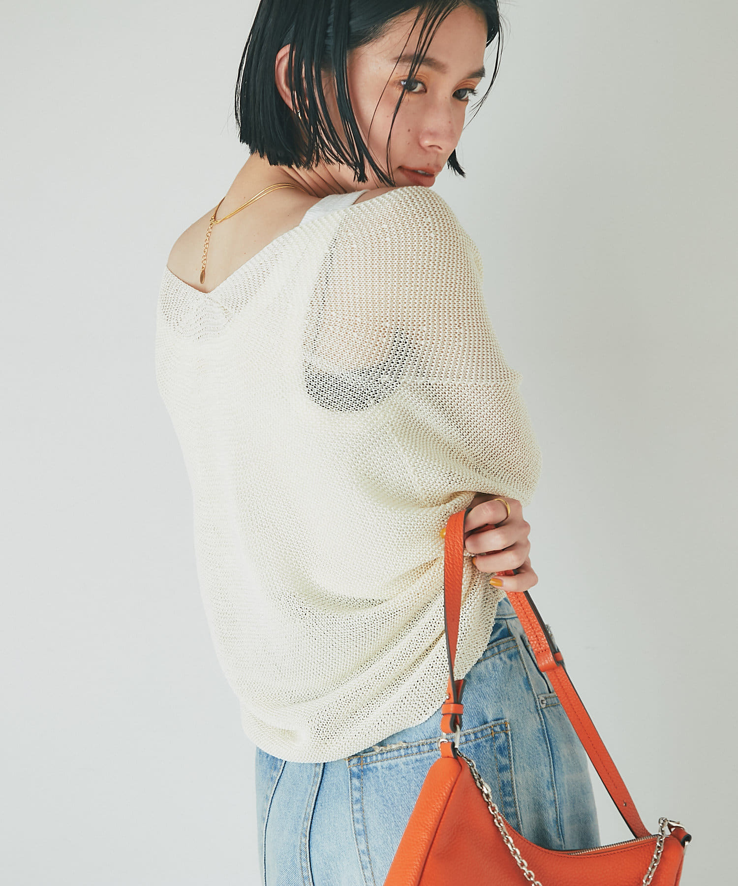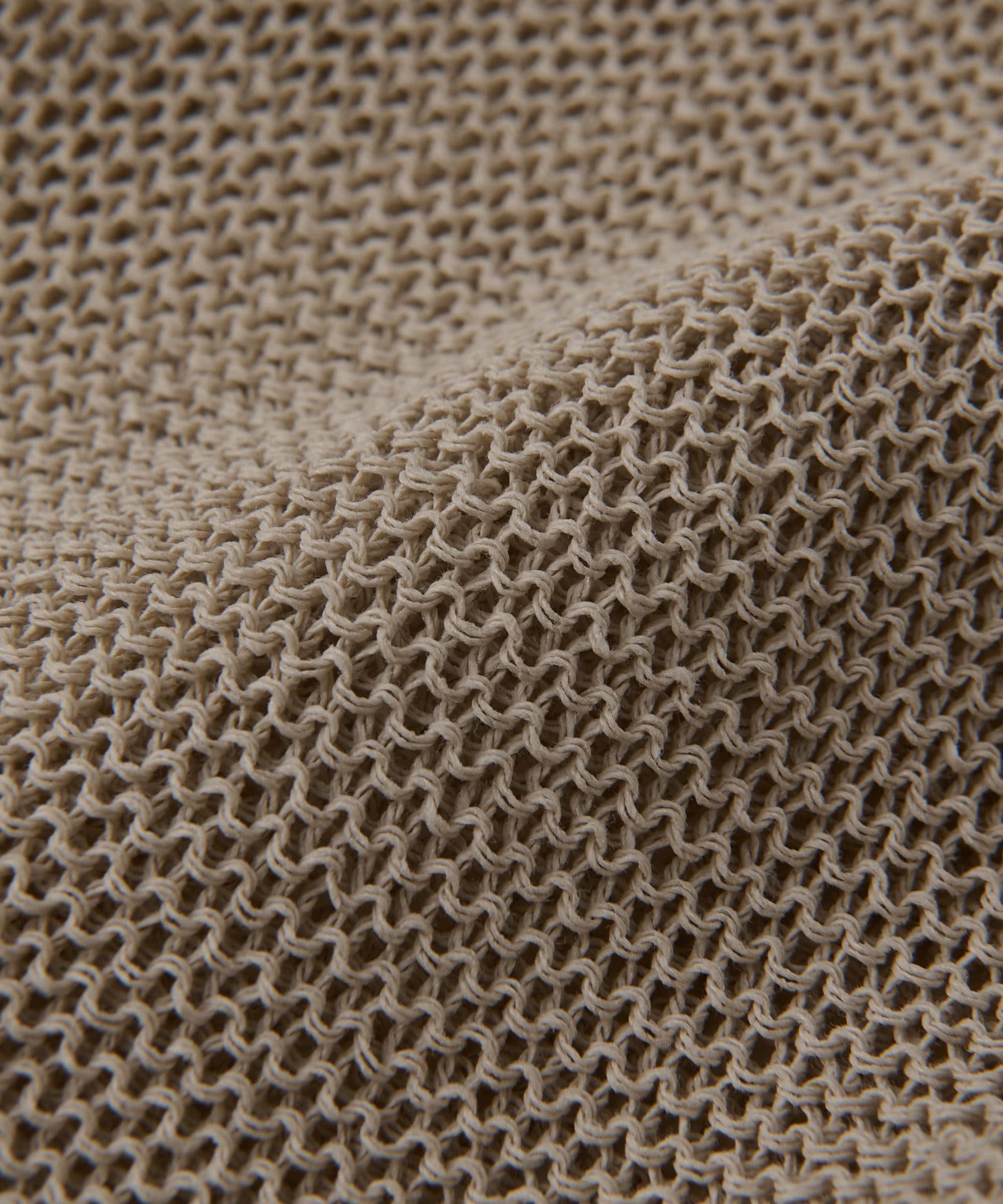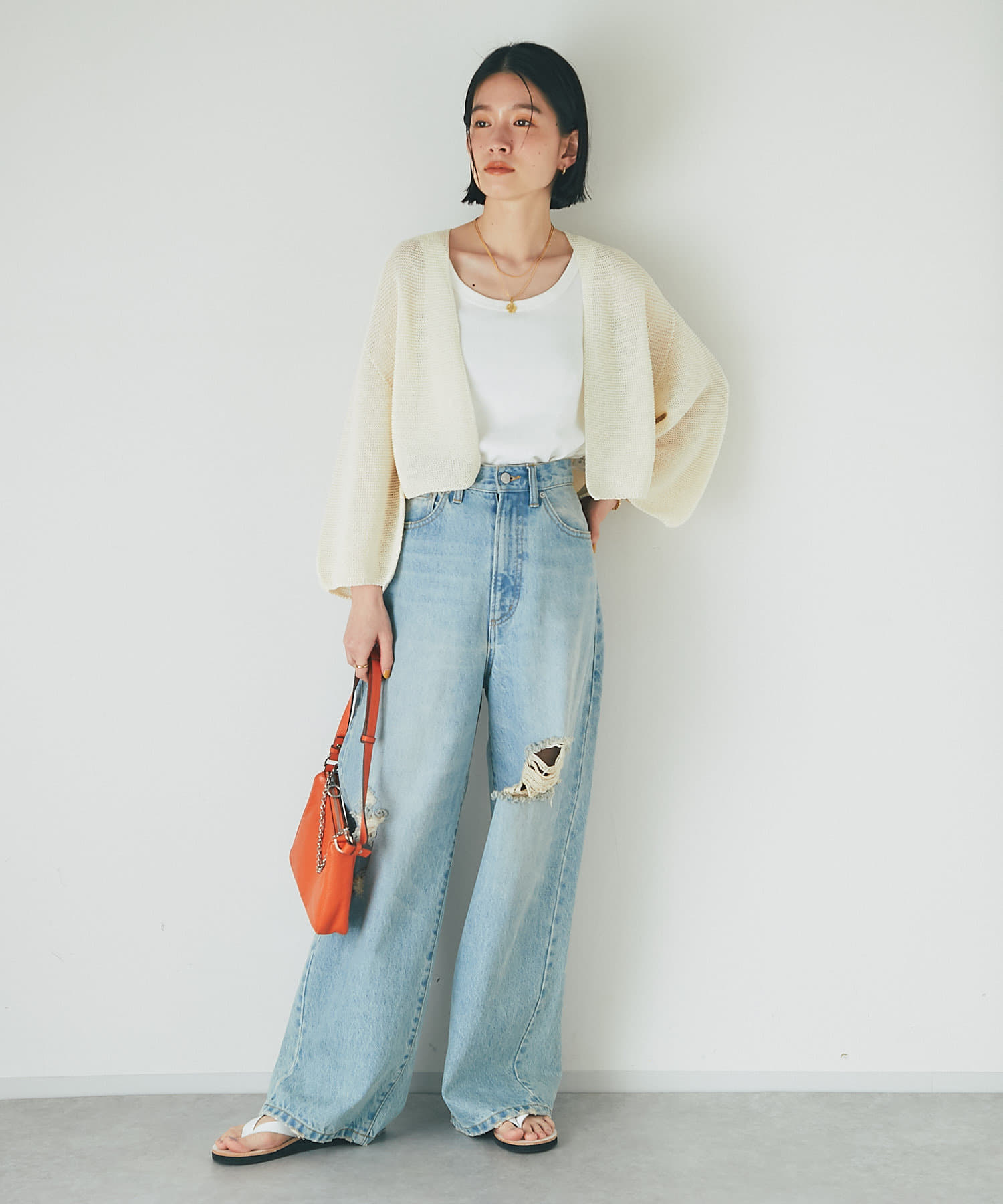 凹凸感のあるシアーな編地とふわっと軽い着心地のペーパーヤーンを使用したニットのトッパーカーディガン。