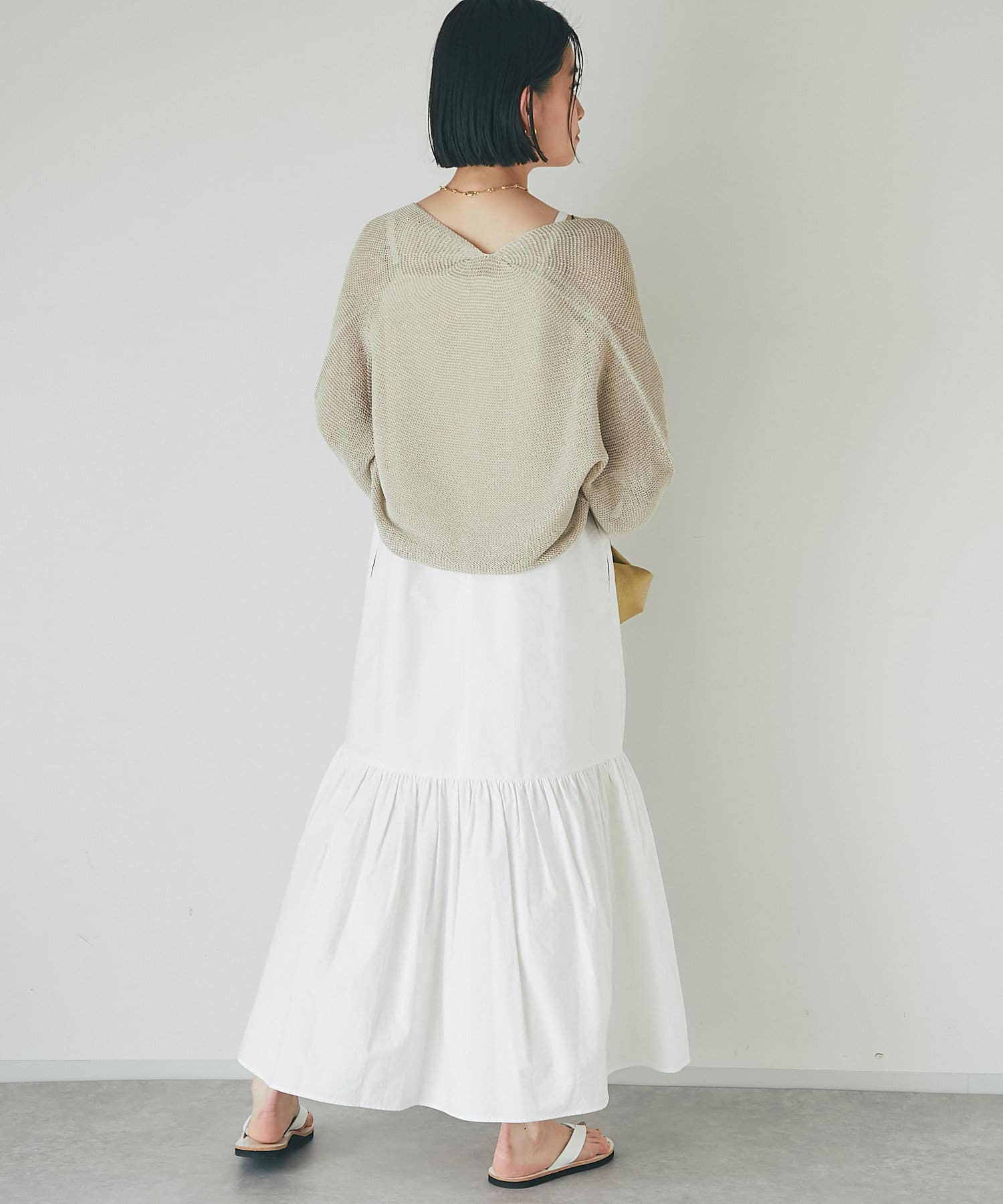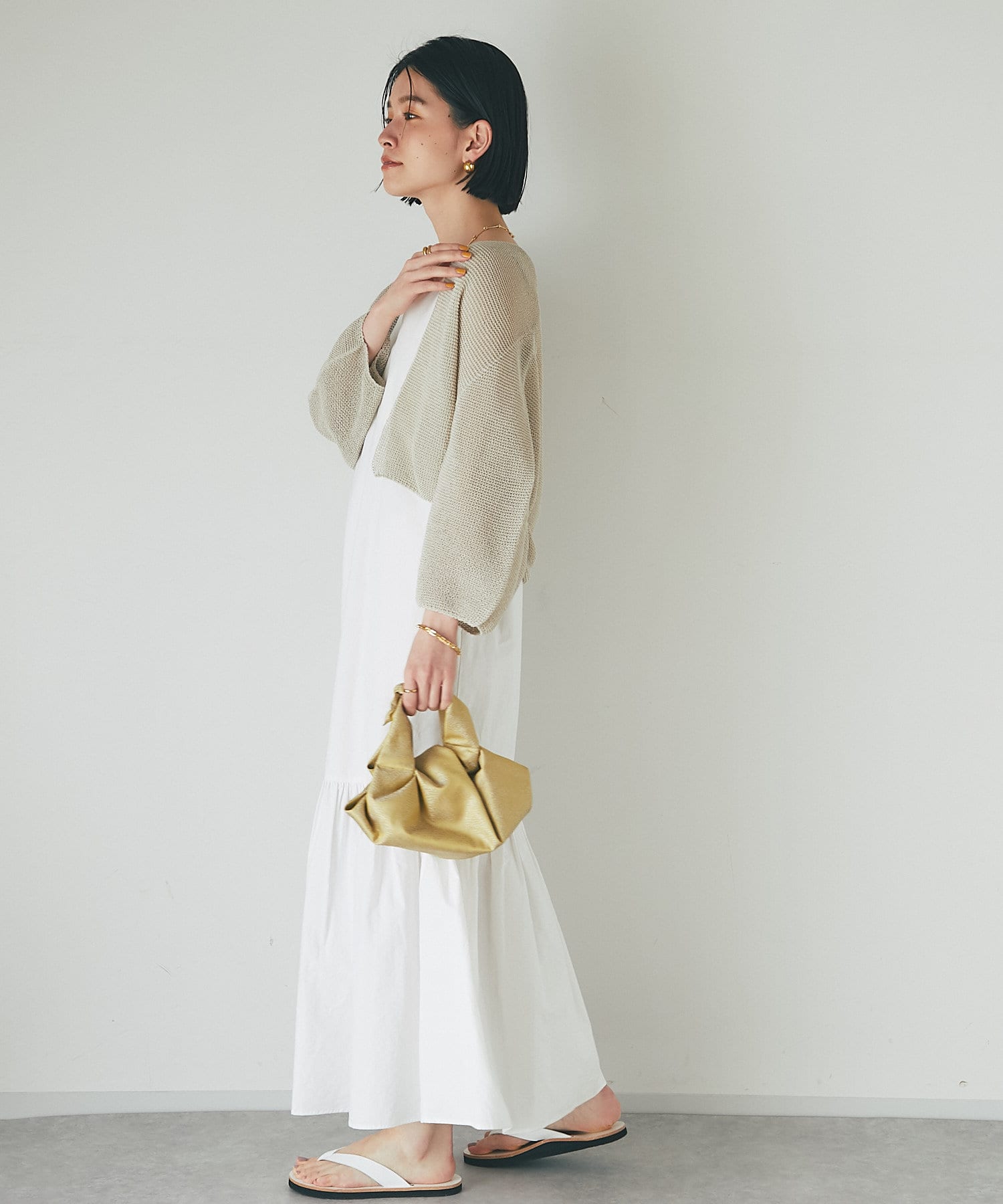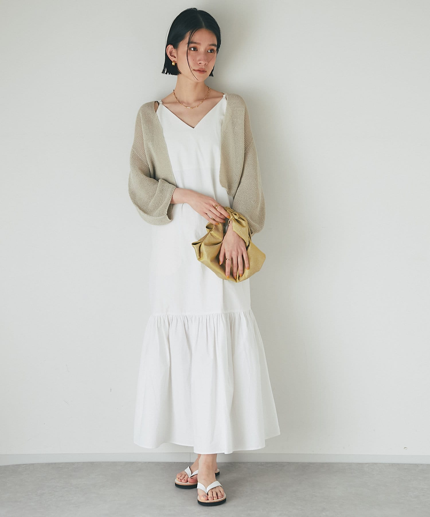 適度なシアー感が楽しめるノースリーブやキャミワンピースなどに羽織り、きれいめカジュアルなスタイルに。