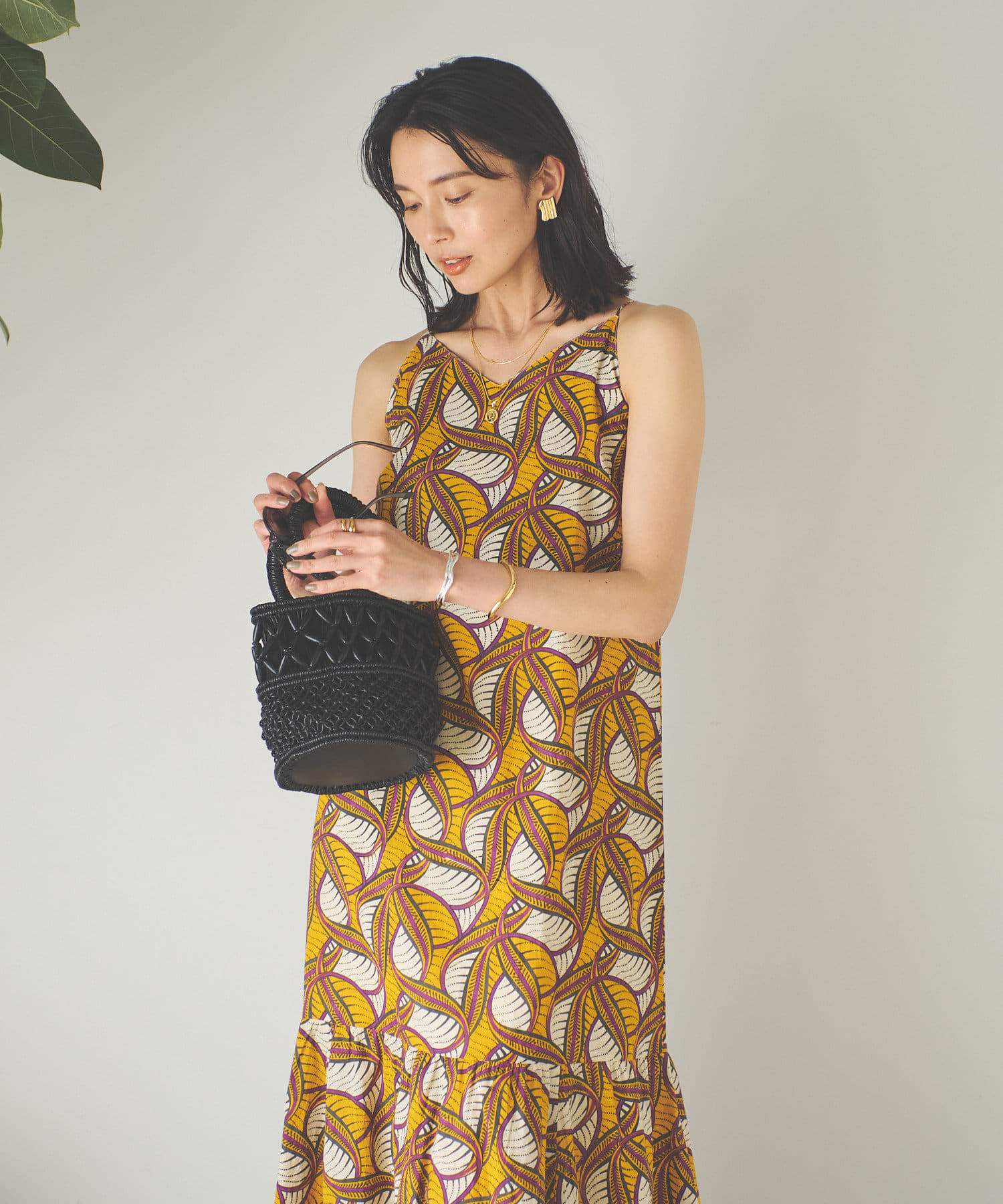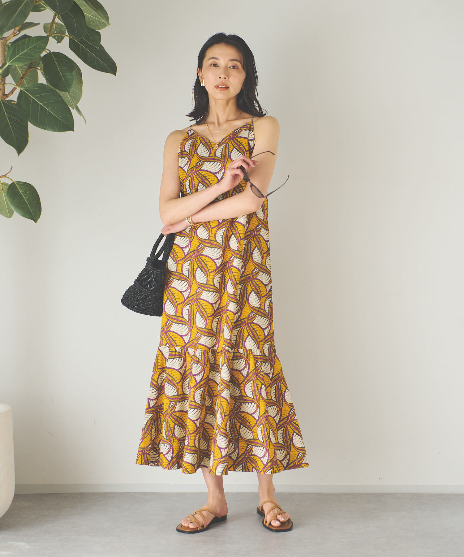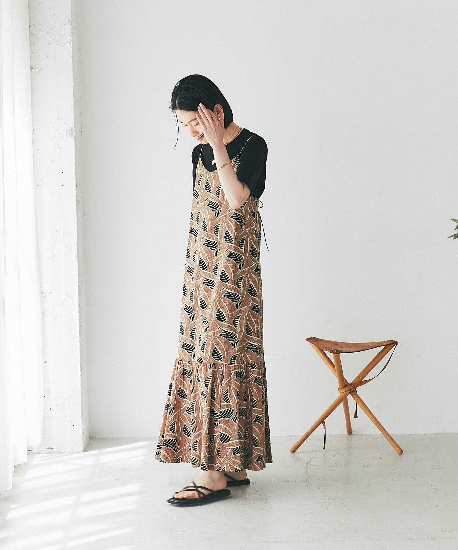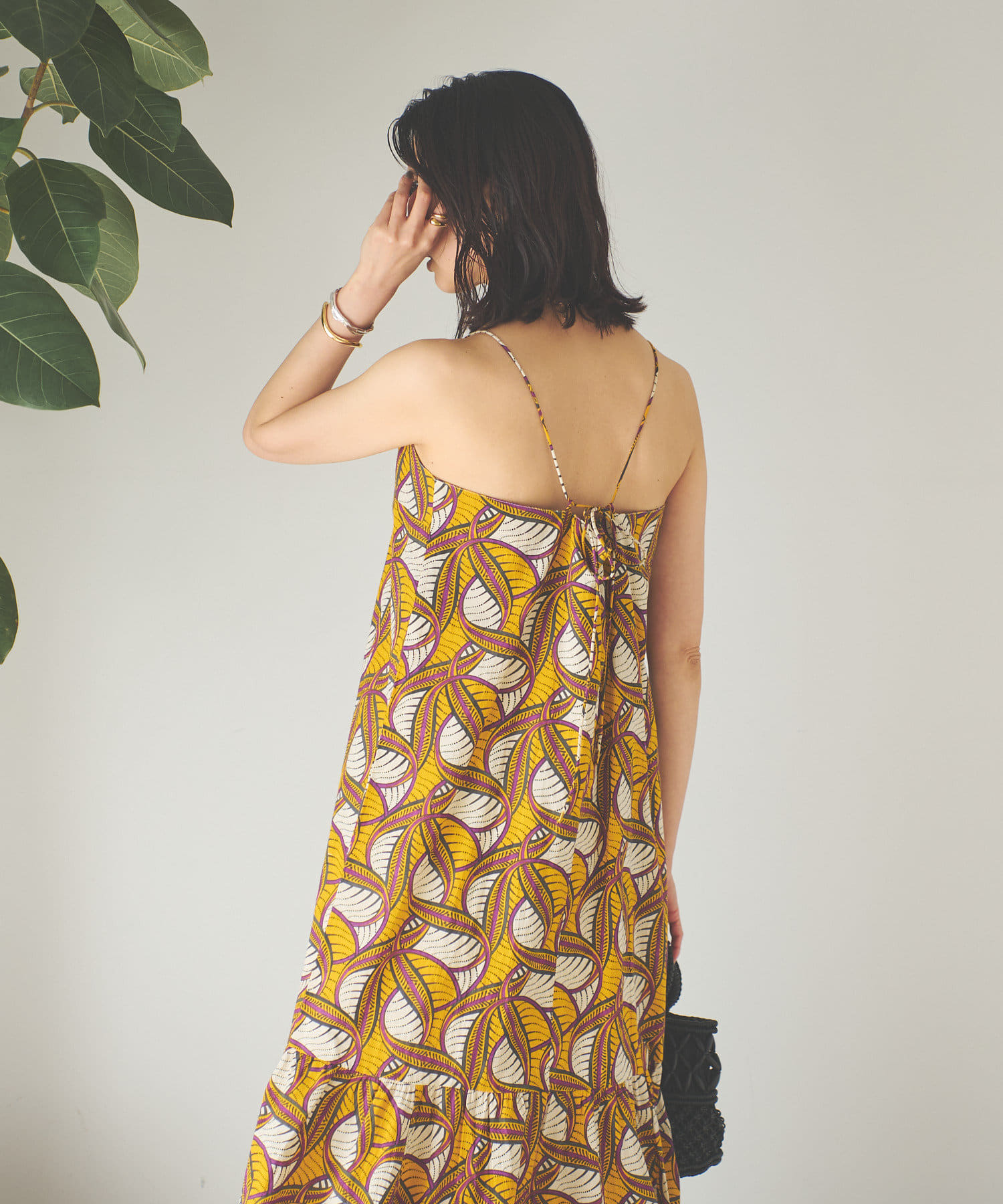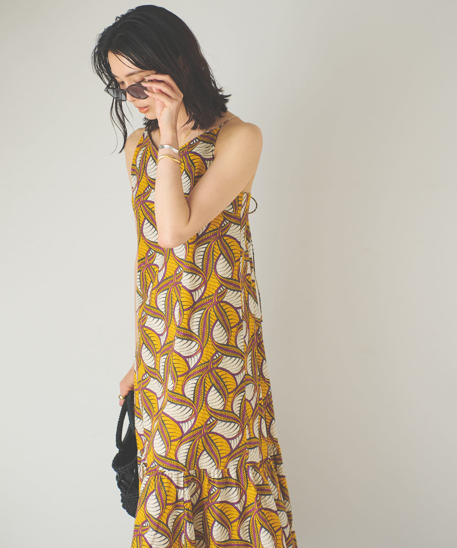 インド生産ならではの素材と風合いと、夏に向けて気分が上がる「バティック」ライクなプリント柄が目を惹くキャミワンピース。