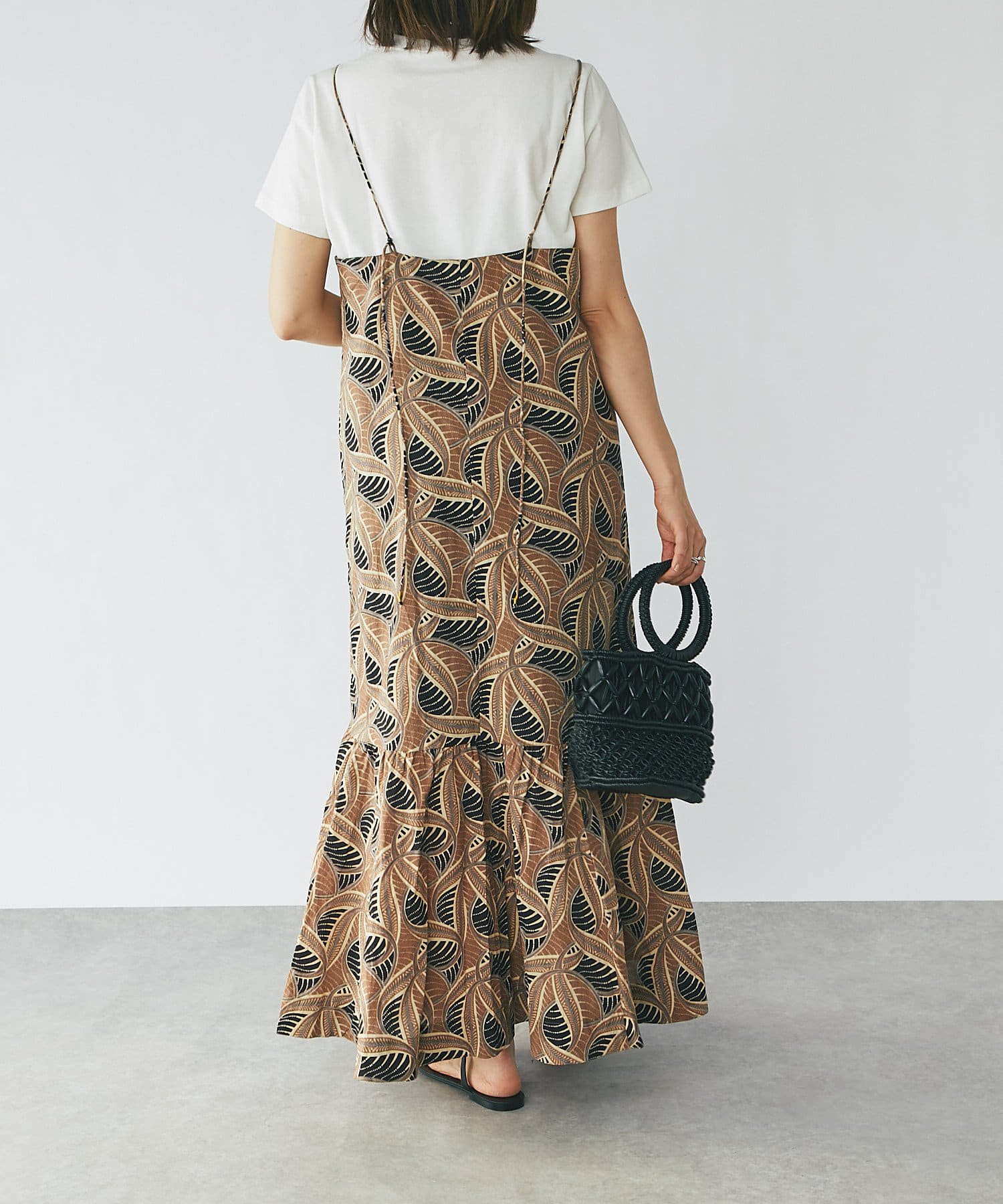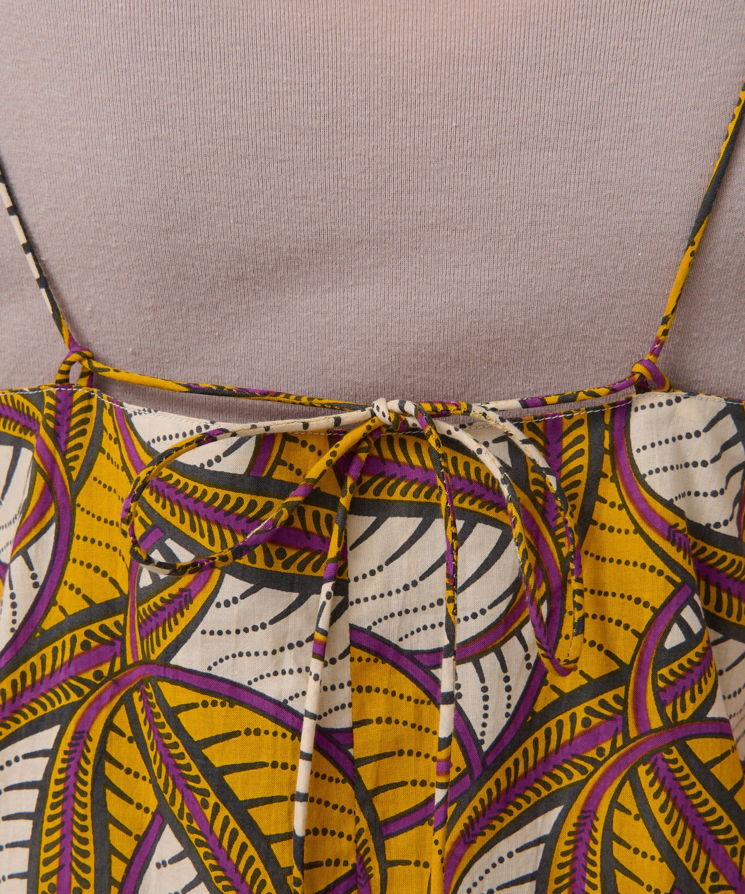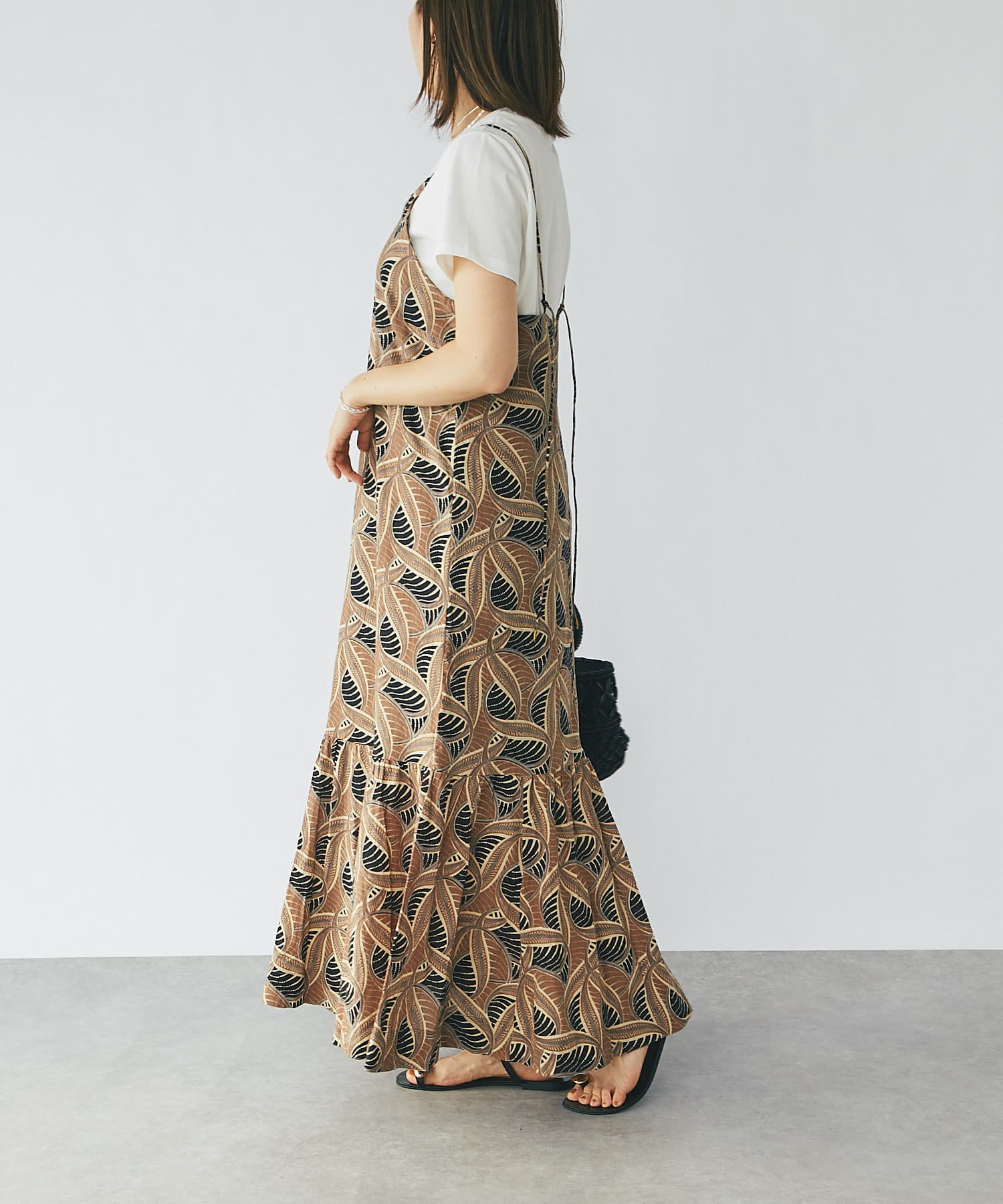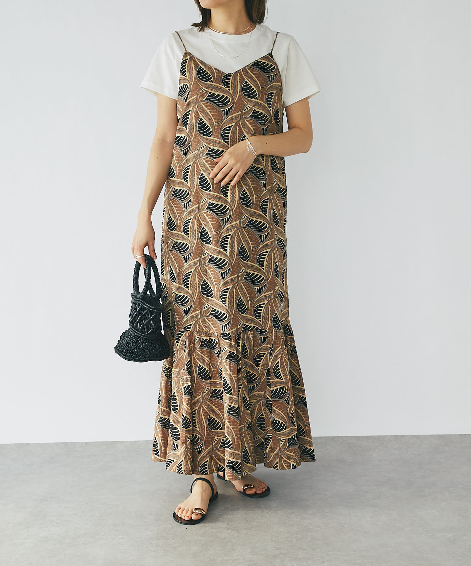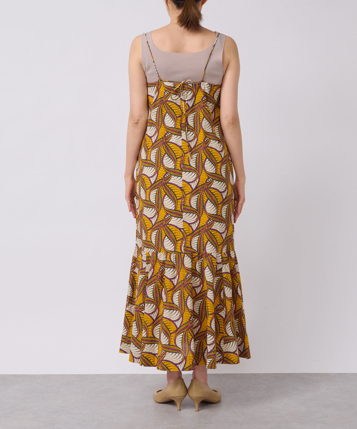インド生産ならではの素材と風合いと、夏に向けて気分が上がる「バティック」ライクなプリント柄が目を惹くキャミワンピース。