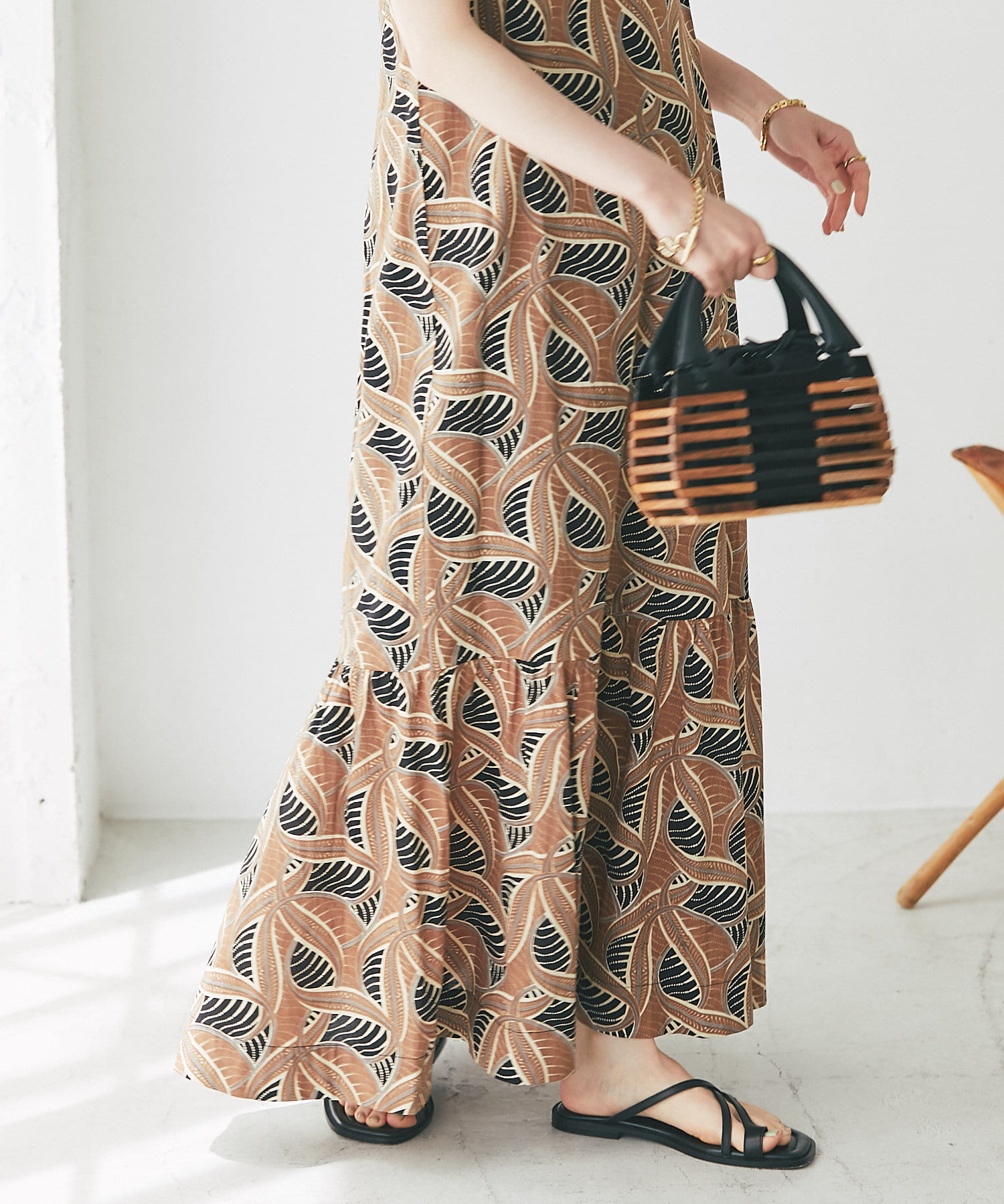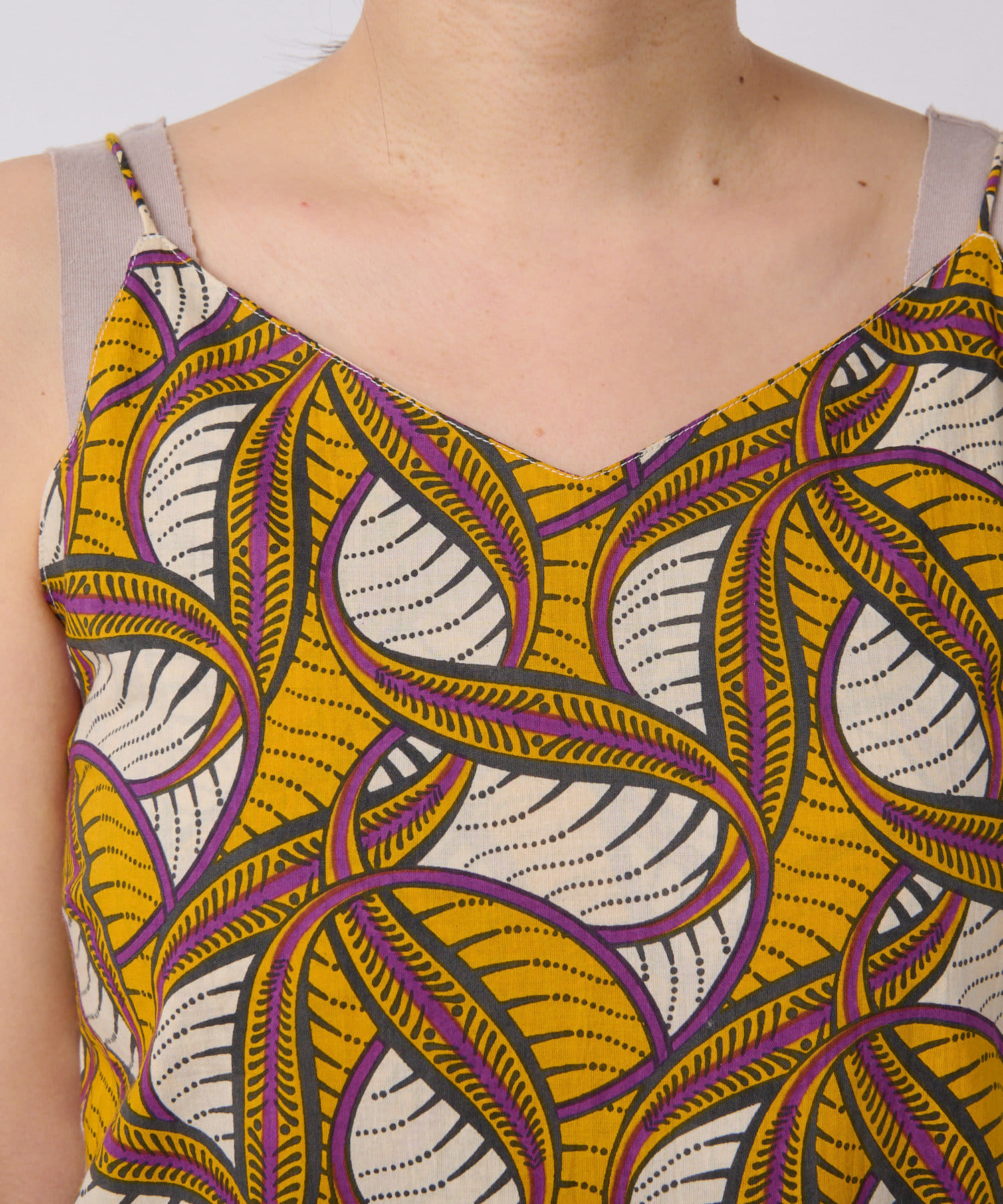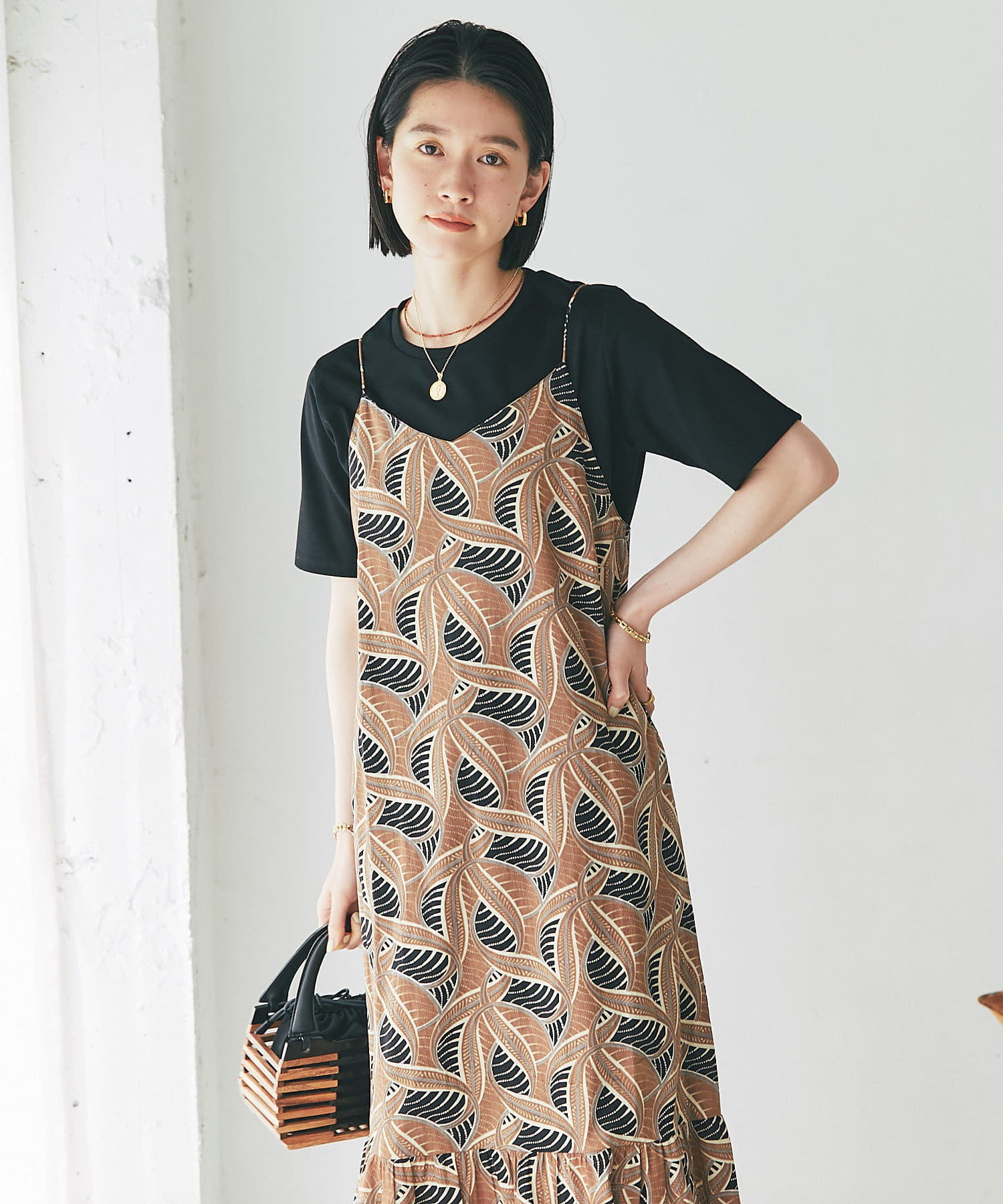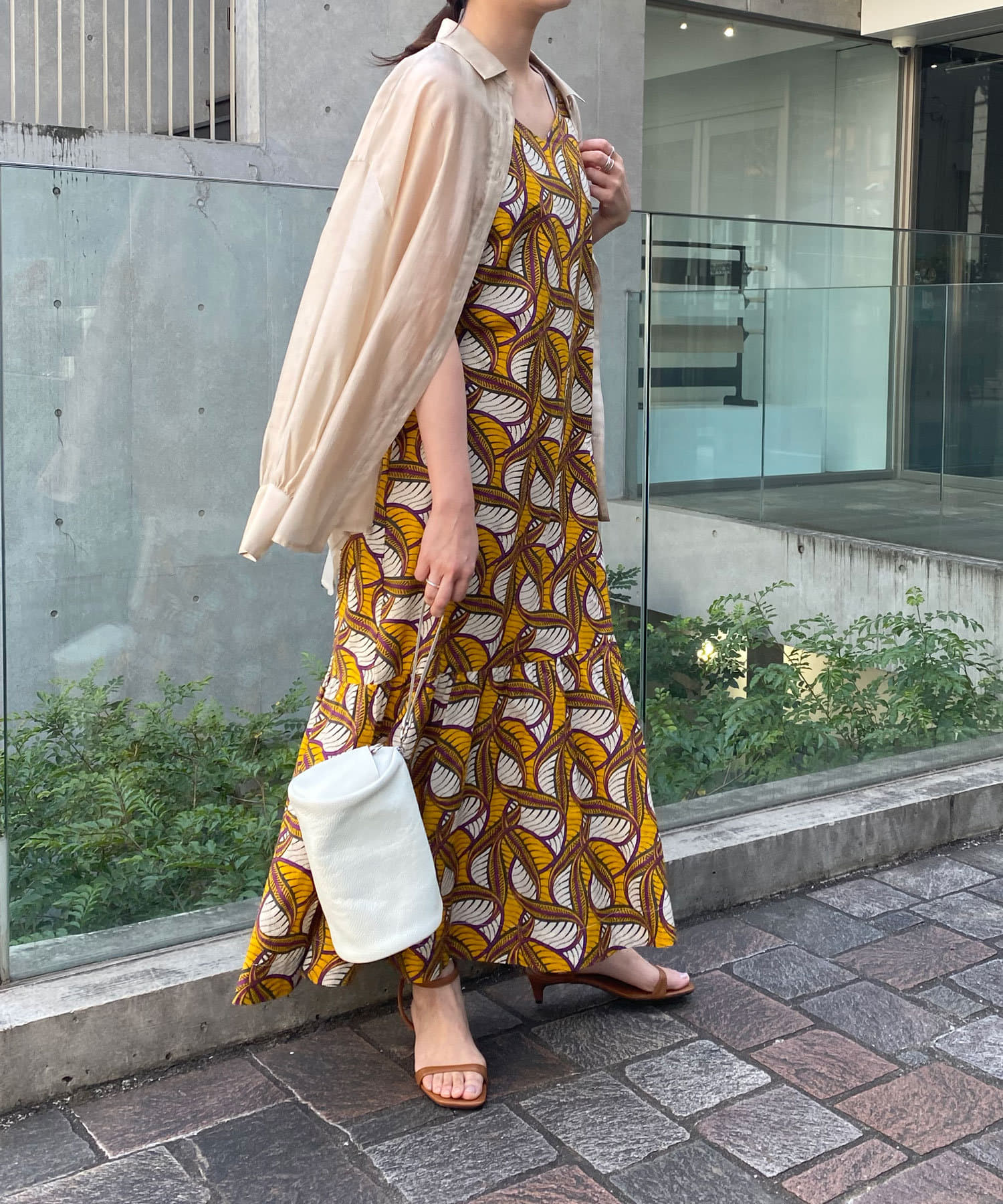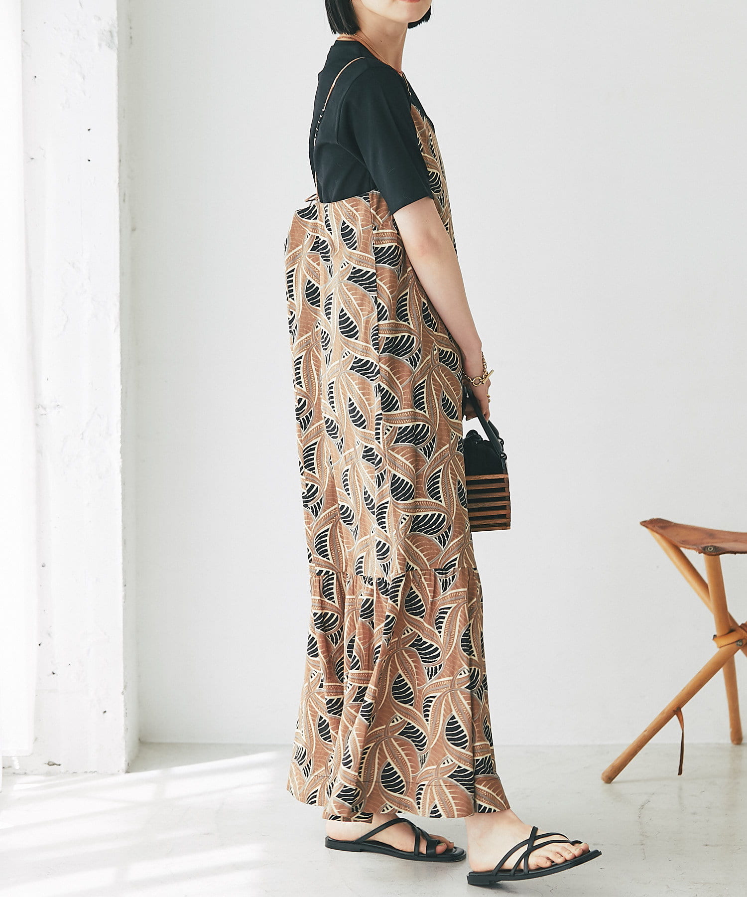 インド生産ならではの素材と風合いと、夏に向けて気分が上がる「バティック」ライクなプリント柄が目を惹くキャミワンピース。